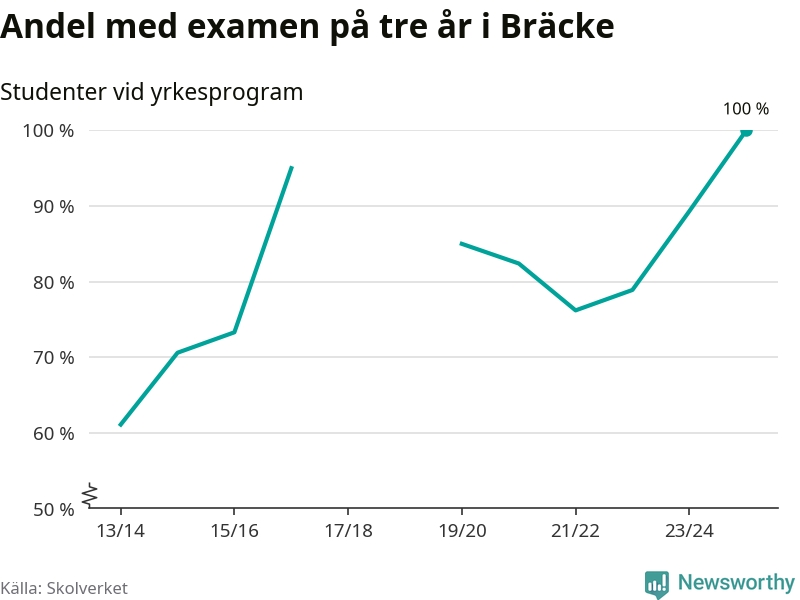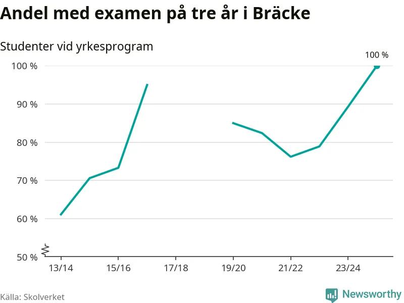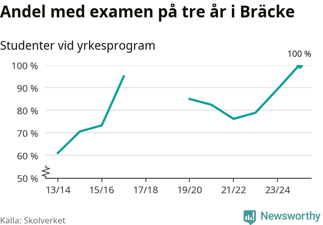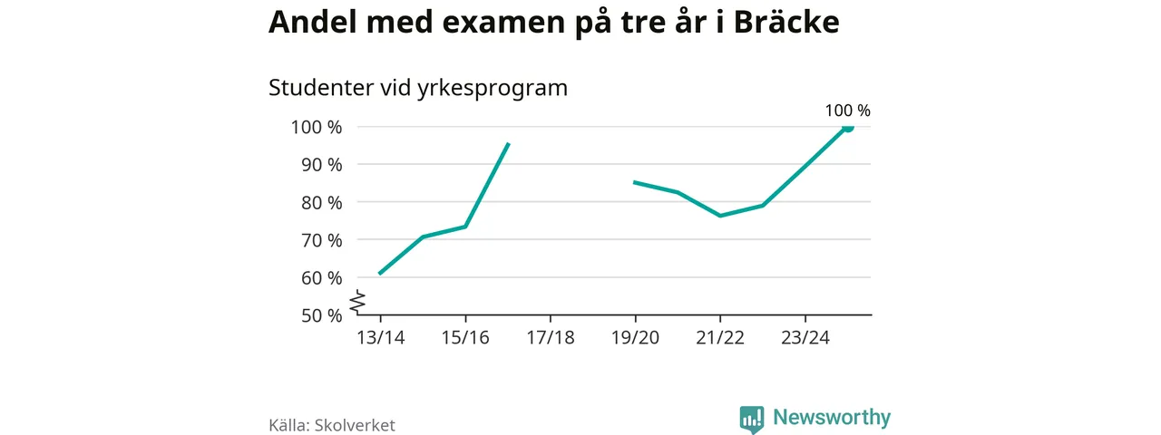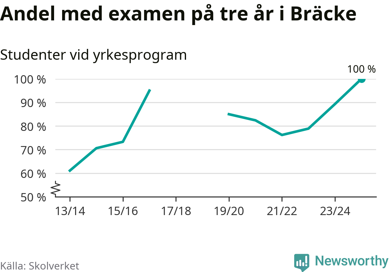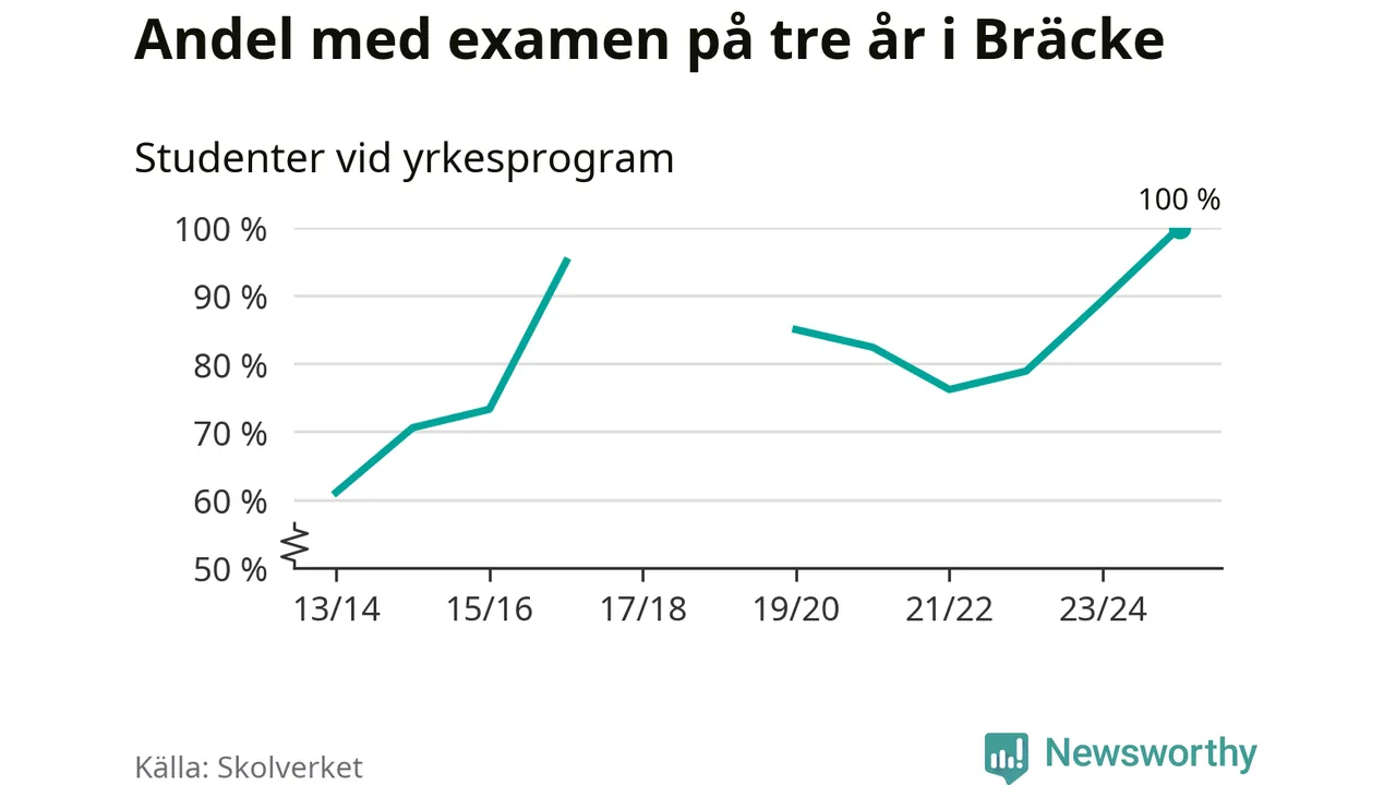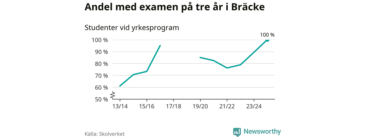Alla 22 elever som började på Jämtlands Gymn, Bräcke 2022/23 klarade alltså examen på tre år i våras. Det är ganska ovanligt, i hela landet var det bara 48 skolenheter där alla yrkeselever klarade examen, medan alla elever på högskoleförberedande program fick examen på totalt tio skolenheter.