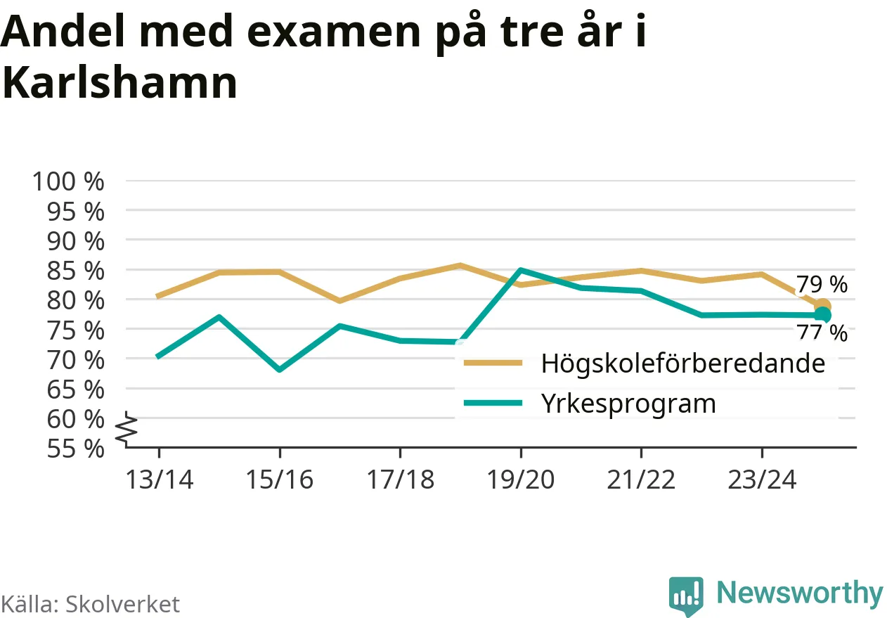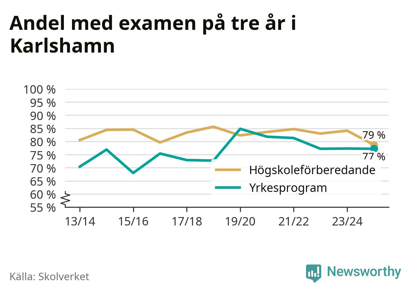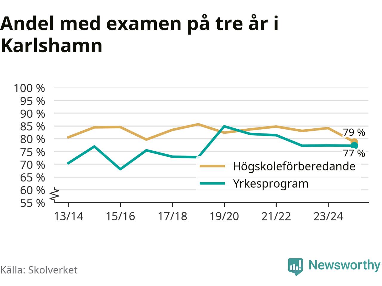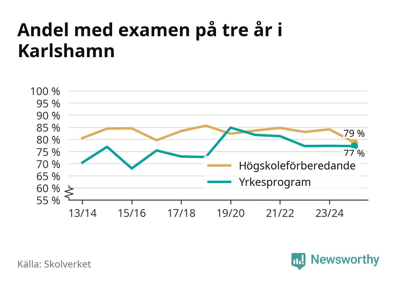 Inte sedan åtminstone läsåret 2013/14 har andelen elever som klarade gymnasieexamen på högskoleförberedande program varit lägre i Karlshamn. Det visar Skolverkets statistik.