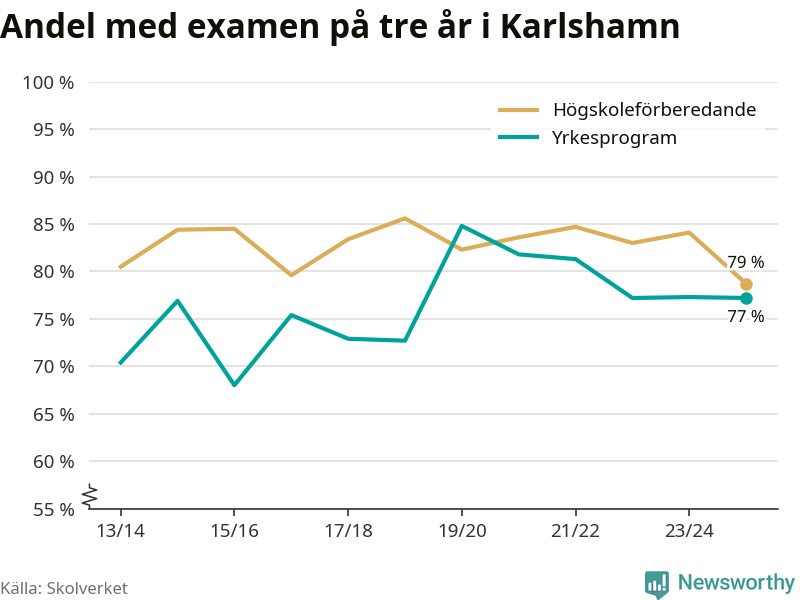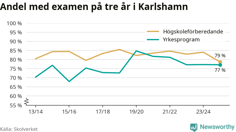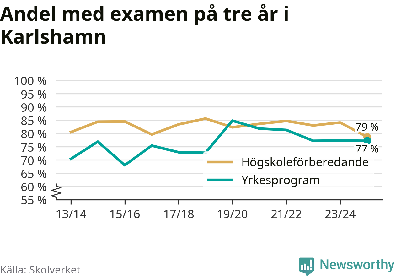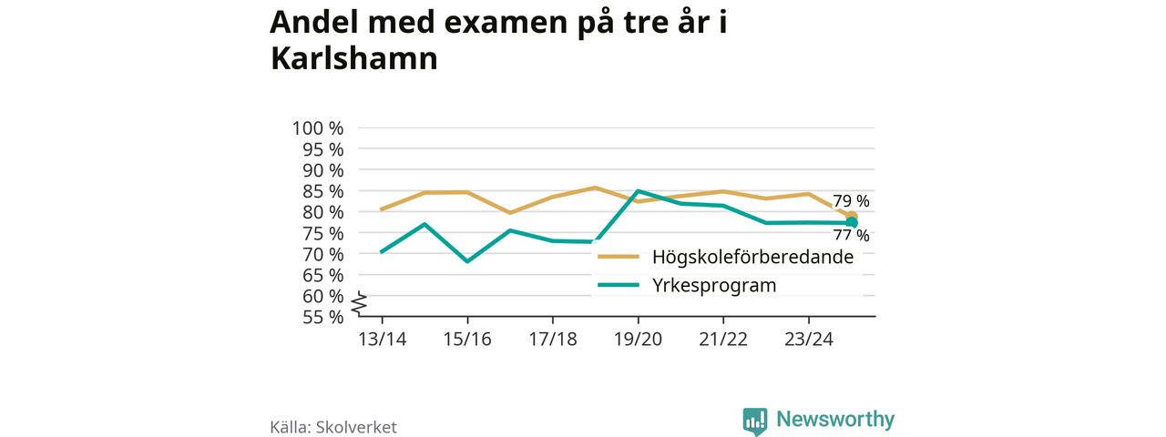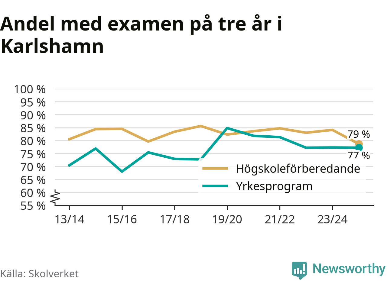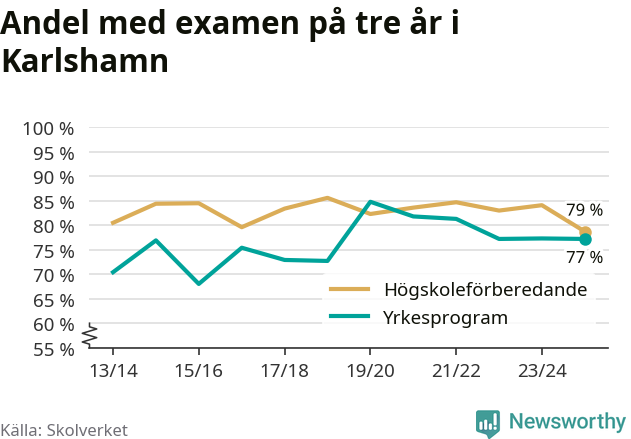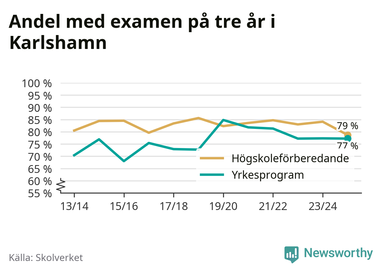 Inte sedan åtminstone läsåret 2013/14 har andelen elever som klarade gymnasieexamen på högskoleförberedande program varit lägre i Karlshamn. Det visar Skolverkets statistik.