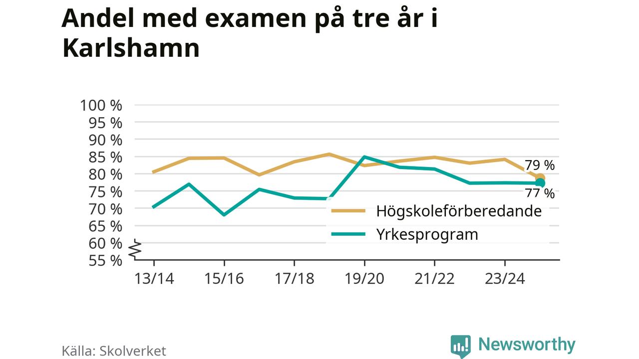 Högst andel som klarade examen i Karlshamns kommun, de nationella programmen sammantaget, fanns på Fria Läroverken i Karlshamn, där eleverna läser på ekonomiprogrammet eller samhällsvetenskapsprogrammet. Där klarade 85 procent av de 33 elever som började gymnasiet 2022/23 examen i våras. Det är en högre siffra än i riket som helhet.