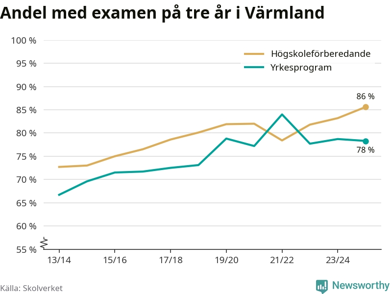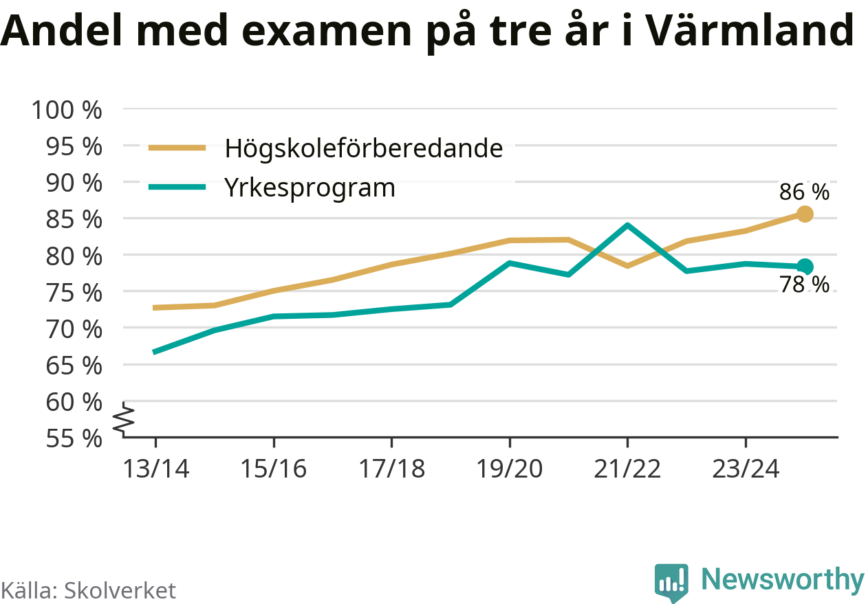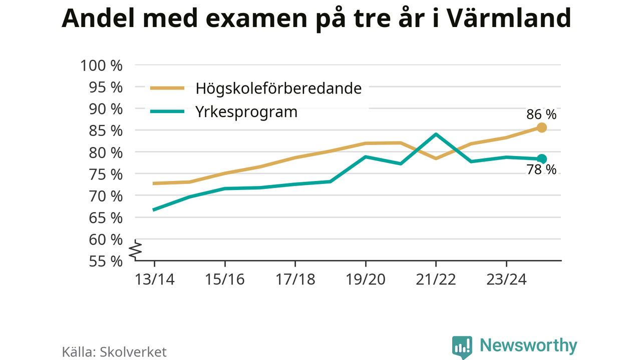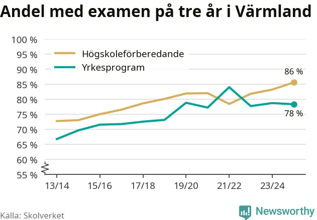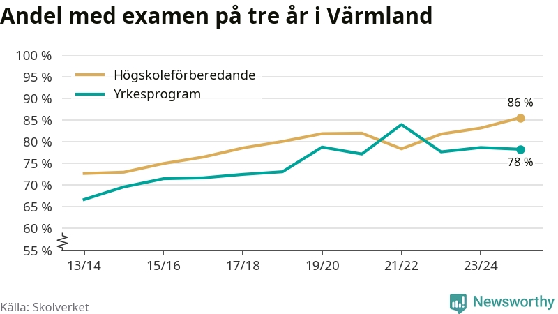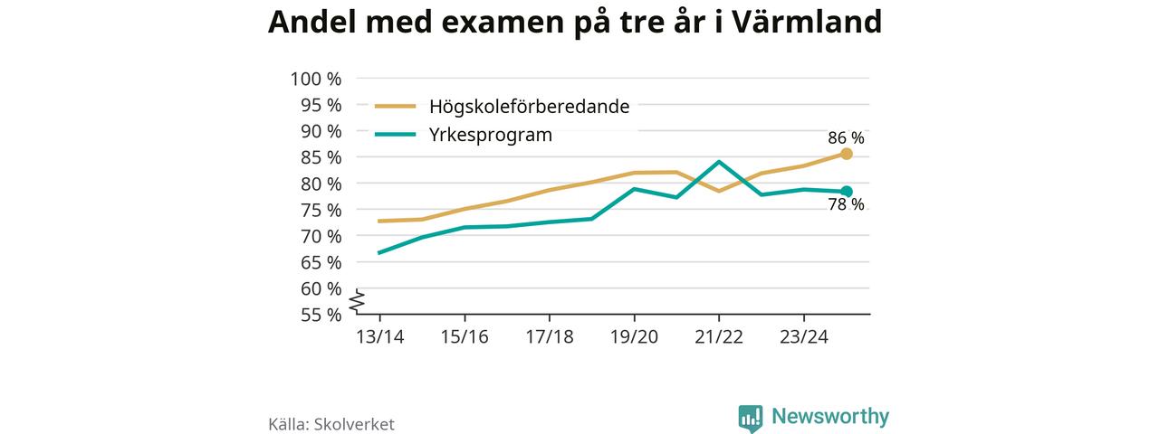 Inte sedan åtminstone läsåret 2013/14 har andelen elever som klarat gymnasieexamen på högskoleförberedande program varit högre i Värmland. Det visar Skolverkets senaste statistik.