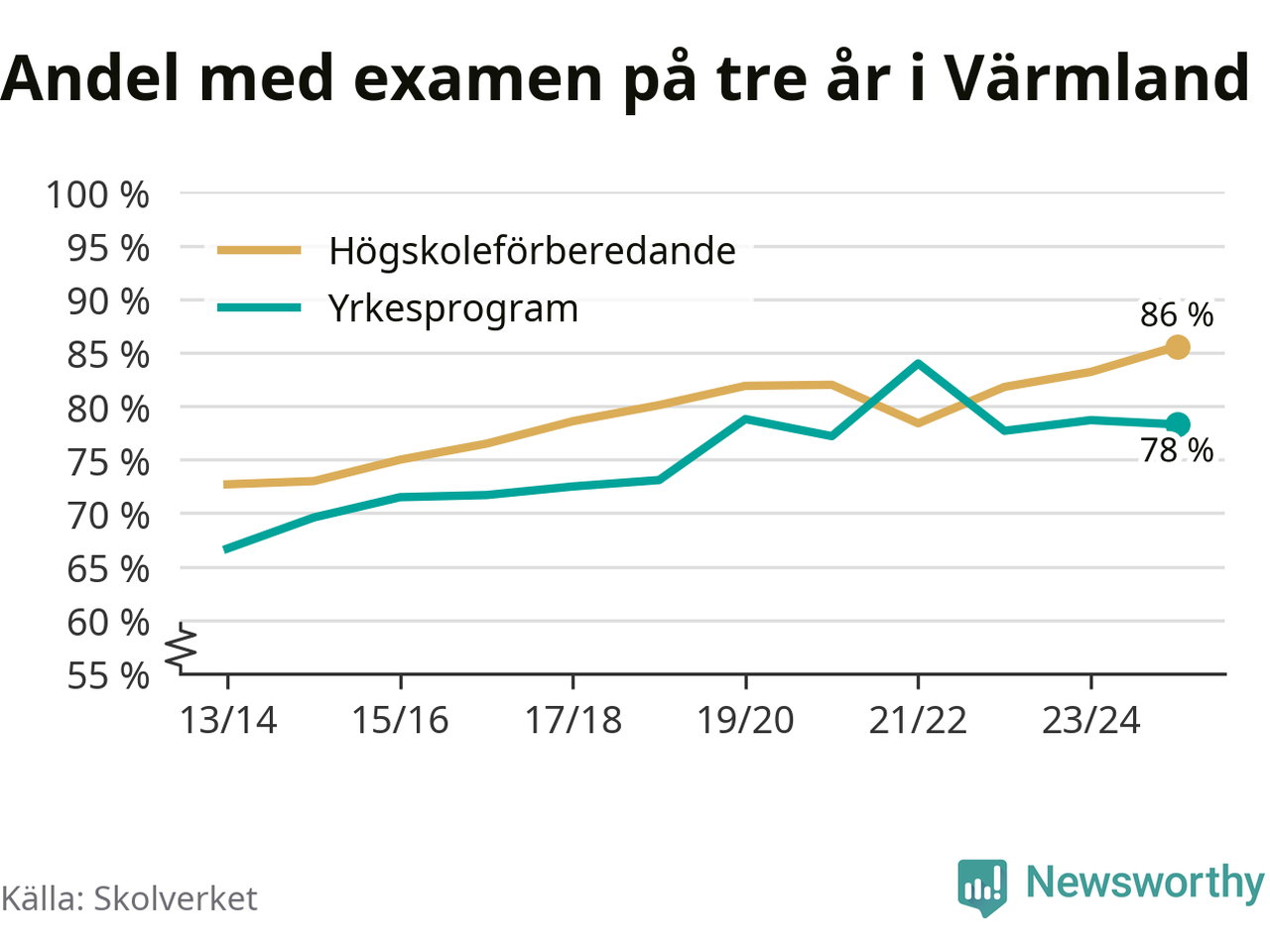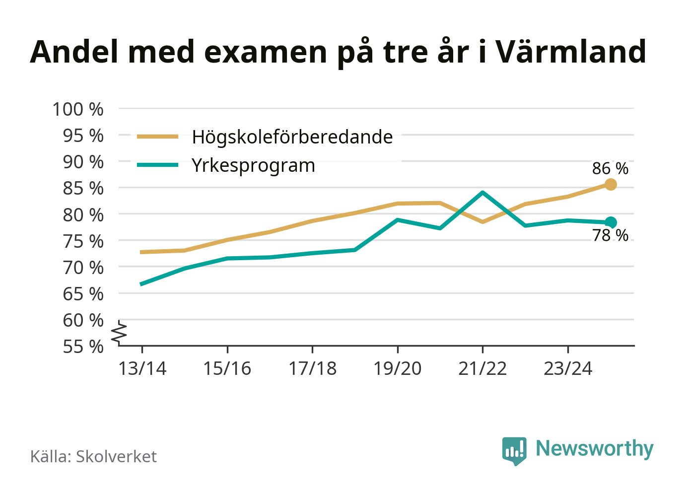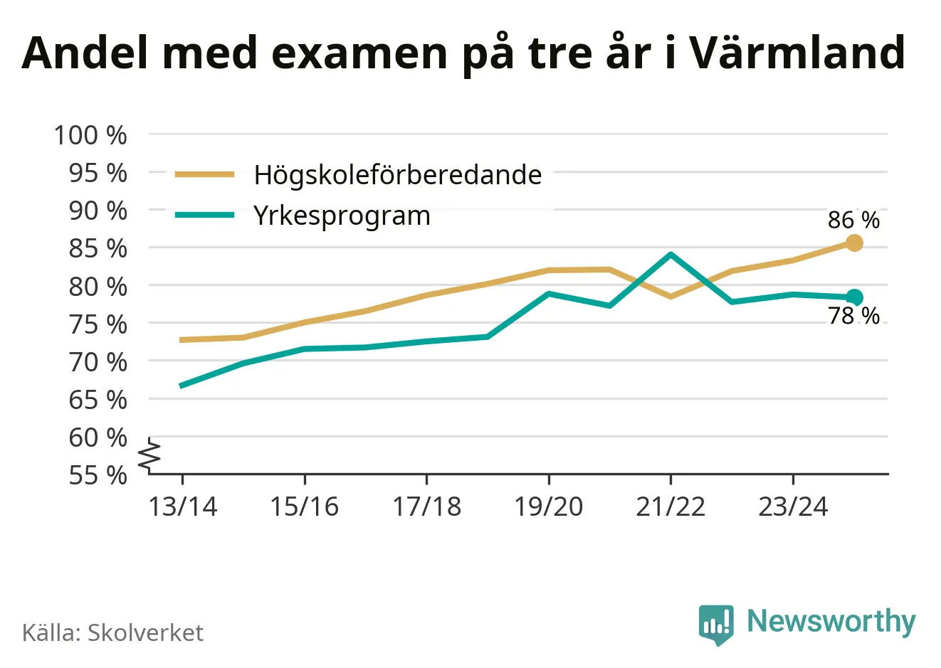 Inte sedan åtminstone läsåret 2013/14 har andelen elever som klarat gymnasieexamen på högskoleförberedande program varit högre i Värmland. Det visar Skolverkets senaste statistik.