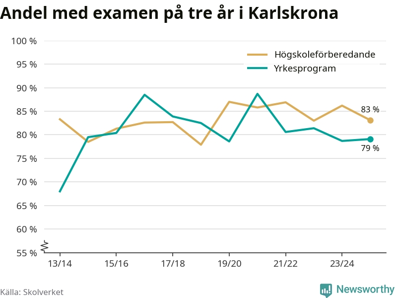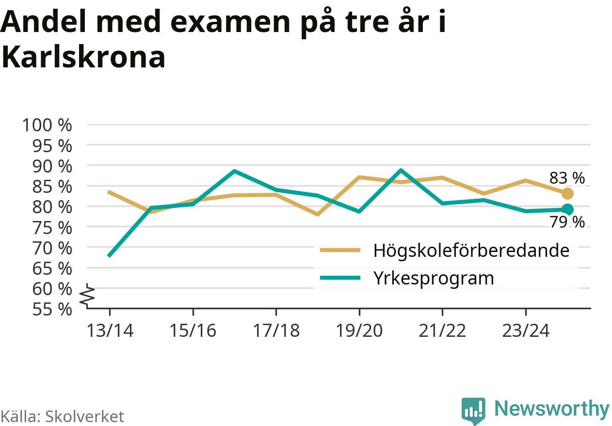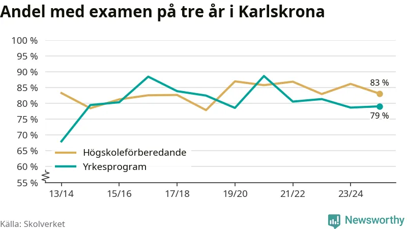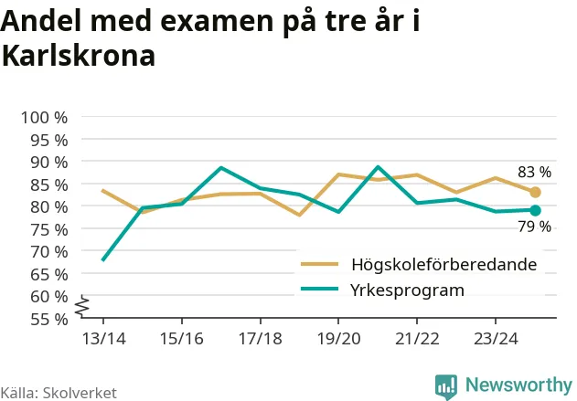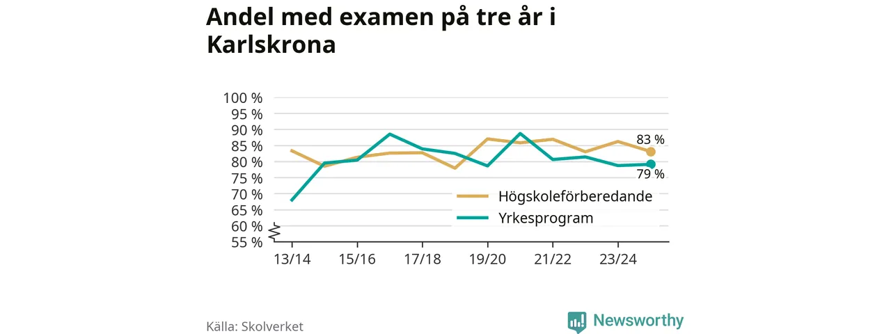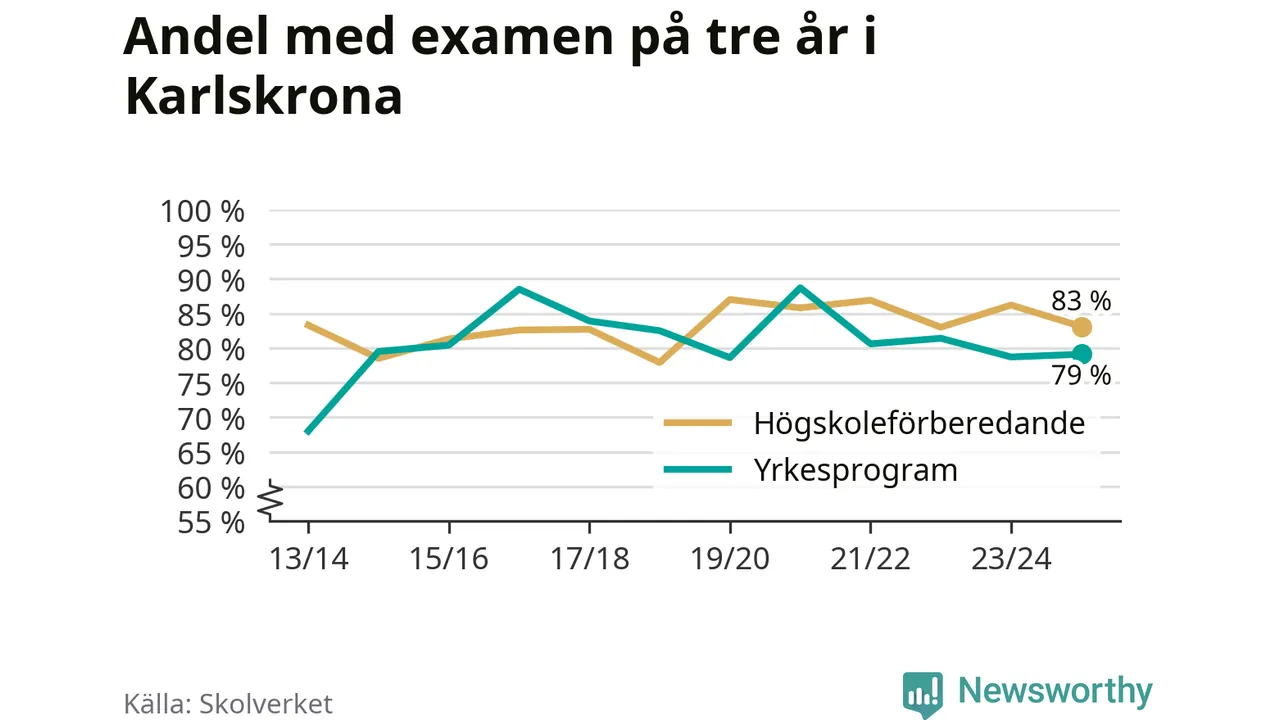 Medan andelen elever som klarade gymnasieexamen på de högskoleförberedande programmen ökade i riket som helhet, minskade andelen i Karlskrona. Här är resultaten – skola för skola.