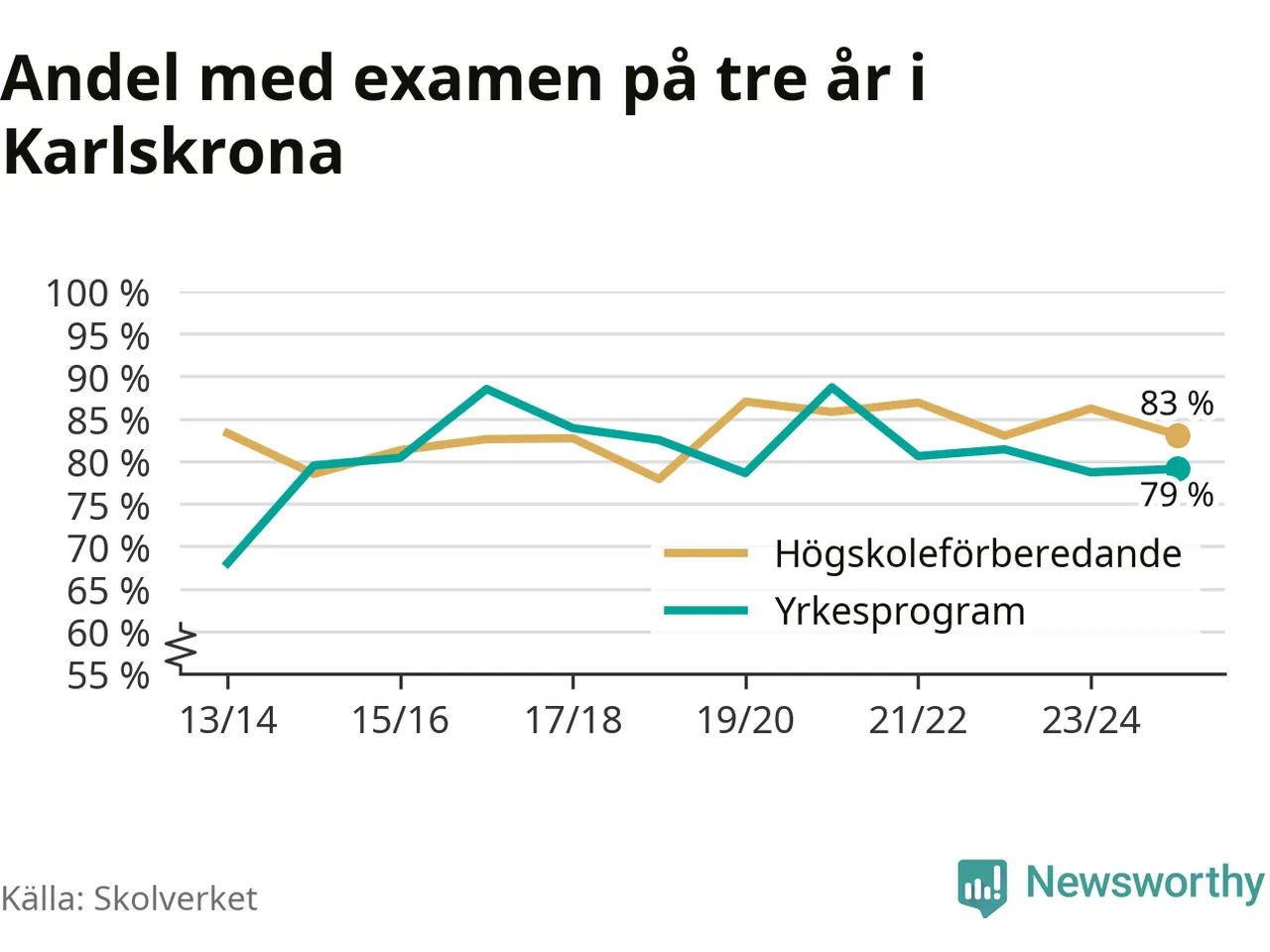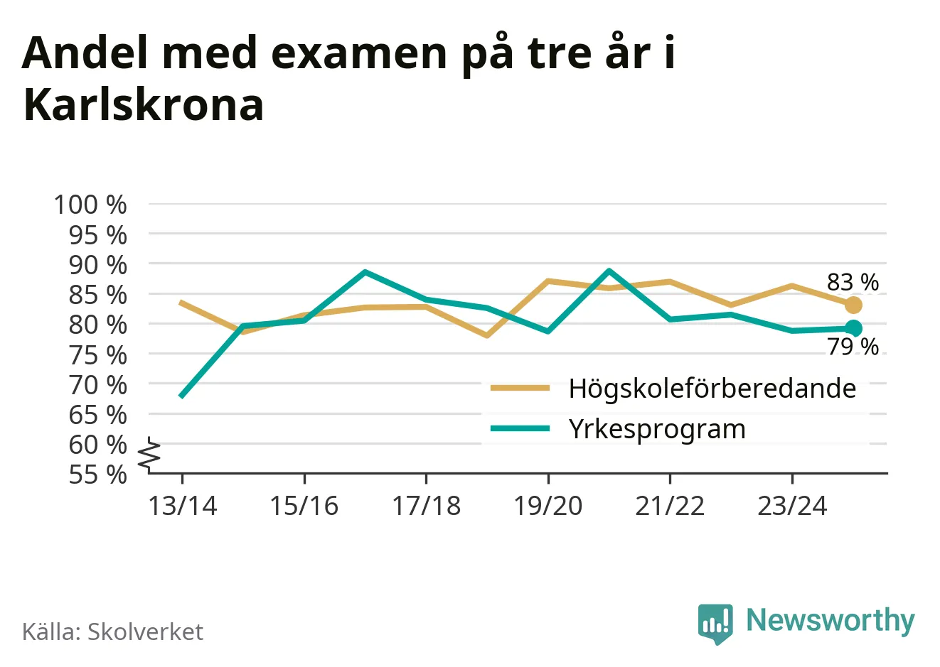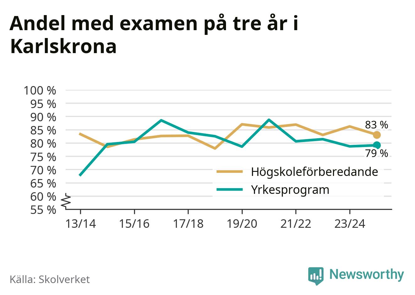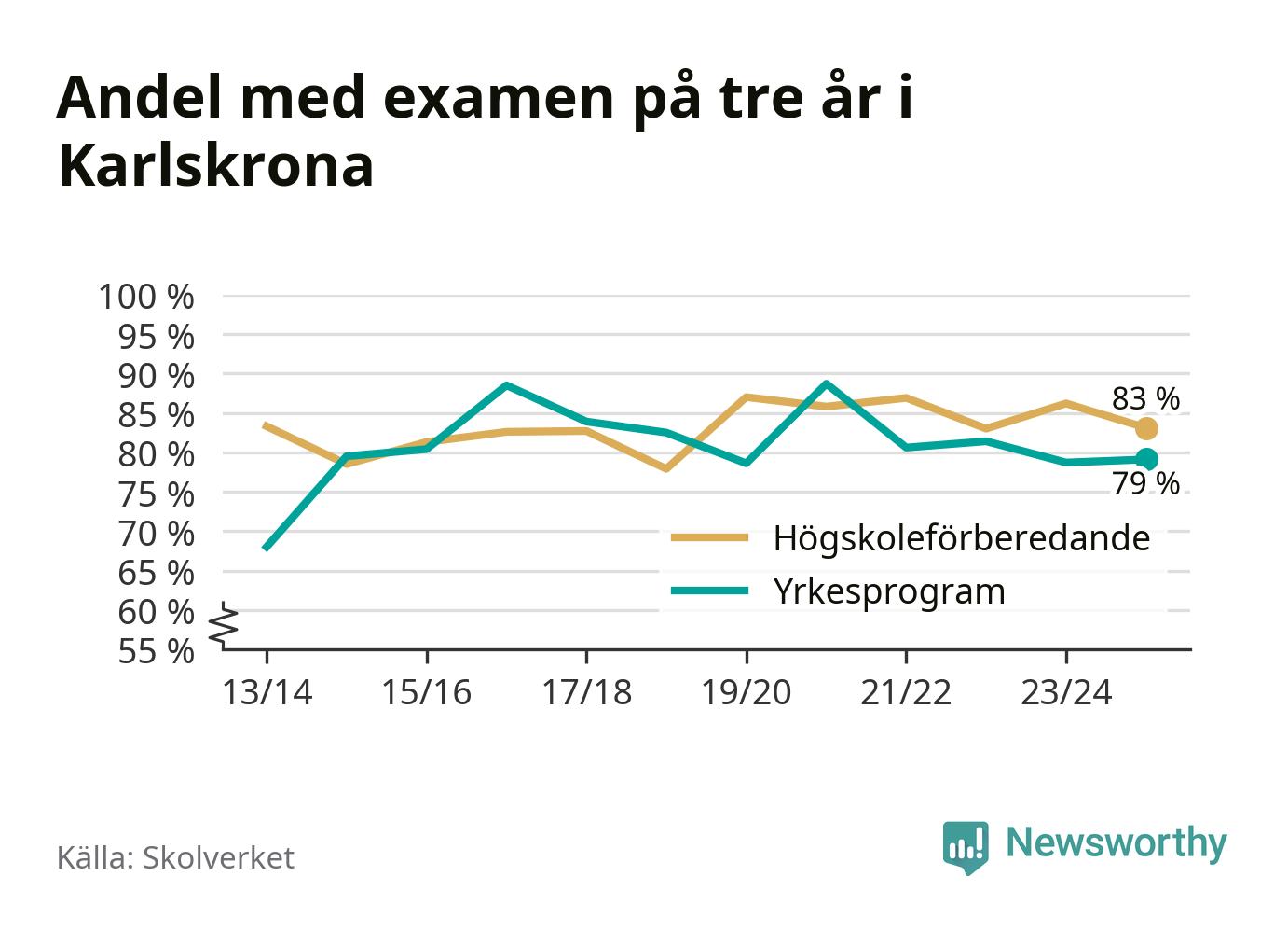 | Ehrensvärdska gymnasiet | Karlskrona | 77 % (−8 %) | 86 % (+3 %) |