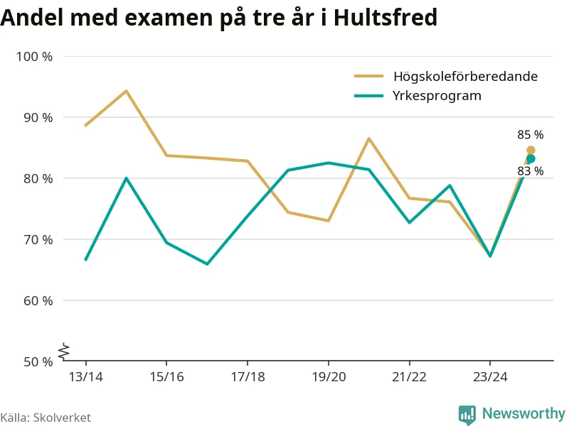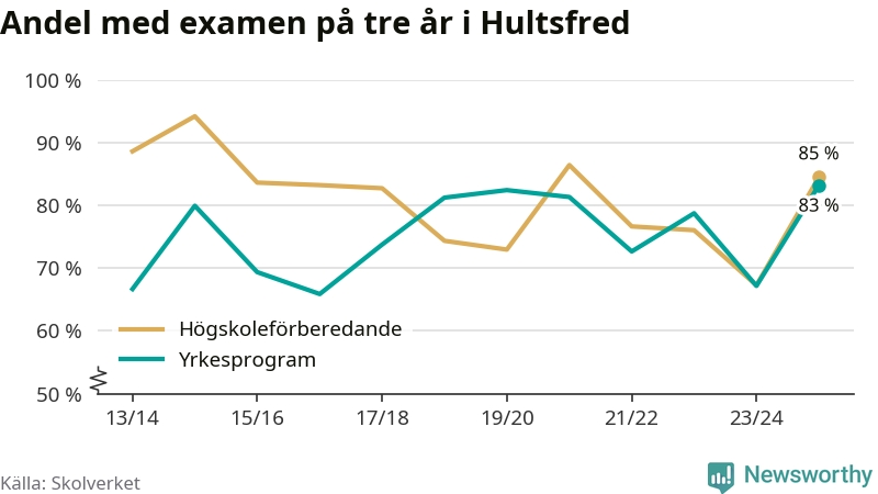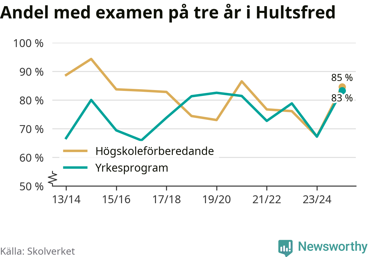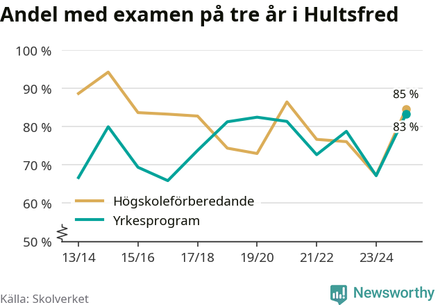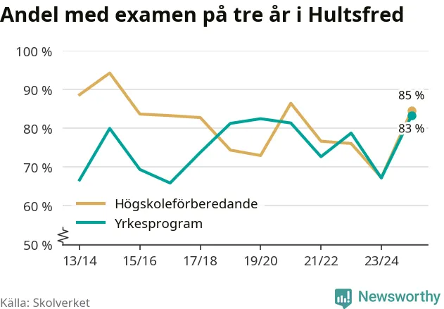 Inte sedan åtminstone läsåret 2013/14 har andelen elever som klarat gymnasieexamen på yrkesprogram varit högre i Hultsfred. Det visar Skolverkets senaste statistik.