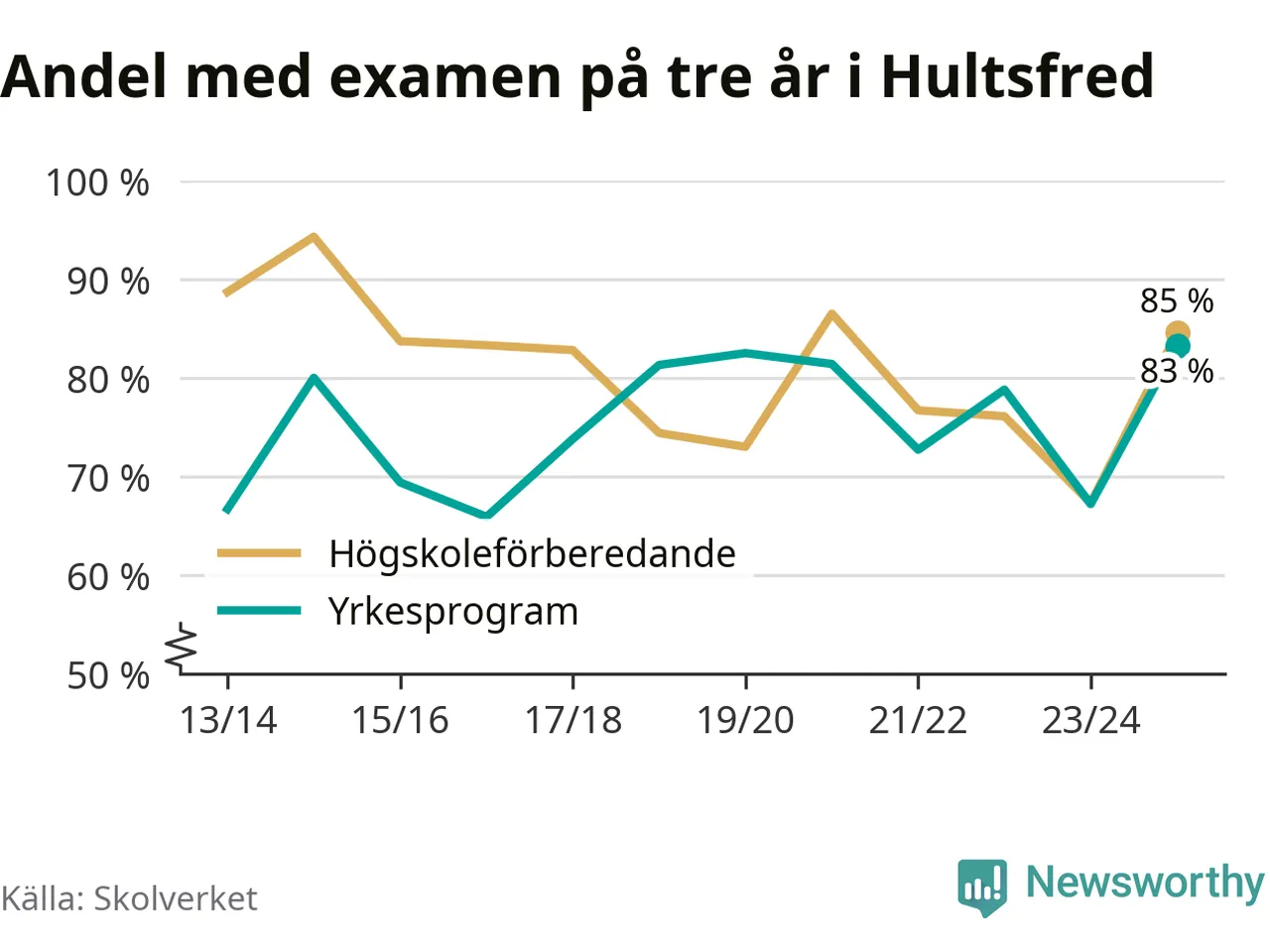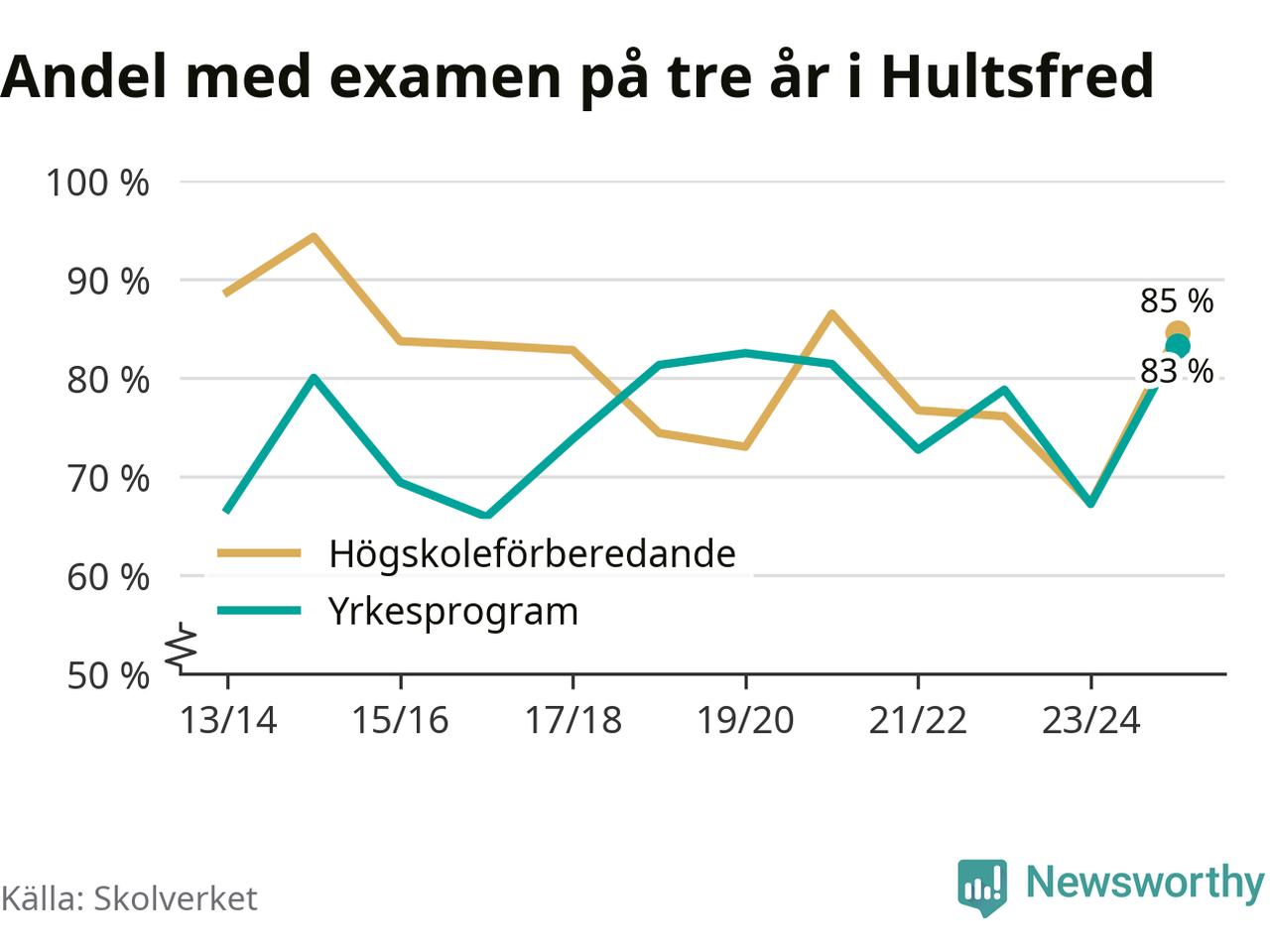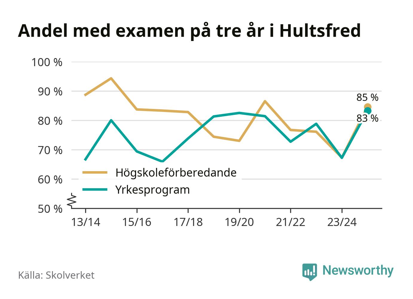 Högst andel som klarade examen i Hultsfreds kommun, de nationella programmen sammantaget, fanns på Hultsfreds gymnasium 2, där eleverna läser på ekonomiprogrammet. Där klarade 93 procent av de 29 elever som började gymnasiet 2022/23 examen i våras. Det är en högre siffra än i riket som helhet.