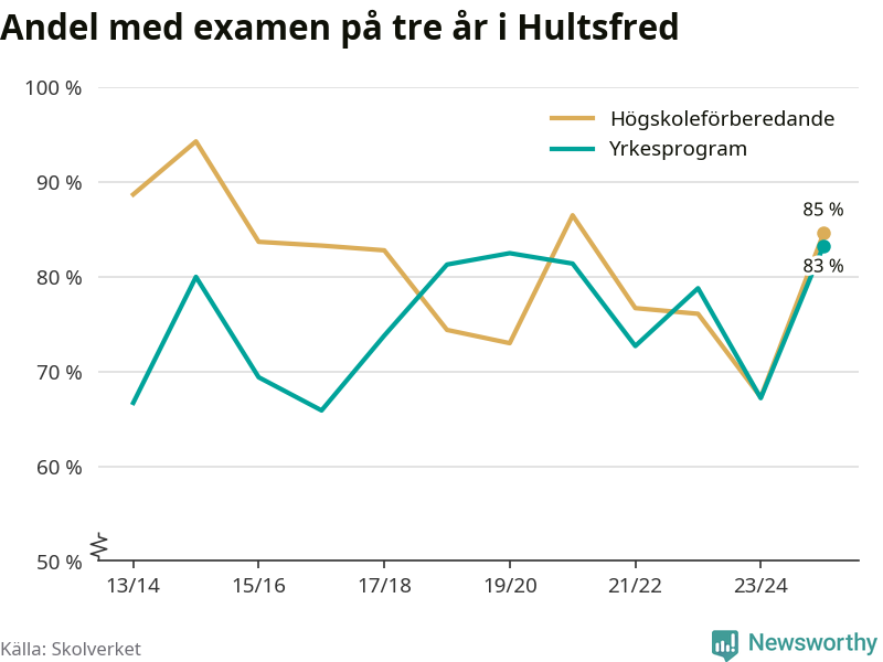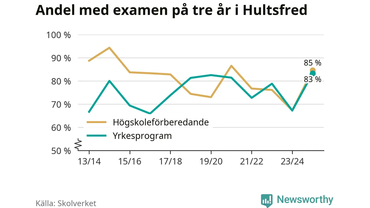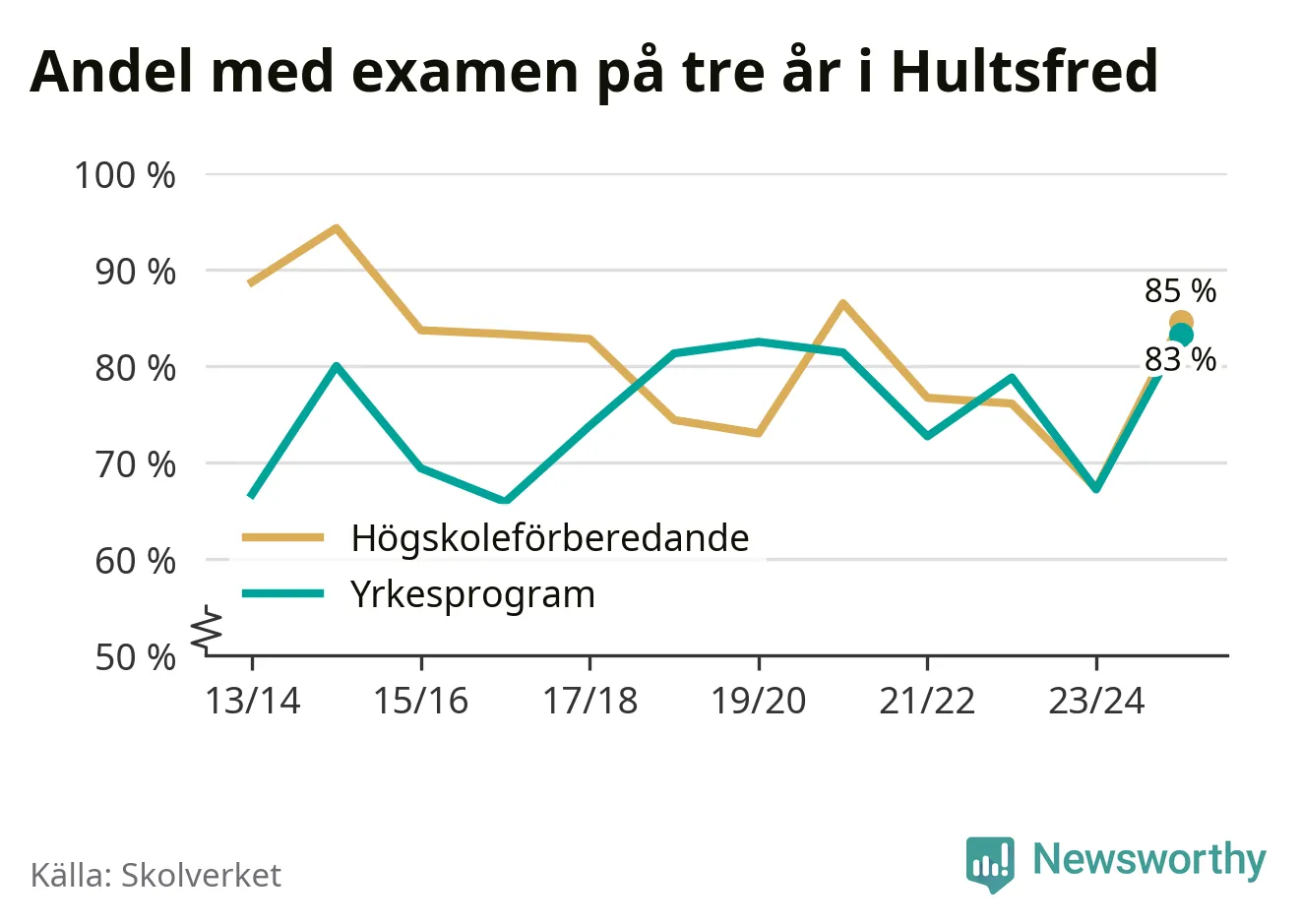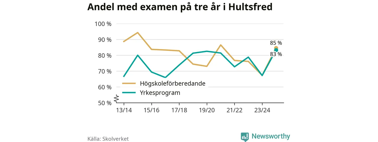 Högst andel som klarade examen i Hultsfreds kommun, de nationella programmen sammantaget, fanns på Hultsfreds gymnasium 2, där eleverna läser på ekonomiprogrammet. Där klarade 93 procent av de 29 elever som började gymnasiet 2022/23 examen i våras. Det är en högre siffra än i riket som helhet.