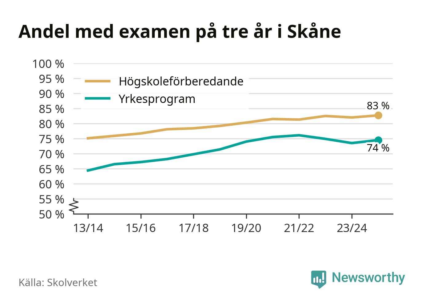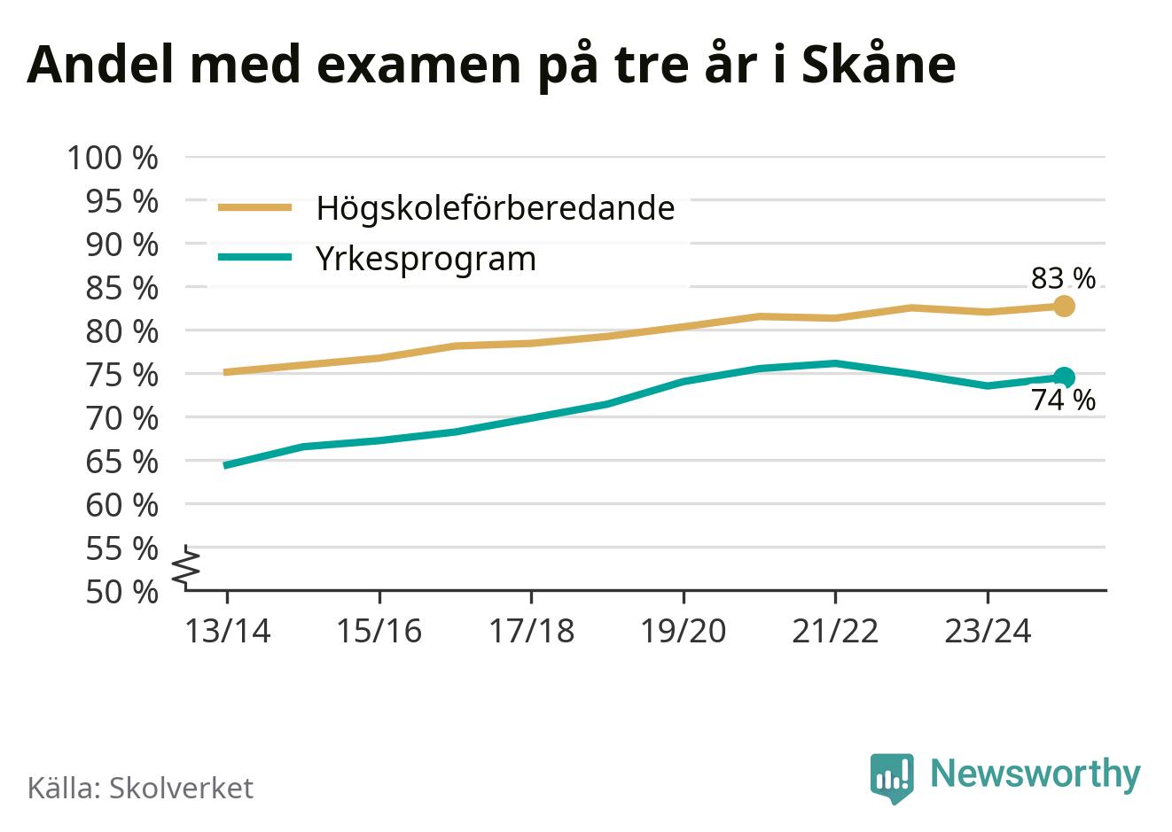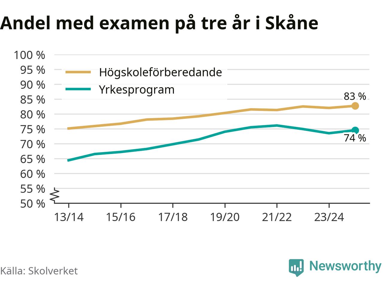 Inte sedan åtminstone läsåret 2013/14 har andelen elever som klarat gymnasieexamen på högskoleförberedande program varit högre i Skåne. Det visar Skolverkets senaste statistik.