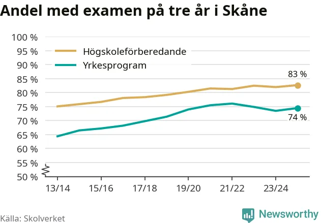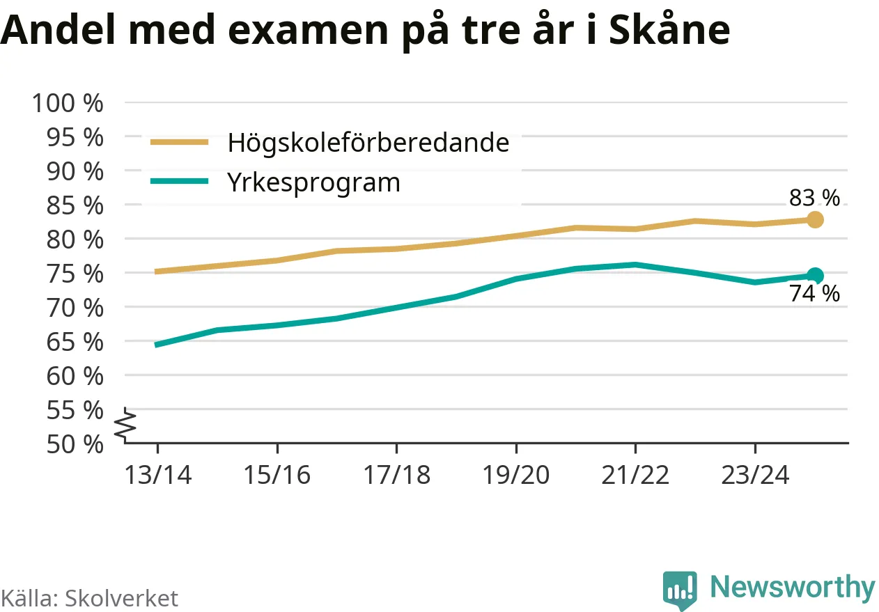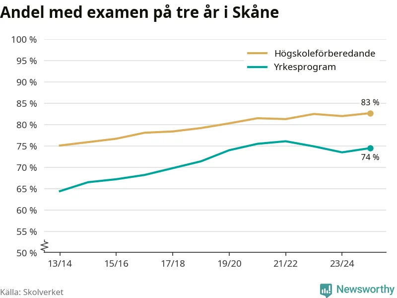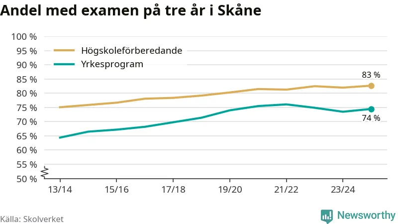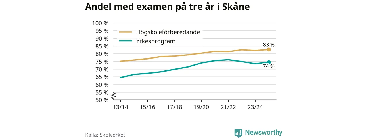 Inte sedan åtminstone läsåret 2013/14 har andelen elever som klarat gymnasieexamen på högskoleförberedande program varit högre i Skåne. Det visar Skolverkets senaste statistik.