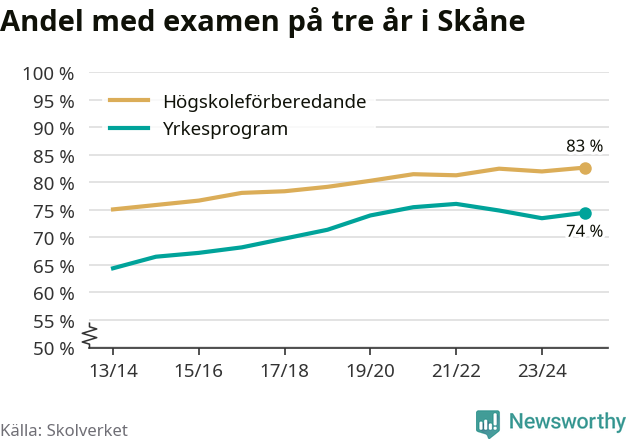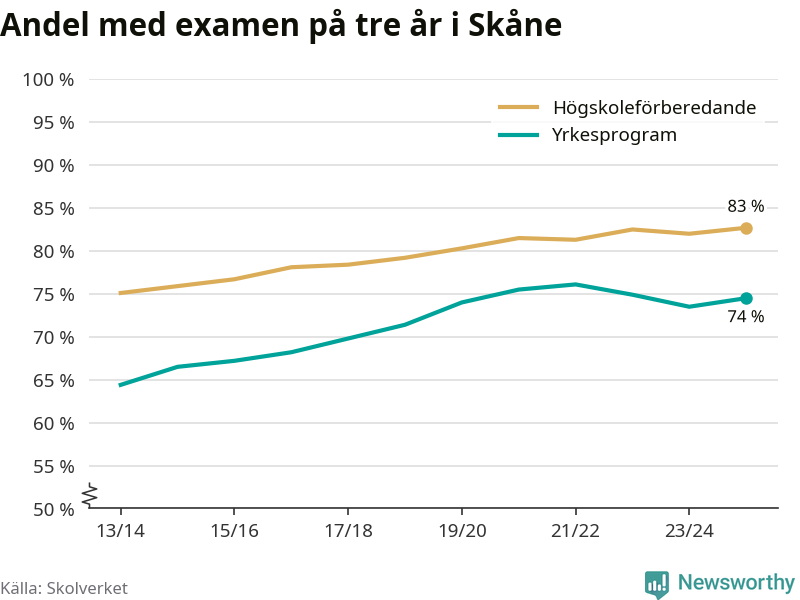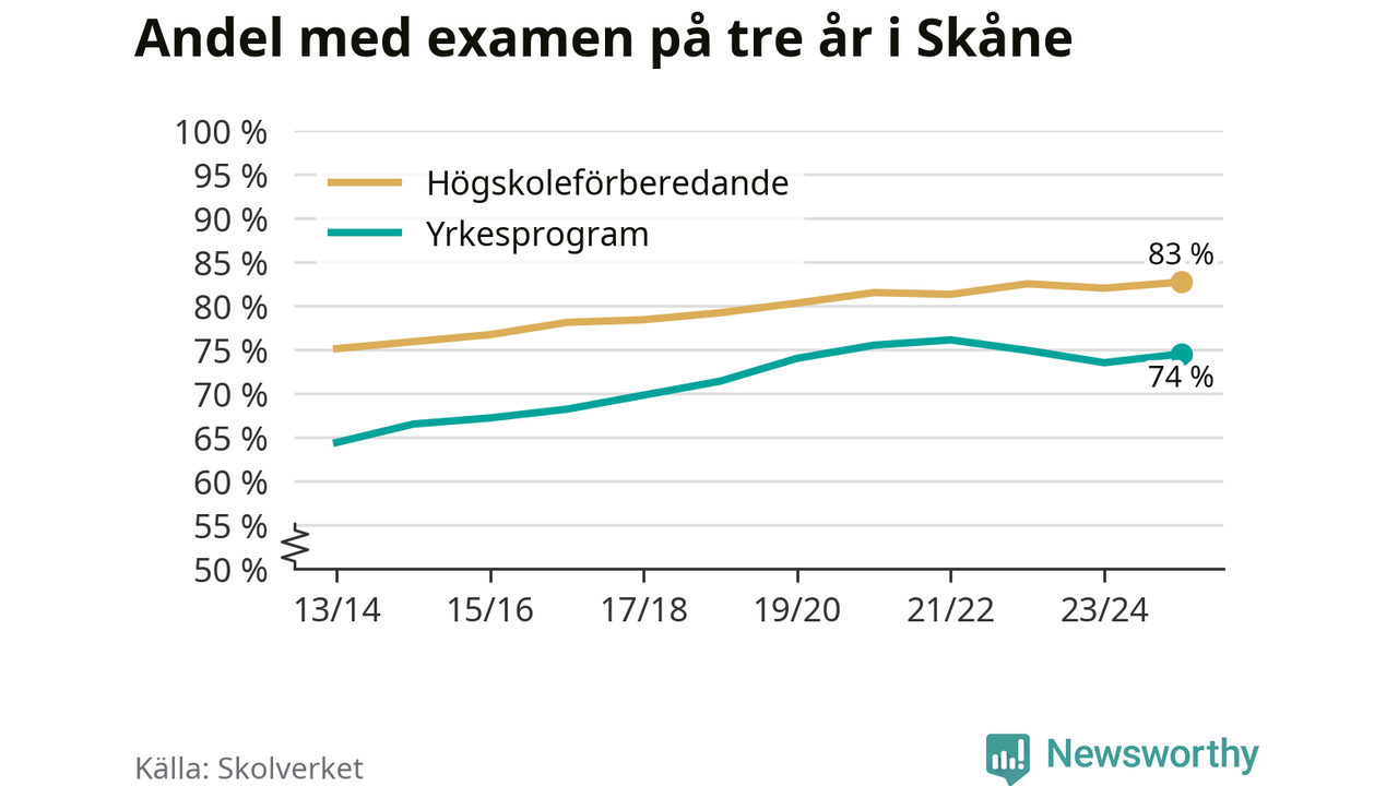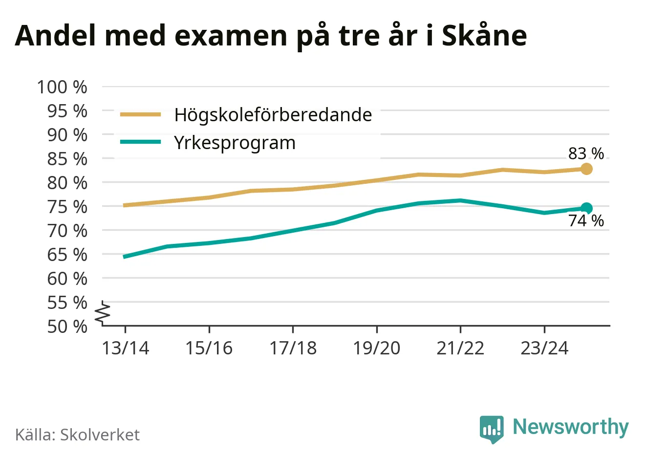 Bland deras kamrater på högskoleförberedande program hade 83 procent klarat examen på tre år – vilket är en procentenhet mer än året innan. Det är den högsta andelen sedan åtminstone läsåret 2013/14.