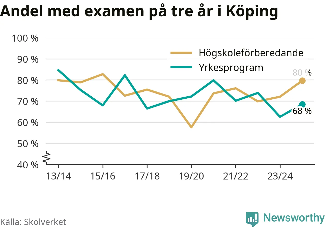 I riket som helhet ökade andelen som tog gymnasieexamen på tre år, både för högskoleförberedande och yrkesprogram. I våras var det 82,6 respektive 75,9 procent som klarade examen på tre år.