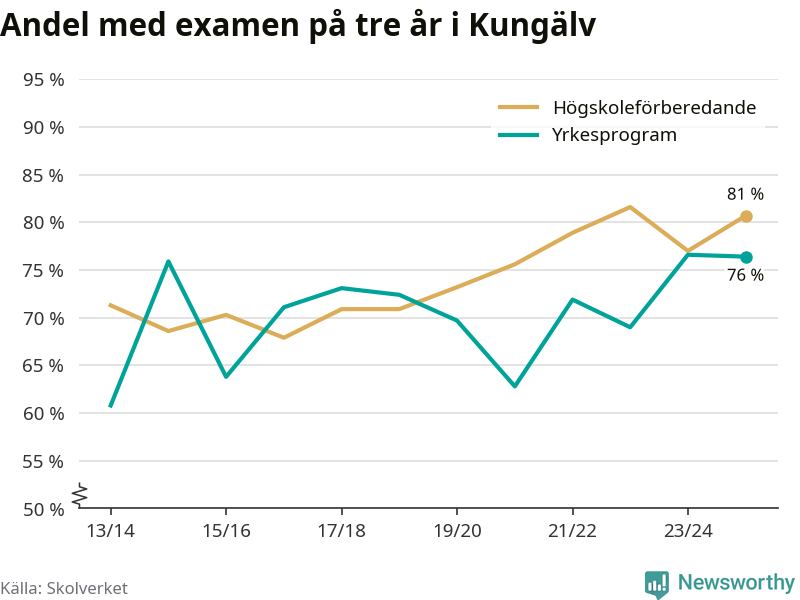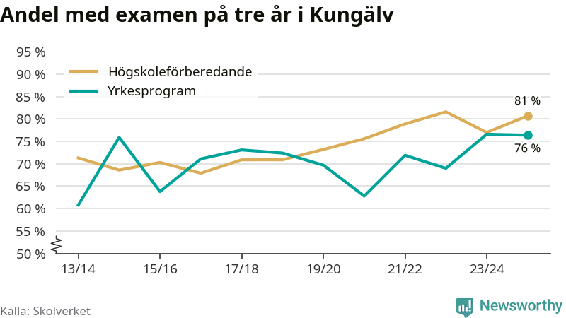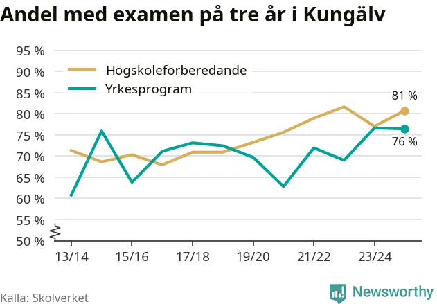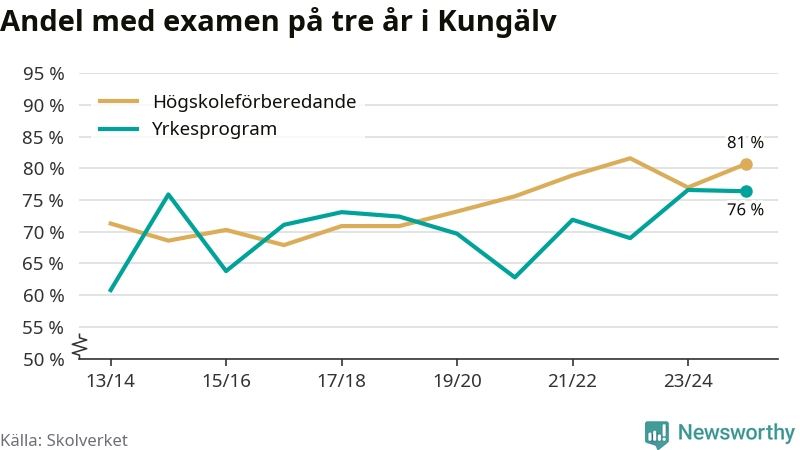 När eleverna på de yrkesförberedande programmen i Kungälvs kommun sprang ut i våras hade 76 procent klarat gymnasieexamen på tre år. Det är en procentenhet färre än året innan.