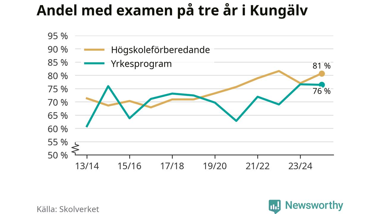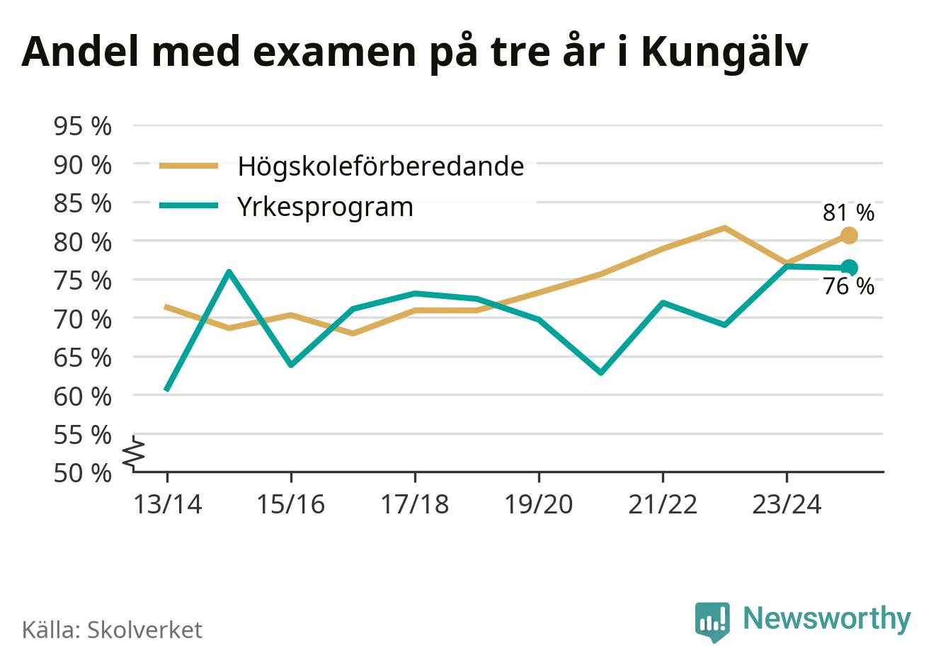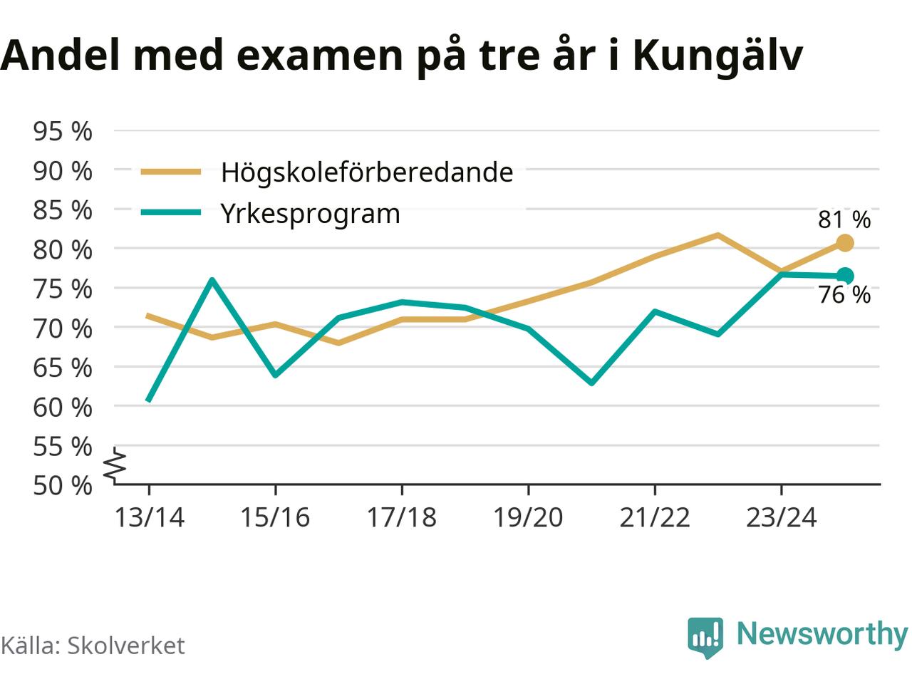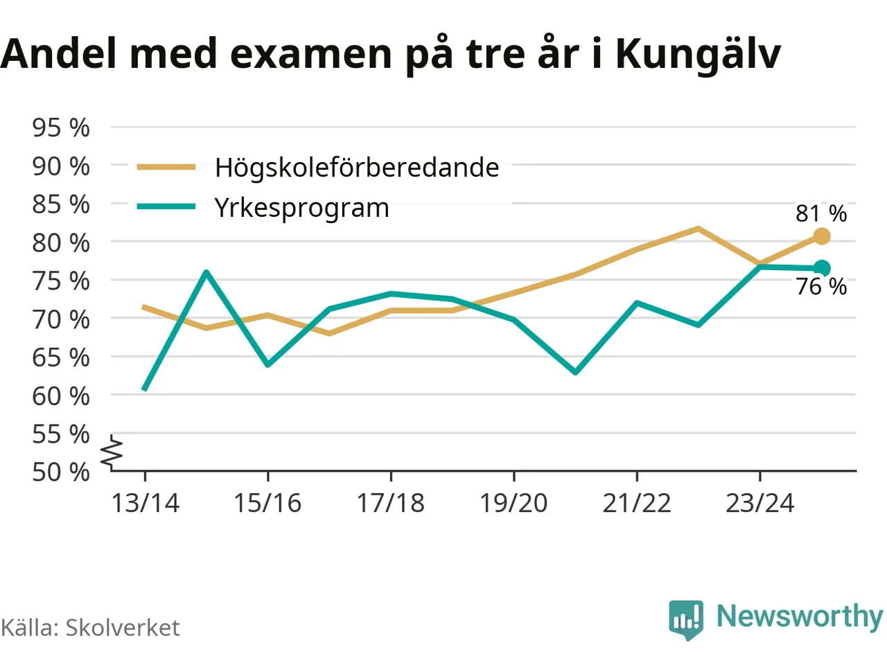 Precis som i riket som helhet ökade andelen i Kungälv som klarade gymnasieexamen på tre år. Här är resultaten – skola för skola.