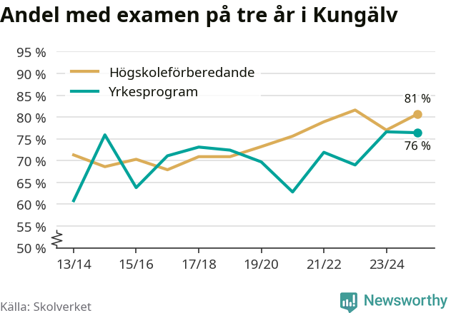 Enligt Skolverket är den främsta anledningen att andelen elever som har avbrutit eller förlängt sina gymnasiestudier minskat. Samtidigt har fler elever på högskoleförberedande program blivit godkända på gymnasiearbetet.