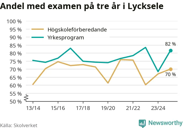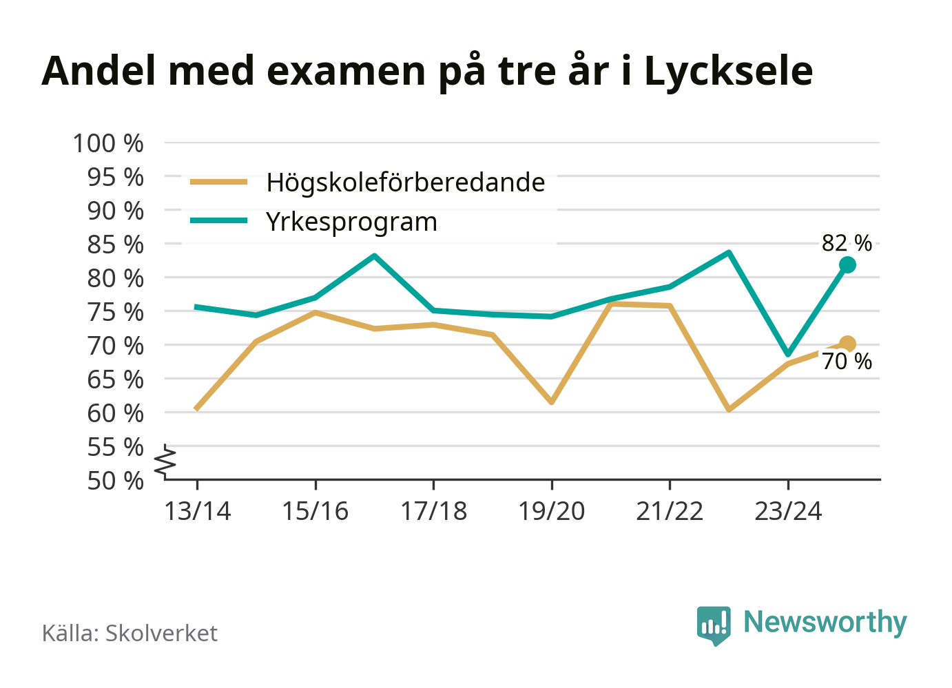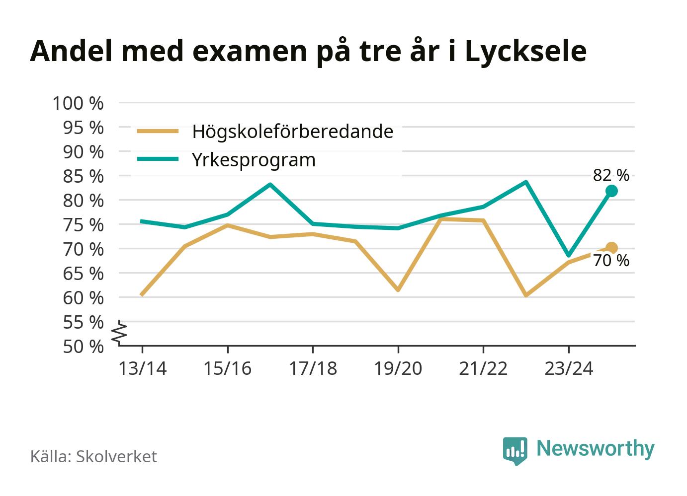 När eleverna på de yrkesförberedande programmen i Lycksele kommun sprang ut i våras hade 82 procent klarat gymnasieexamen på tre år. Det är 14 procentenheter fler än året innan.