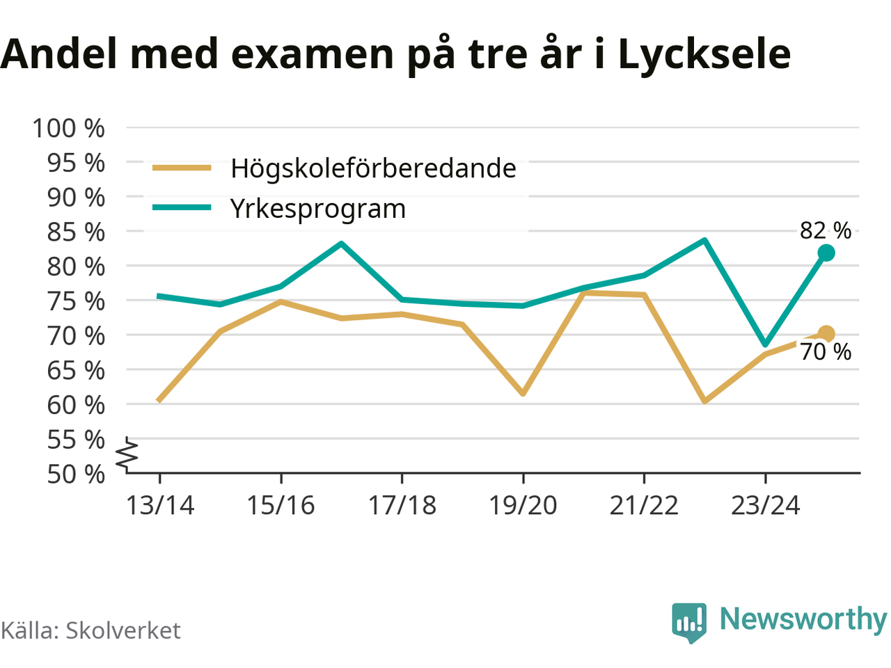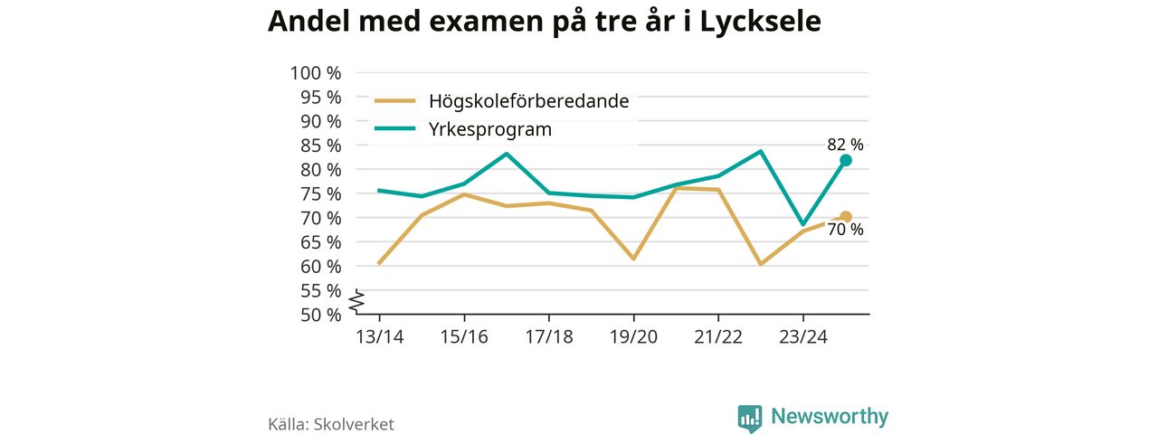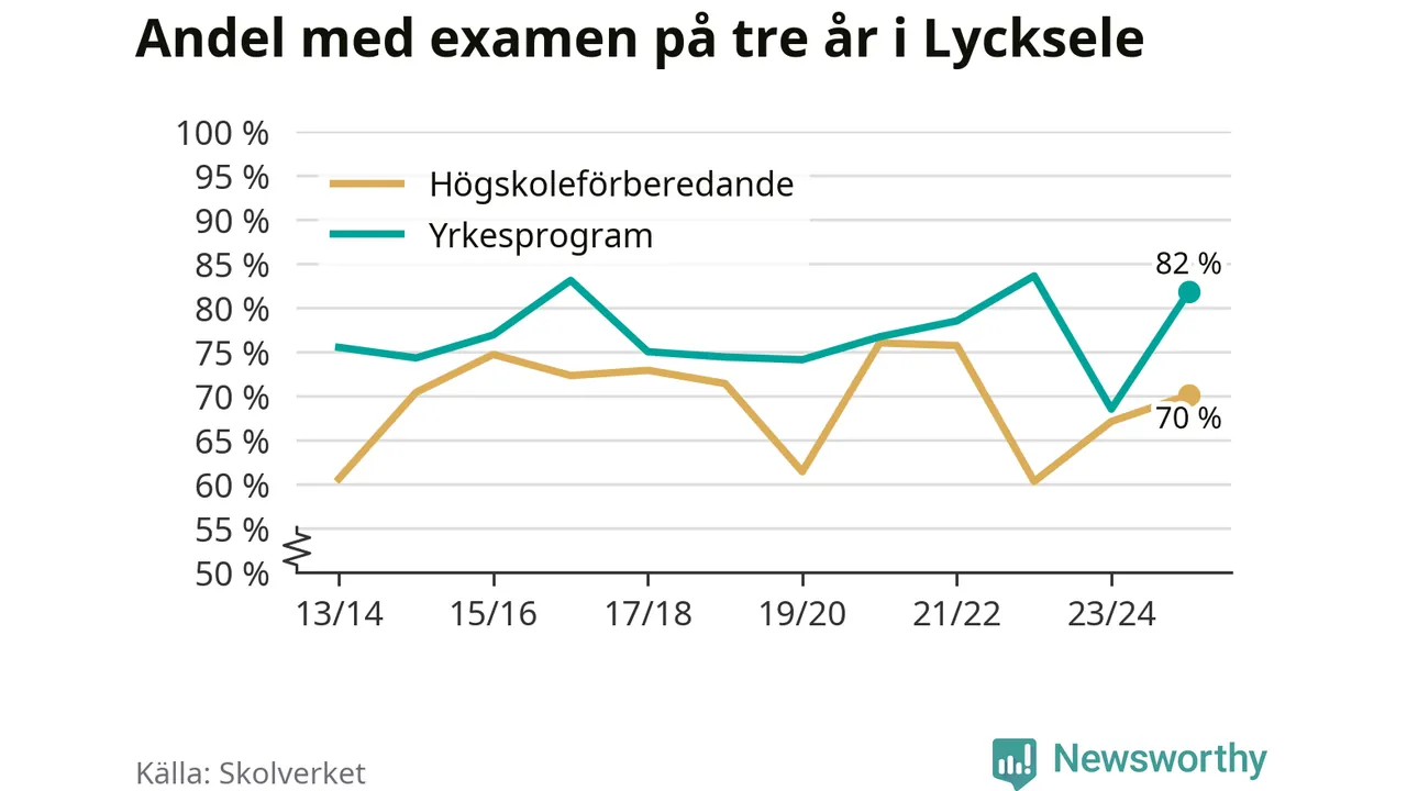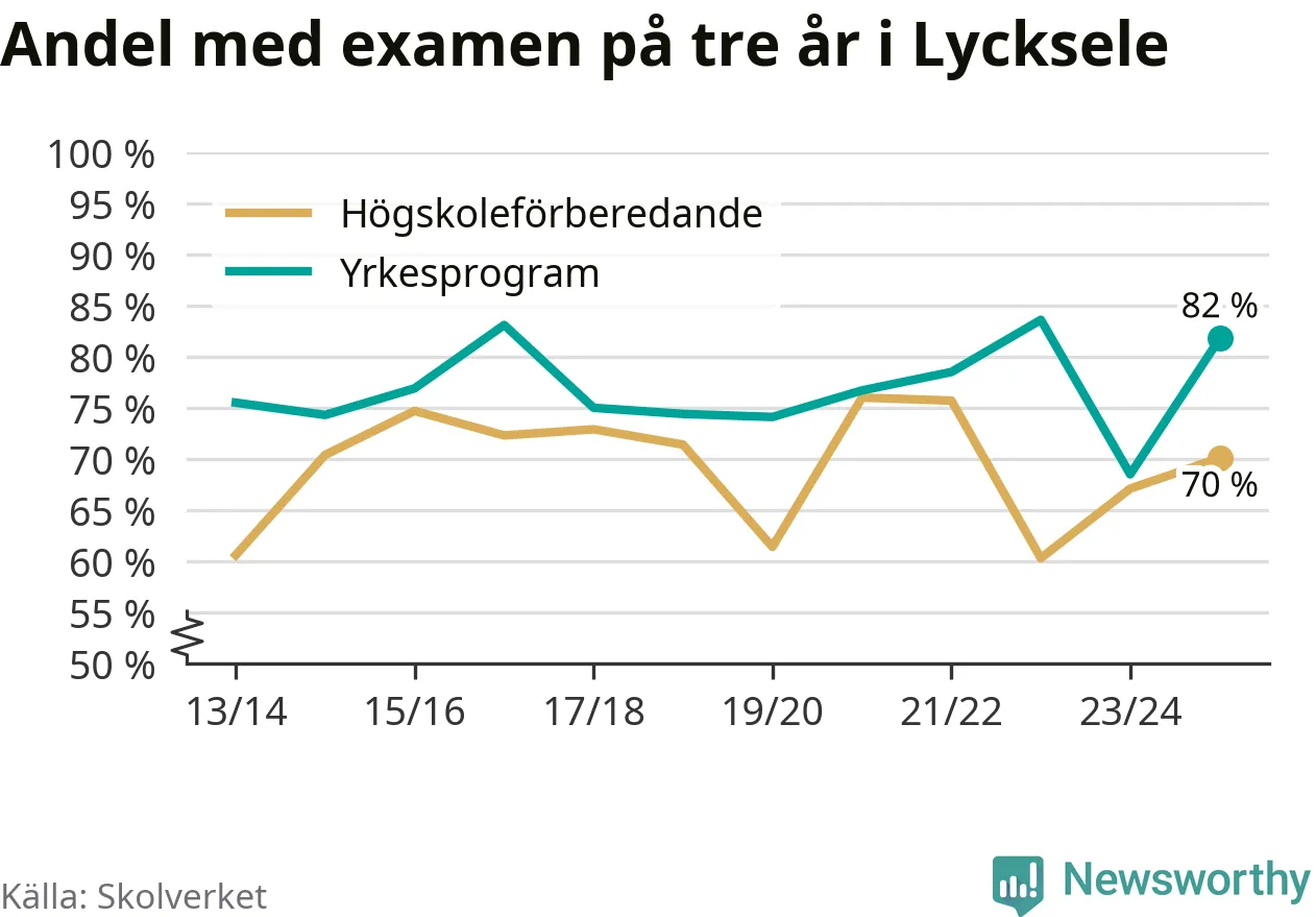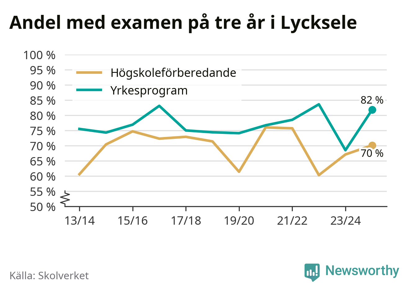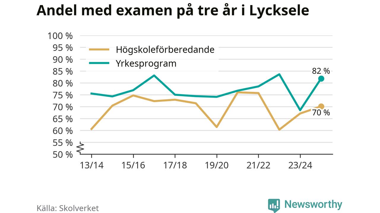 Högst andel som klarade examen i Lycksele kommun, de nationella programmen sammantaget, fanns på Tannbergsskolan 3, där eleverna läser på barn- och fritidsprogrammet eller vård- och omsorgsprogrammet. Där klarade 91 procent av de elva elever som började gymnasiet 2022/23 examen i våras. Det är en högre siffra än i riket som helhet.