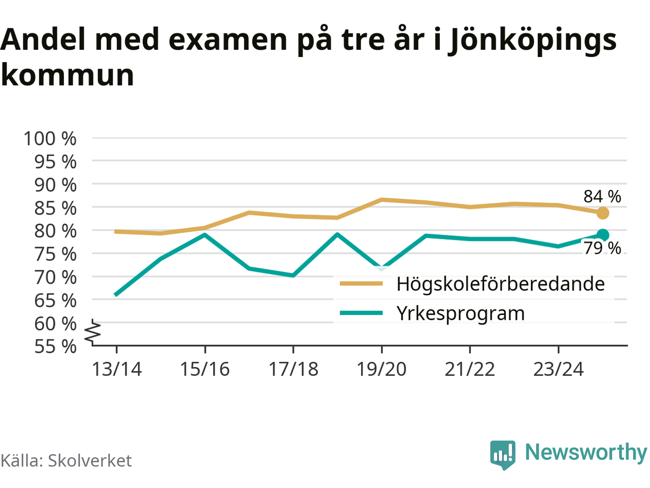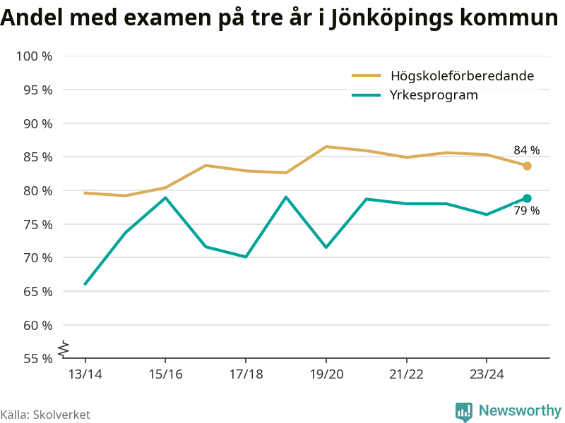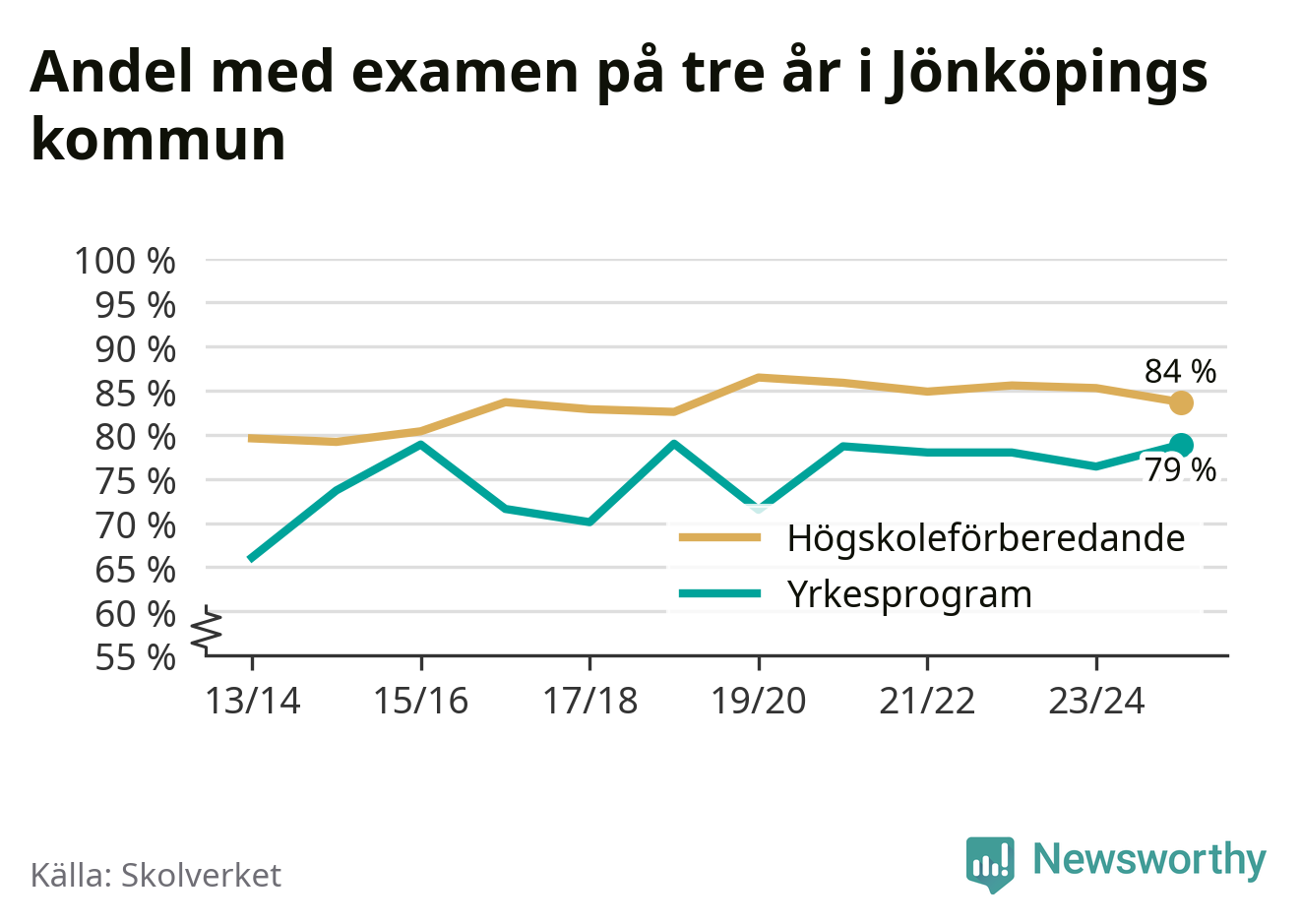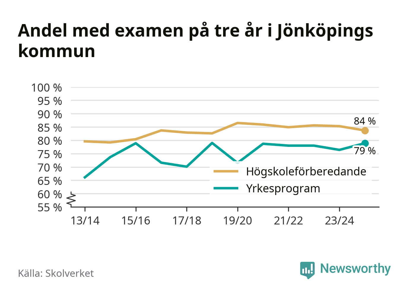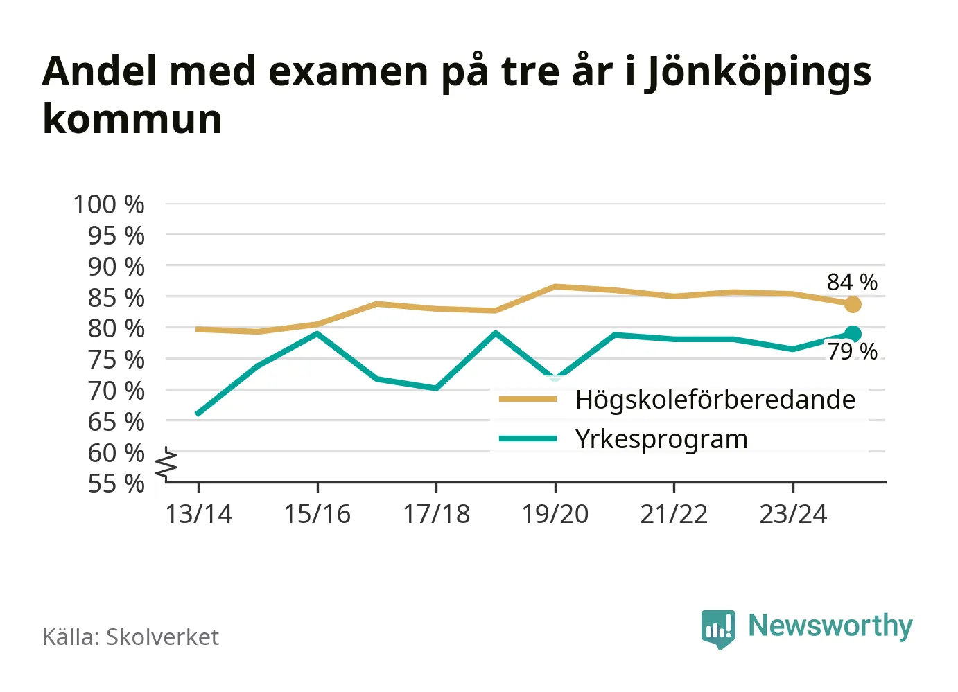 Bland deras kamrater på högskoleförberedande program hade 84 procent klarat examen på tre år – vilket är en procentenhet mindre än året innan. Det är för övrigt den lägsta andelen sedan kullen som tog studenten läsåret 2018/19.