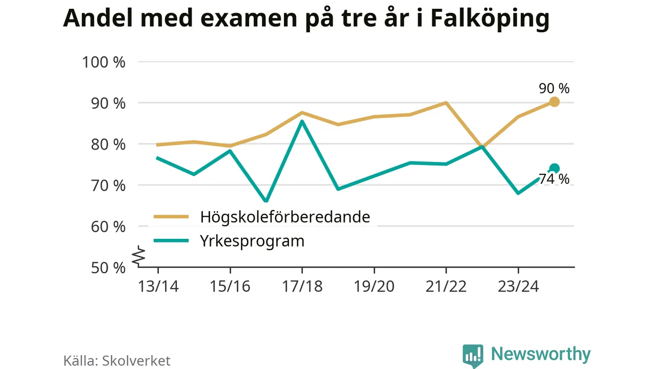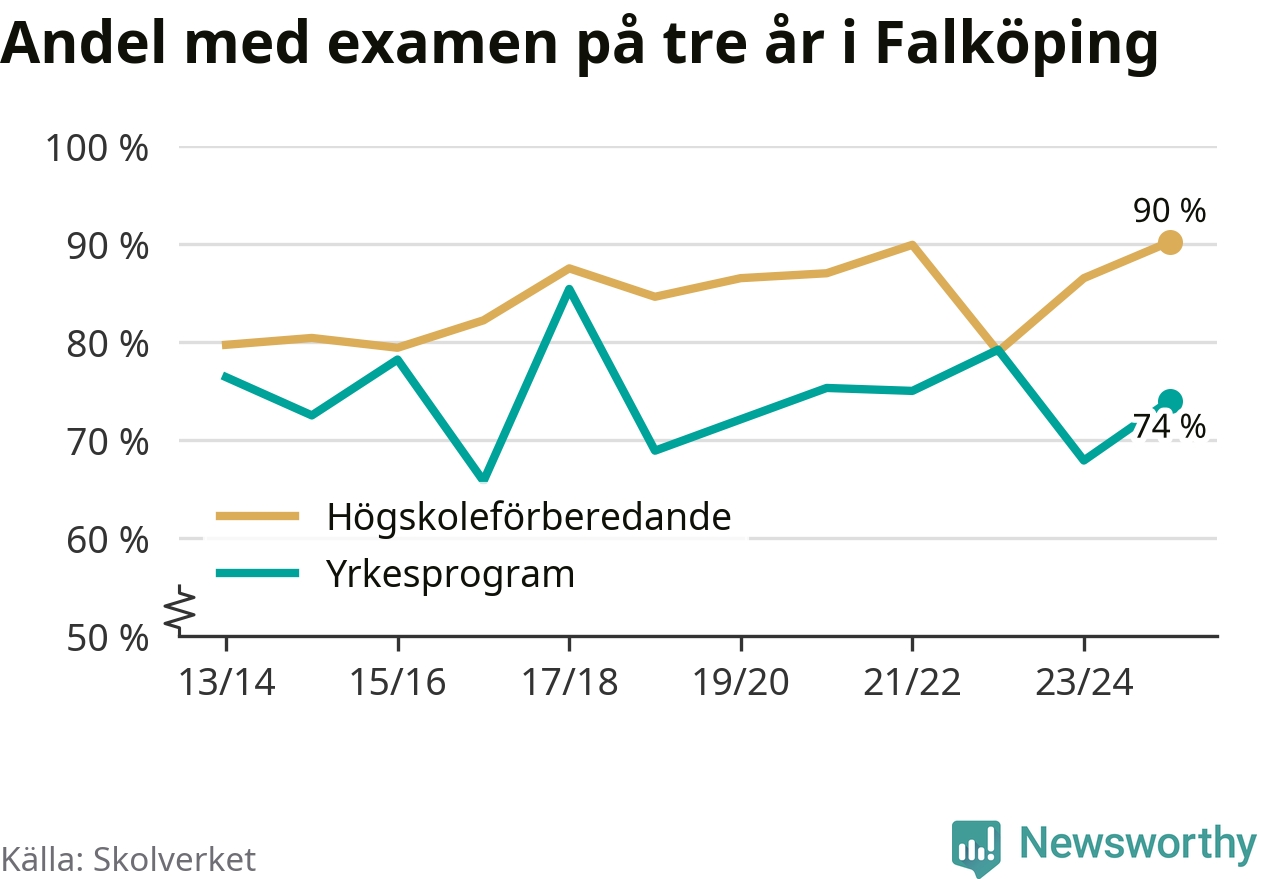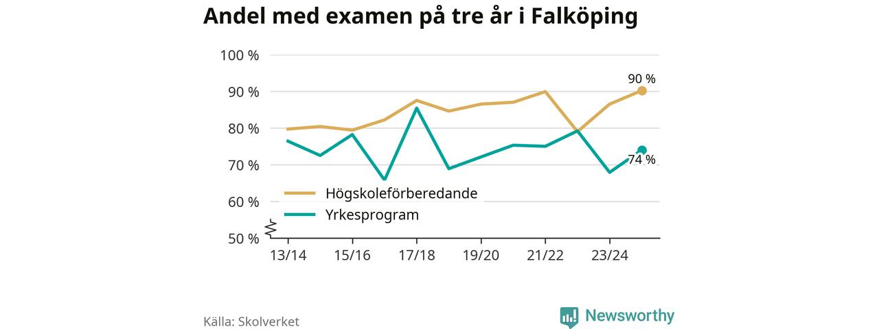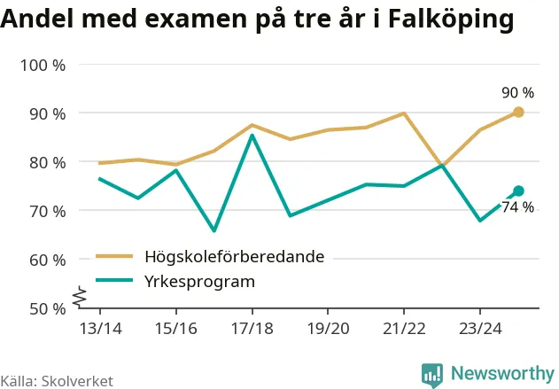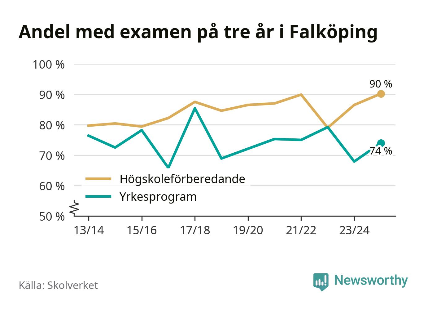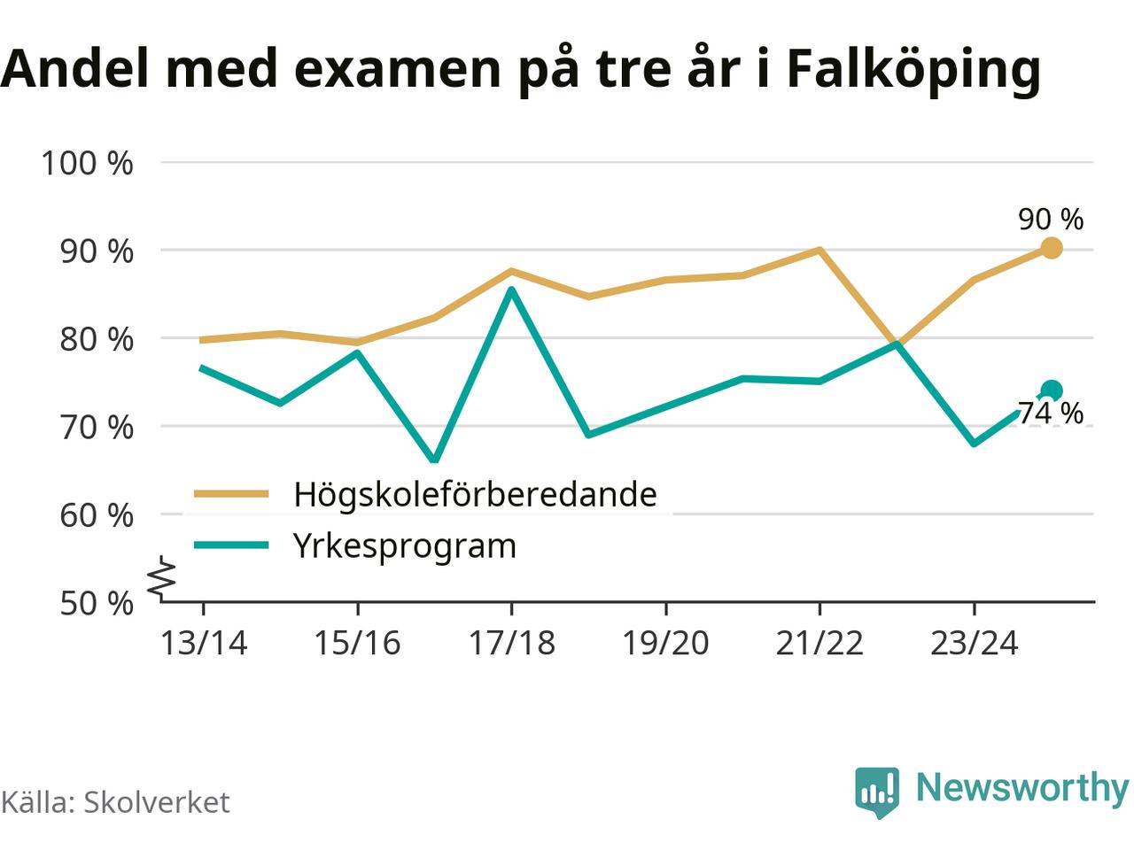 Inte sedan åtminstone läsåret 2013/14 har andelen elever som klarat gymnasieexamen på högskoleförberedande program varit högre i Falköping. Det visar Skolverkets senaste statistik.