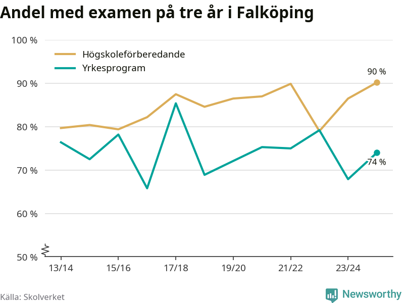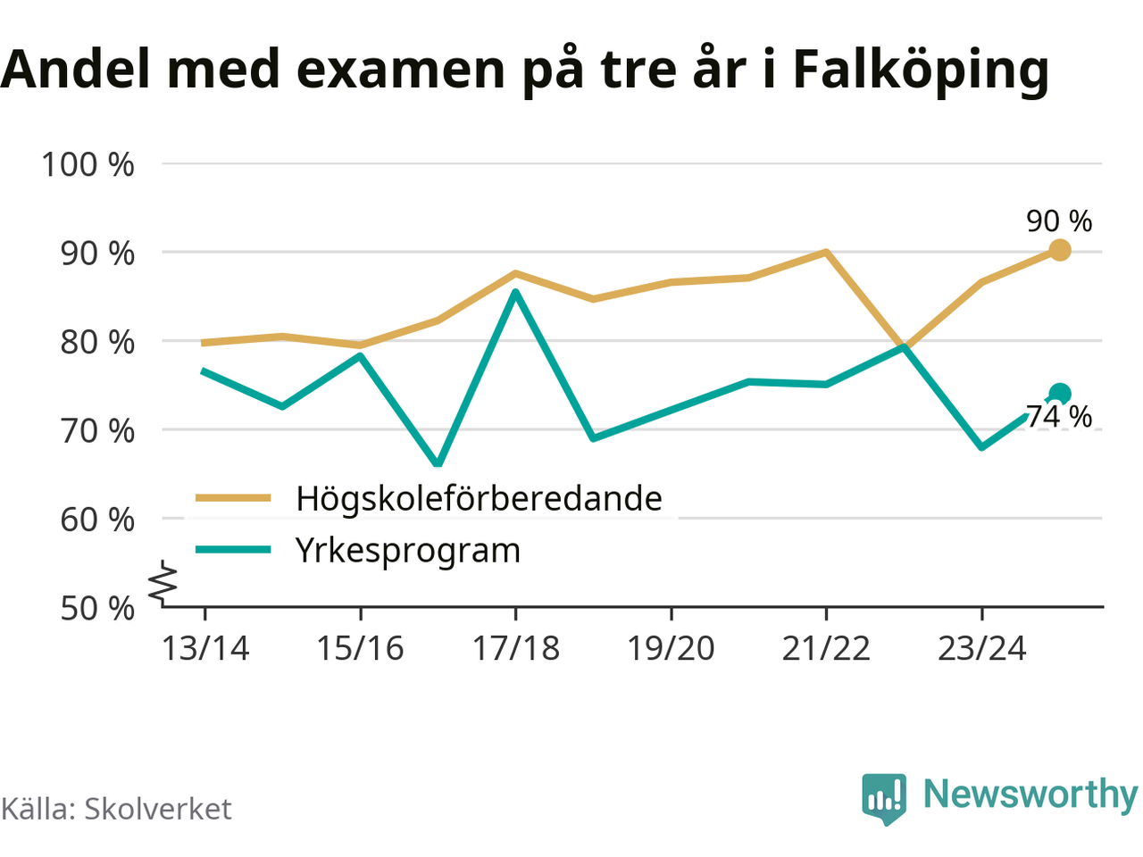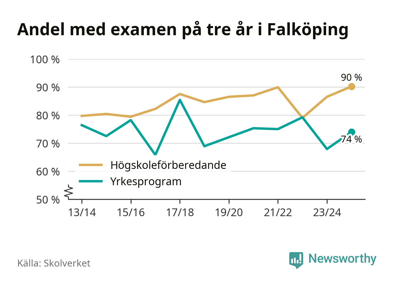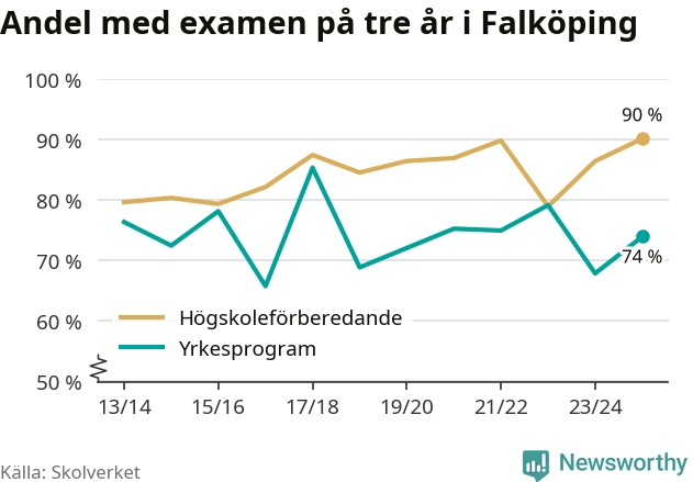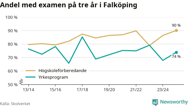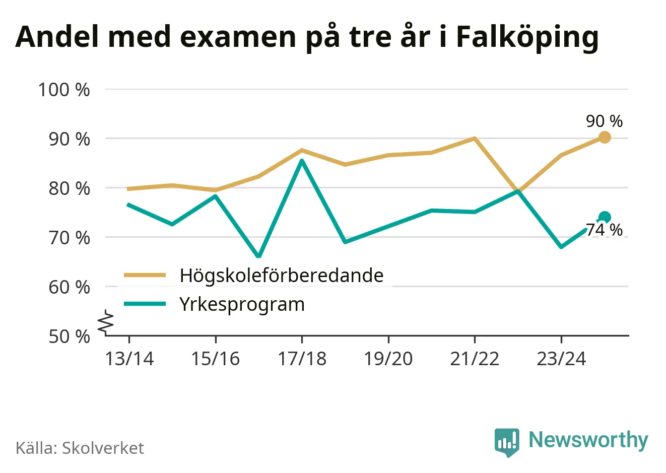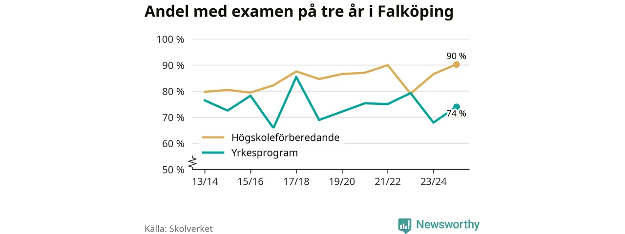 Inte sedan åtminstone läsåret 2013/14 har andelen elever som klarat gymnasieexamen på högskoleförberedande program varit högre i Falköping. Det visar Skolverkets senaste statistik.