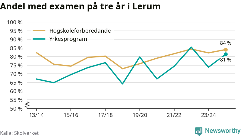 När eleverna på de yrkesförberedande programmen på Lerums Gymnasium, skolenhet 5, Lerums Gymnasium, skolenhet 2 och Lerums Gymnasium, skolenhet 1 sprang ut i våras hade 81 procent klarat gymnasieexamen på tre år. Det är sju procentenheter fler än året innan.