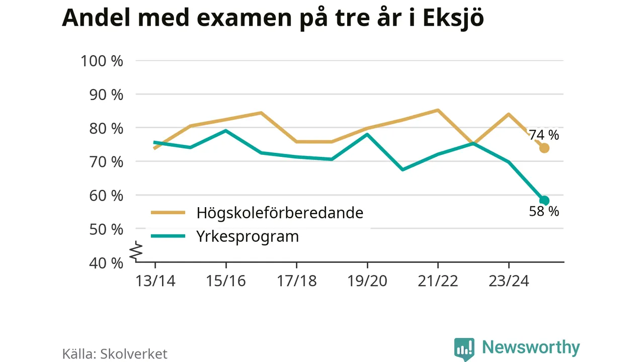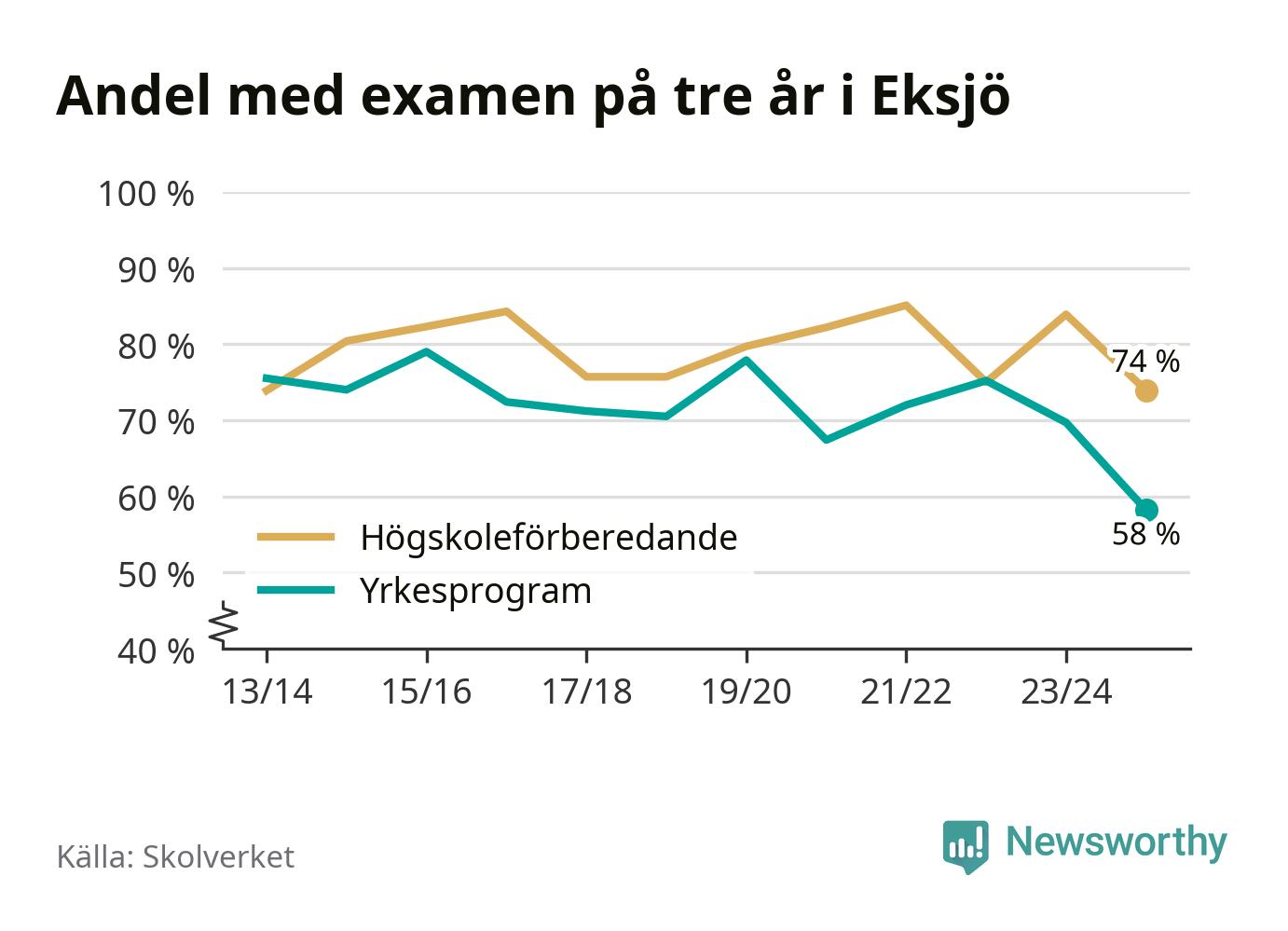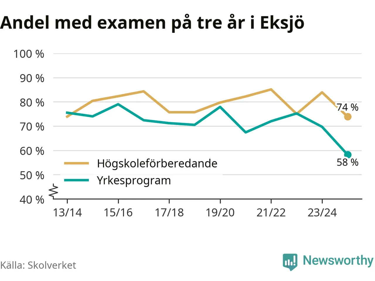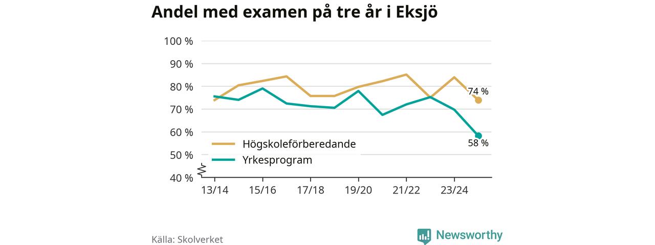 När eleverna på de yrkesförberedande programmen på Eksjö Gymnasium 1, Eksjö Gymnasium 3 och Nifsarpsskolan fri sprang ut i våras hade 58 procent klarat gymnasieexamen på tre år. Det är tolv procentenheter färre än året innan och den lägsta andelen sedan åtminstone läsåret 2013/14.