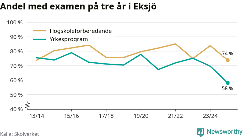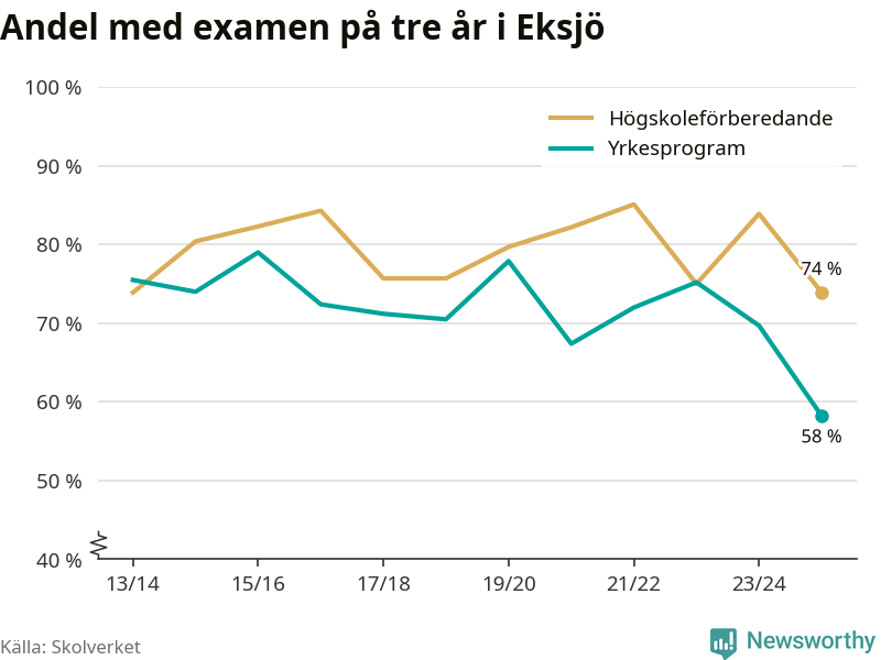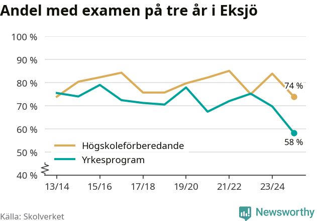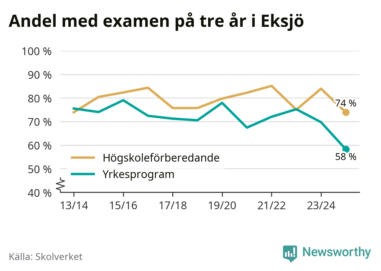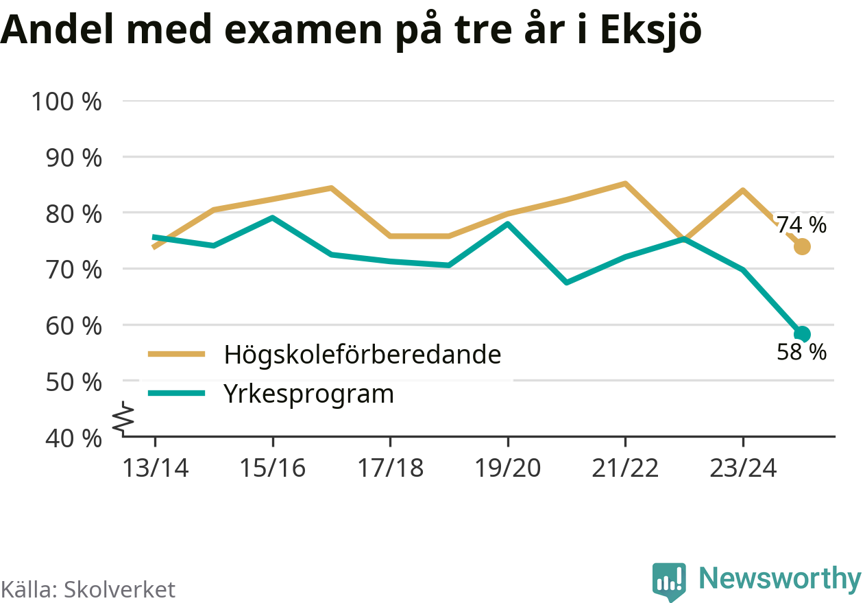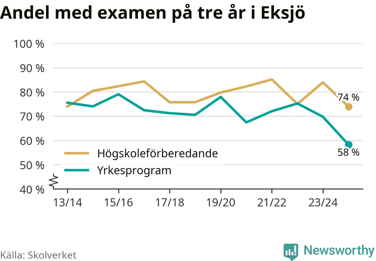 När eleverna på de yrkesförberedande programmen på Eksjö Gymnasium 1, Eksjö Gymnasium 3 och Nifsarpsskolan fri sprang ut i våras hade 58 procent klarat gymnasieexamen på tre år. Det är tolv procentenheter färre än året innan och den lägsta andelen sedan åtminstone läsåret 2013/14.