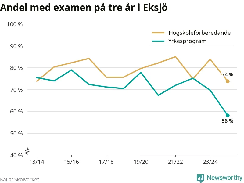 Inte sedan åtminstone läsåret 2013/14 har andelen elever som klarade gymnasieexamen på yrkesprogram varit lägre i Eksjö. Det visar Skolverkets statistik.