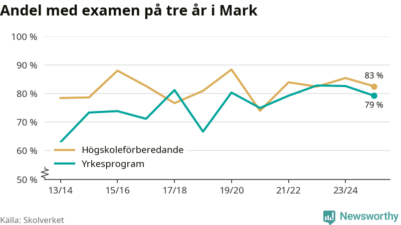 | Marks Gymnasieskola, enhet D | Mark | 76 % (−6 %) | 83 % (−1 %) |