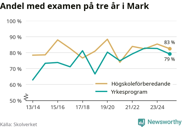 Högst andel som klarade examen i Marks kommun, de nationella programmen sammantaget, fanns på Marks Gymnasieskola, enhet C, där eleverna läser på ekonomiprogrammet, estetiska programmet eller samhällsvetenskapsprogrammet. Där klarade 88 procent av de 68 elever som började gymnasiet 2022/23 examen i våras. Det är en högre siffra än i riket som helhet.