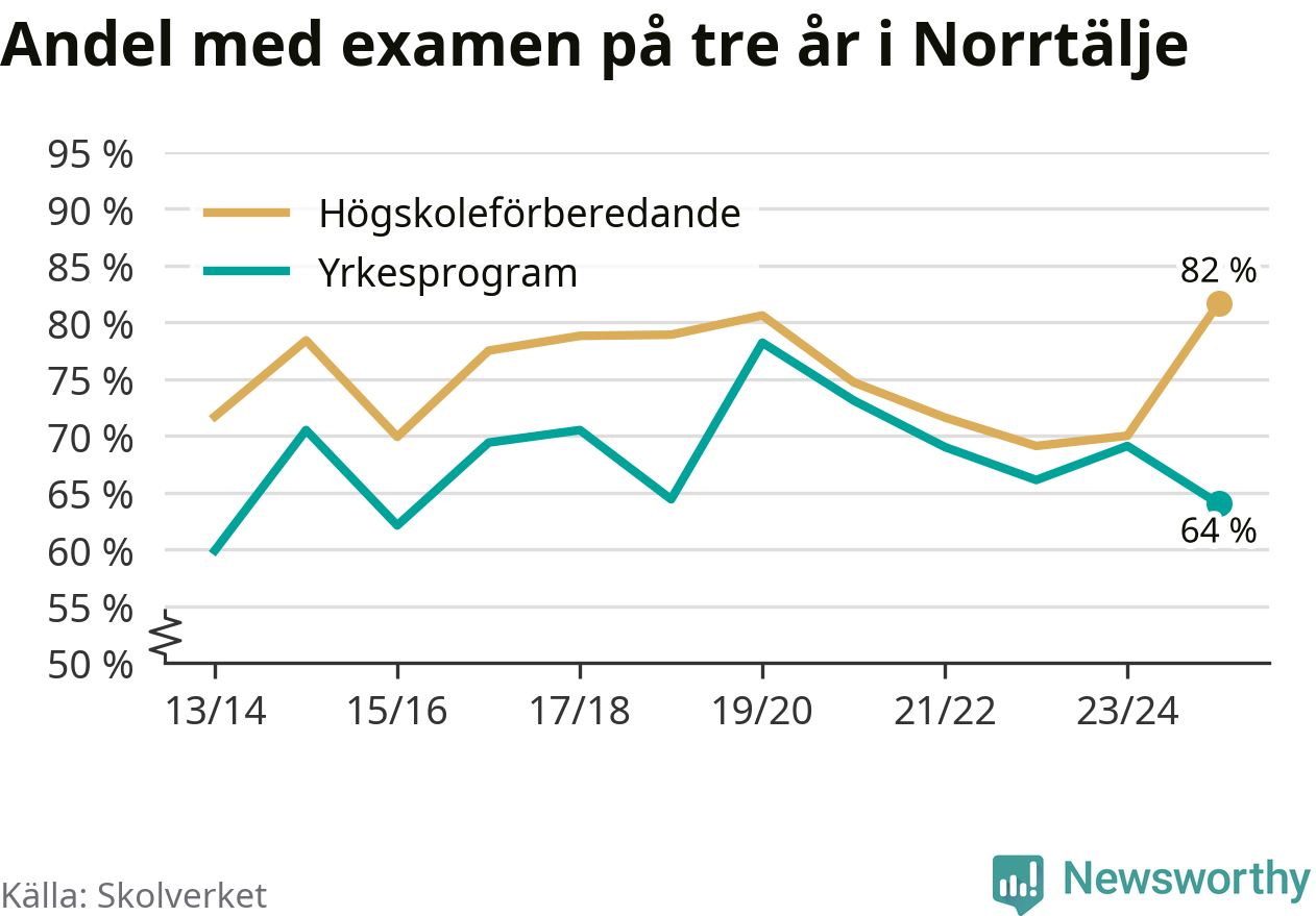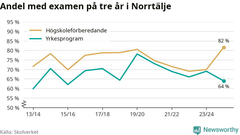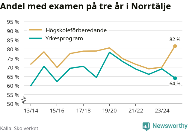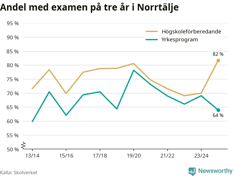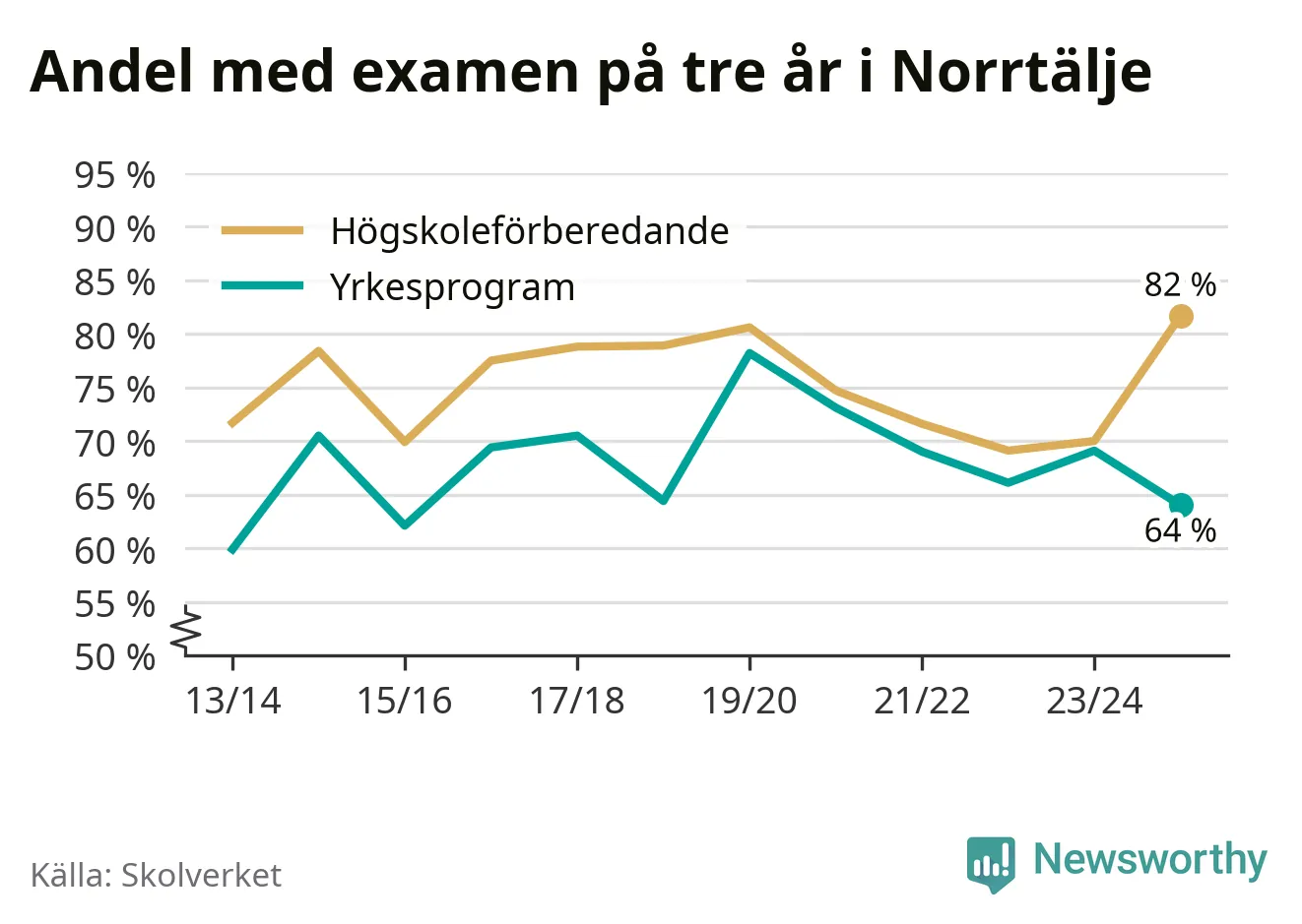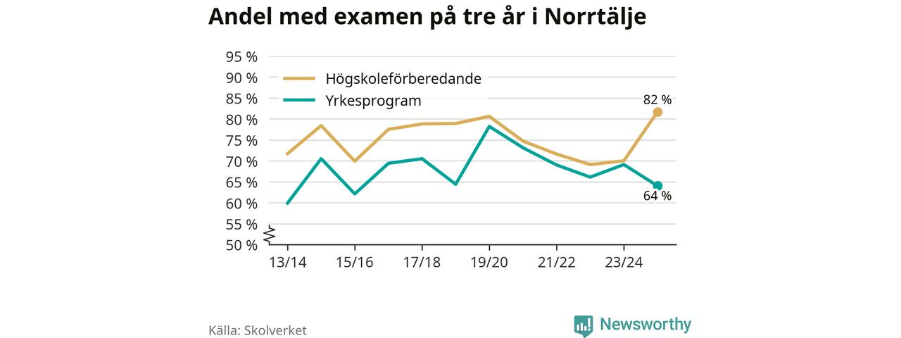 Inte sedan åtminstone läsåret 2013/14 har andelen elever som klarat gymnasieexamen på högskoleförberedande program varit högre i Norrtälje. Det visar Skolverkets senaste statistik.