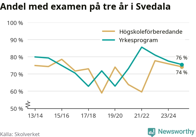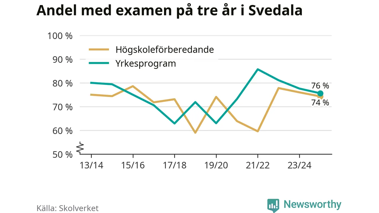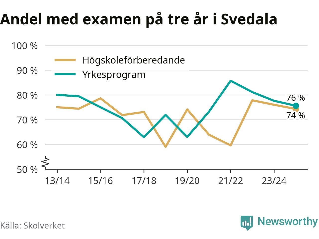 Andelen elever som klarade examen på tre år på gymnasieskolorna i Svedala minskade förra läsåret. Det visar Skolverkets statistik. Därmed går Svedalastudenterna mot strömmen jämfört med riket som helhet.