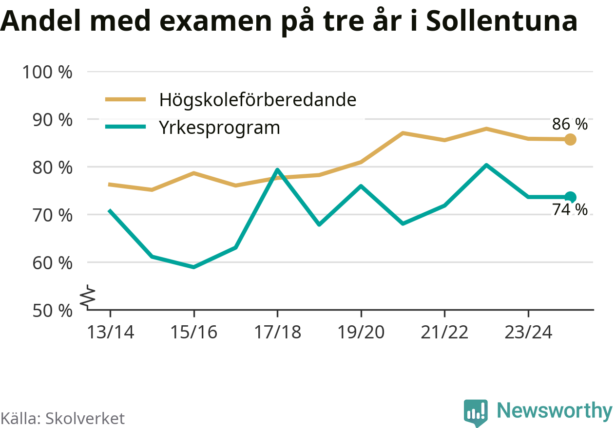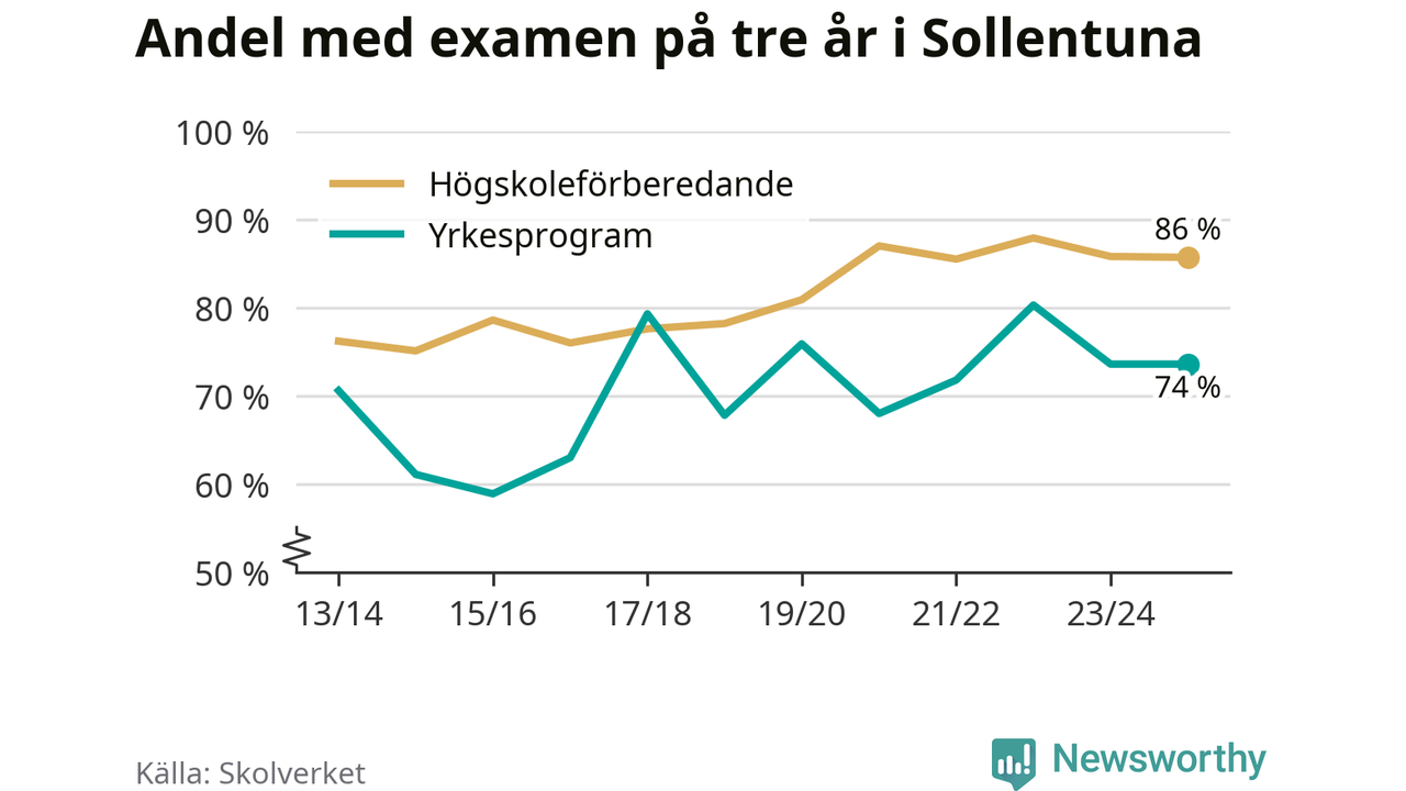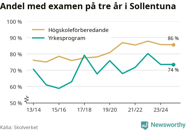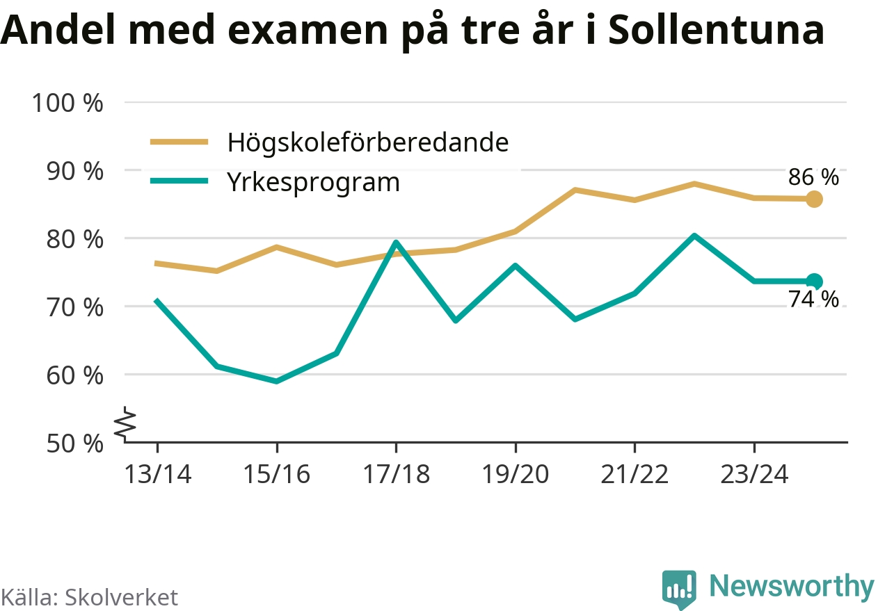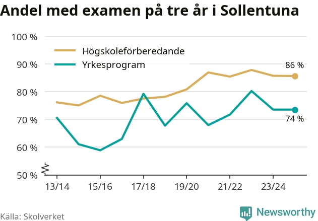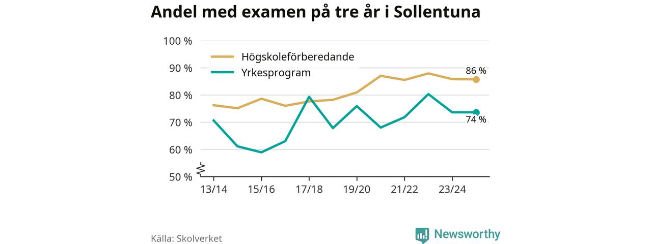 När eleverna på de yrkesförberedande programmen i Sollentuna kommun sprang ut i våras hade 74 procent klarat gymnasieexamen på tre år. Det är lika stor andel som året innan.