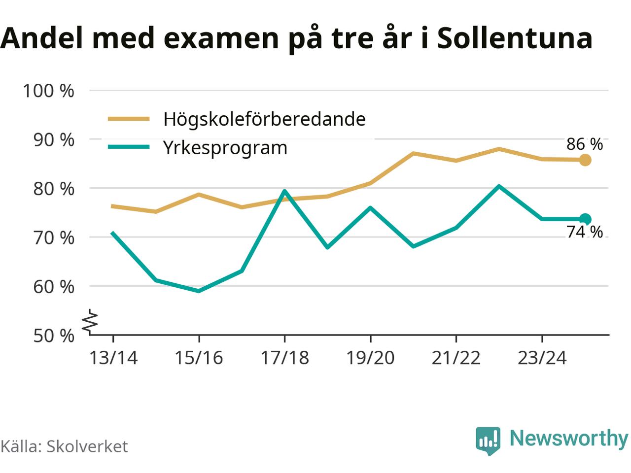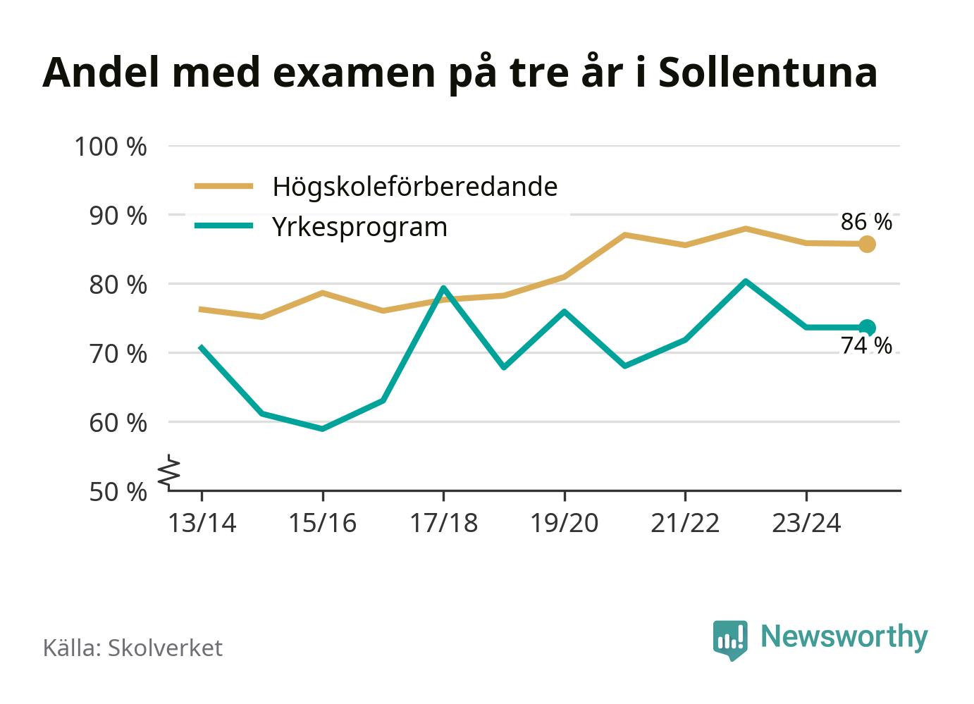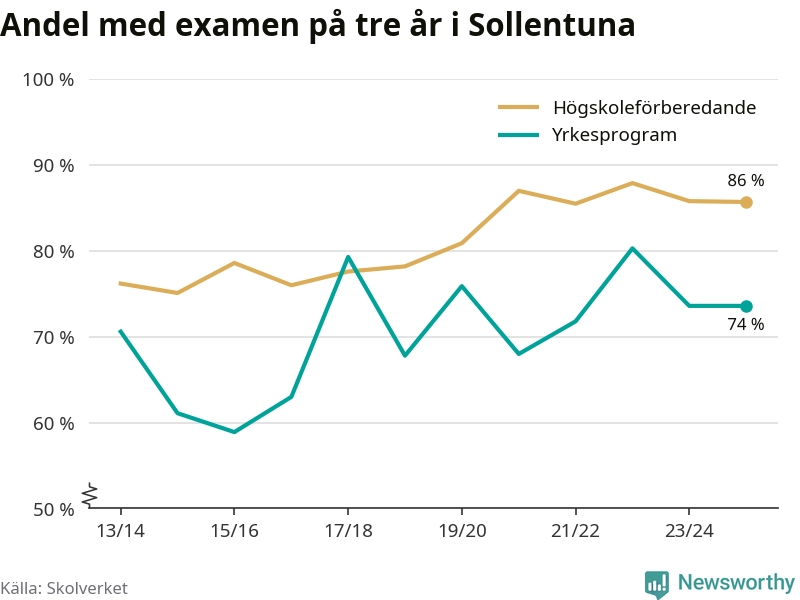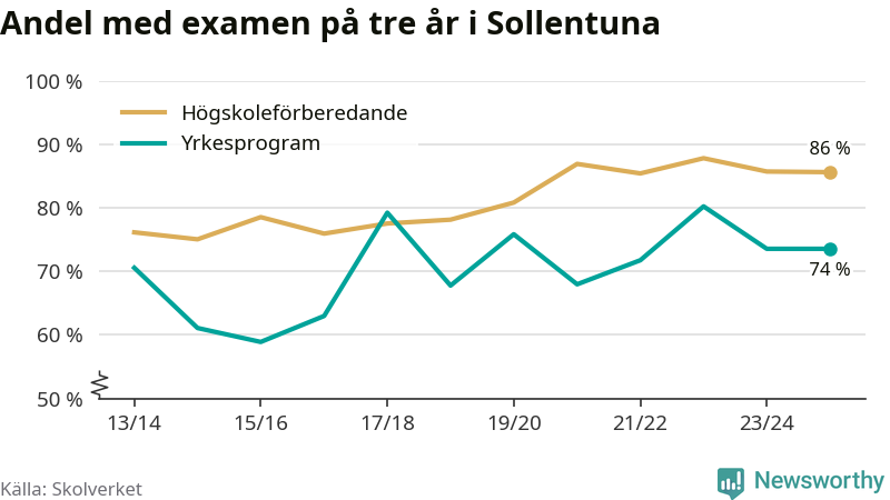 När eleverna på de yrkesförberedande programmen i Sollentuna kommun sprang ut i våras hade 74 procent klarat gymnasieexamen på tre år. Det är lika stor andel som året innan.