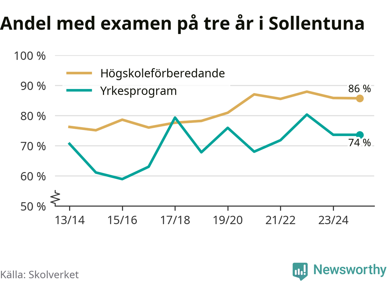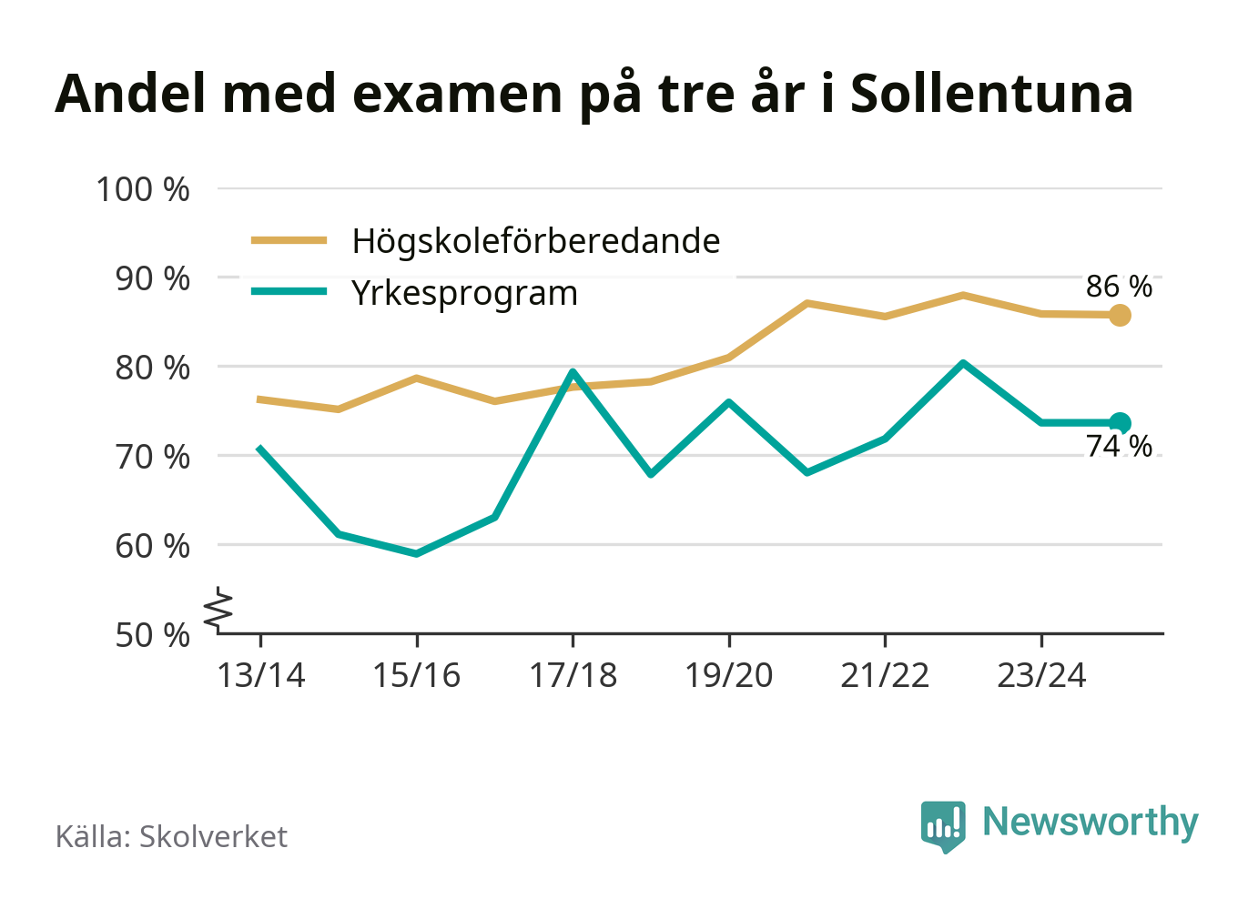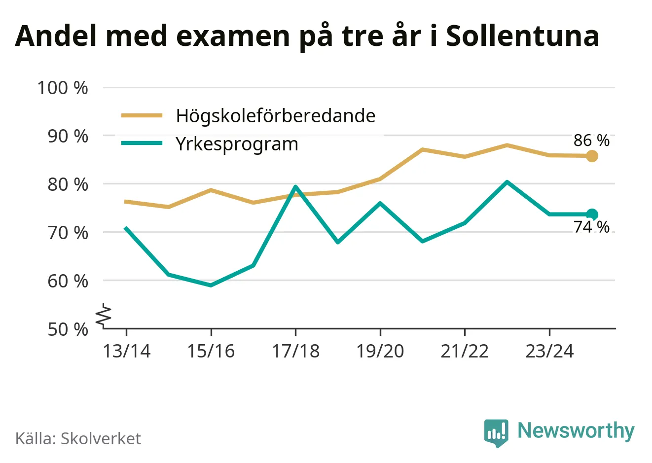 | Vackstanäsgymnasiet | Södertälje | 75 % (−13 %) | 89 % (+9 %) |
