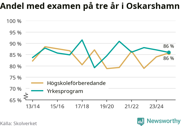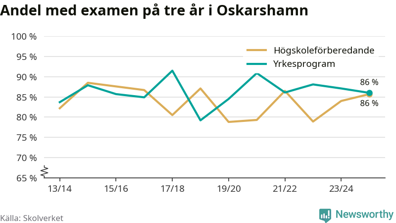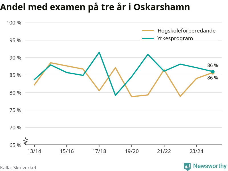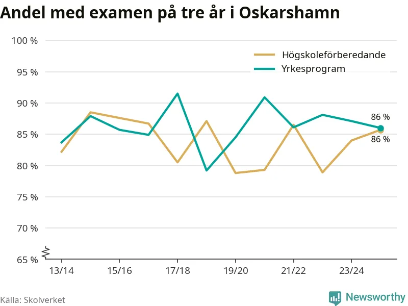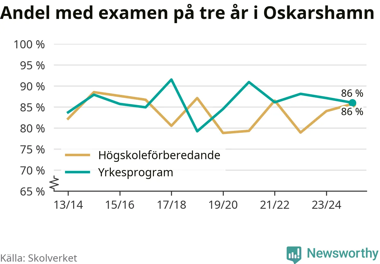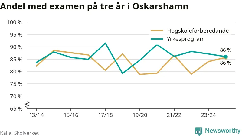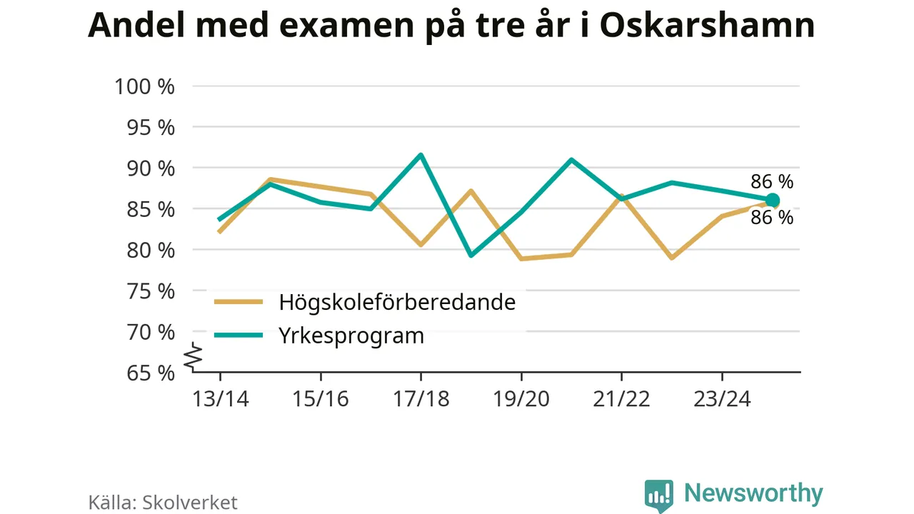 När eleverna på de yrkesförberedande programmen i Oskarshamns kommun sprang ut i våras hade 86 procent klarat gymnasieexamen på tre år. Det är en procentenhet färre än året innan och inte sedan kullen som tog studenten läsåret 2019/20 har andelen varit lägre.