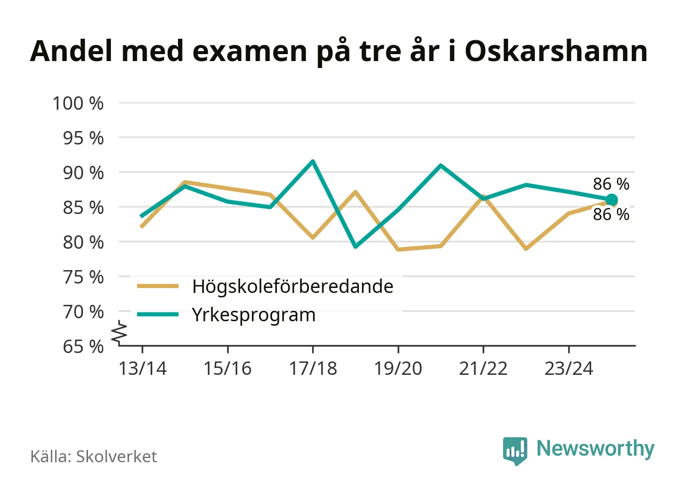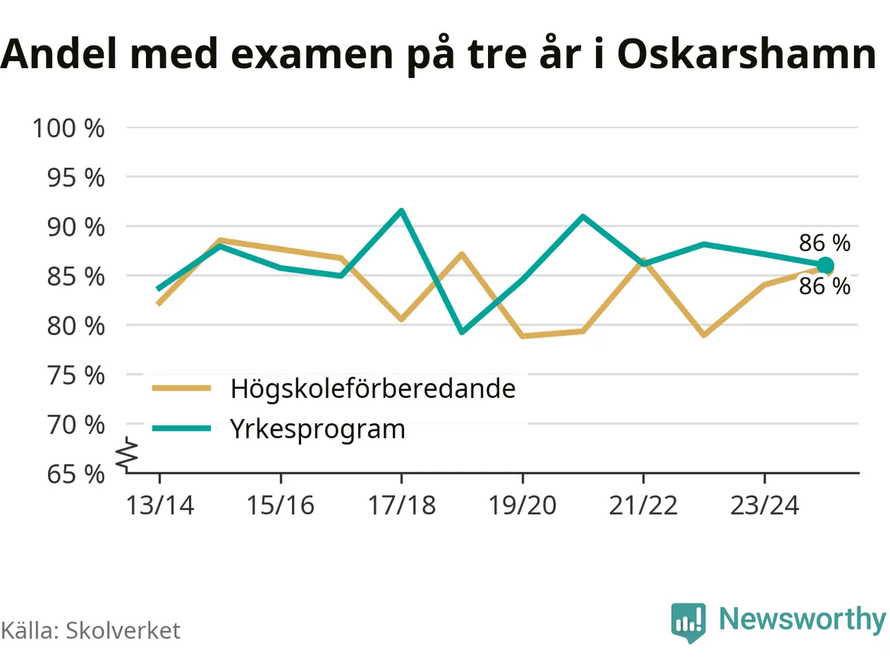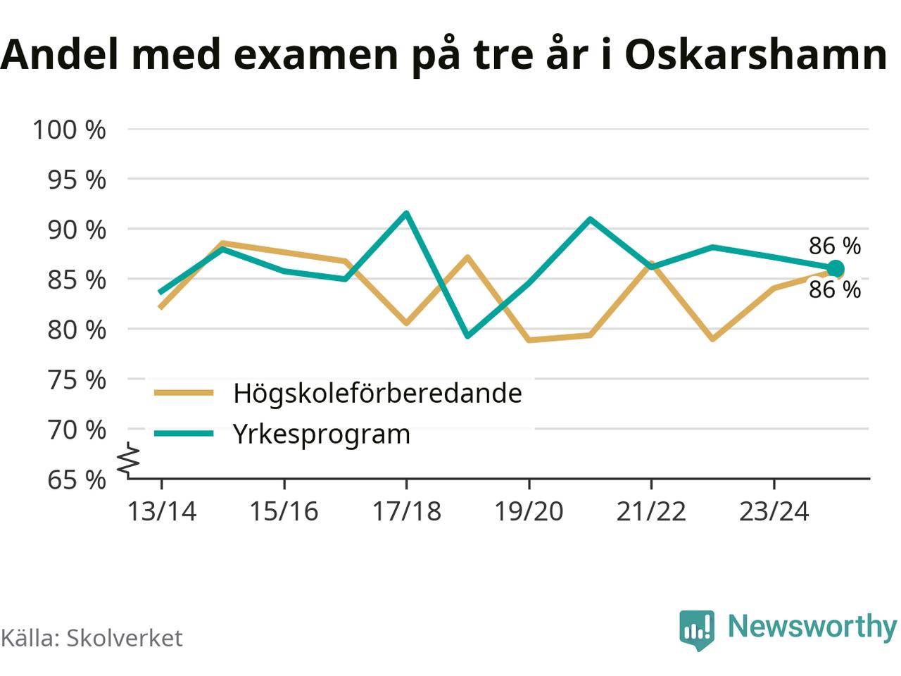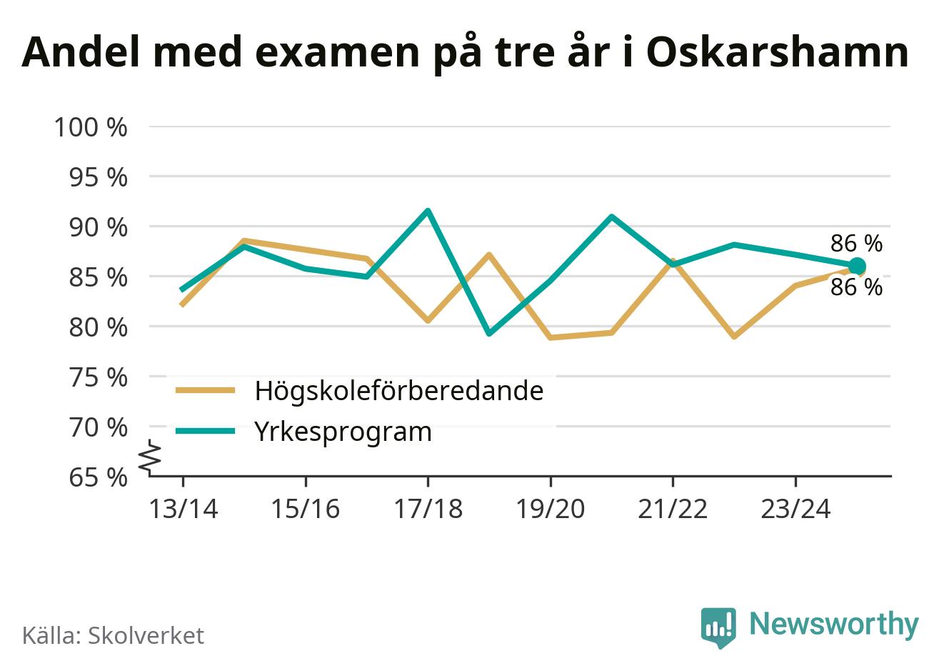 När eleverna på de yrkesförberedande programmen i Oskarshamns kommun sprang ut i våras hade 86 procent klarat gymnasieexamen på tre år. Det är en procentenhet färre än året innan och inte sedan kullen som tog studenten läsåret 2019/20 har andelen varit lägre.