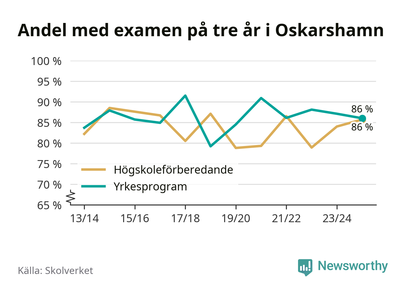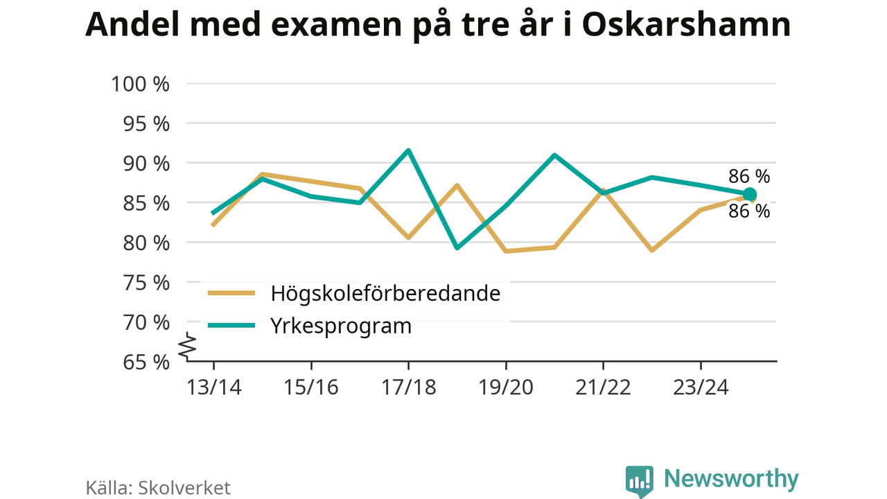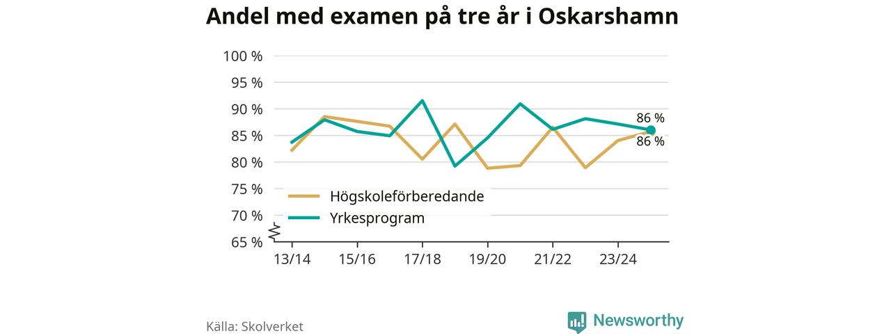 Högst andel som klarade examen i Oskarshamns kommun, de nationella programmen sammantaget, fanns på Oscarsgymnasiet C, där eleverna läser på ekonomiprogrammet. Där klarade 95 procent av de 60 elever som började gymnasiet 2022/23 examen i våras. Det är en högre siffra än i riket som helhet.