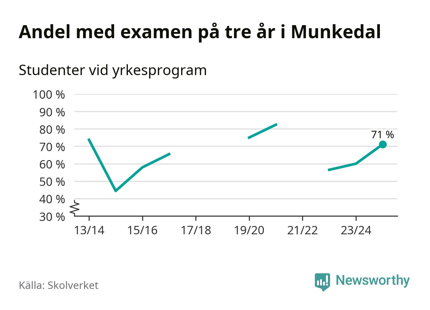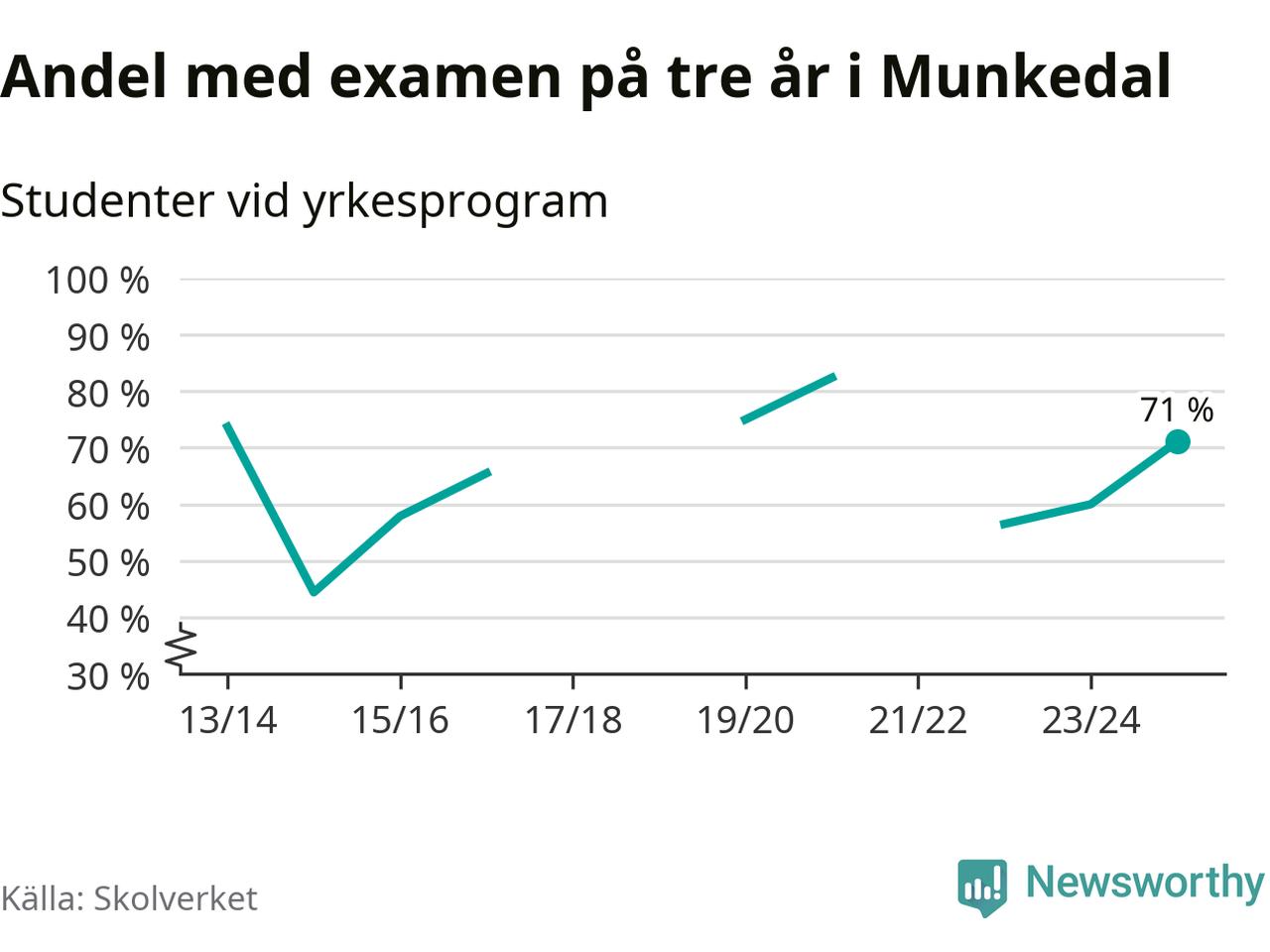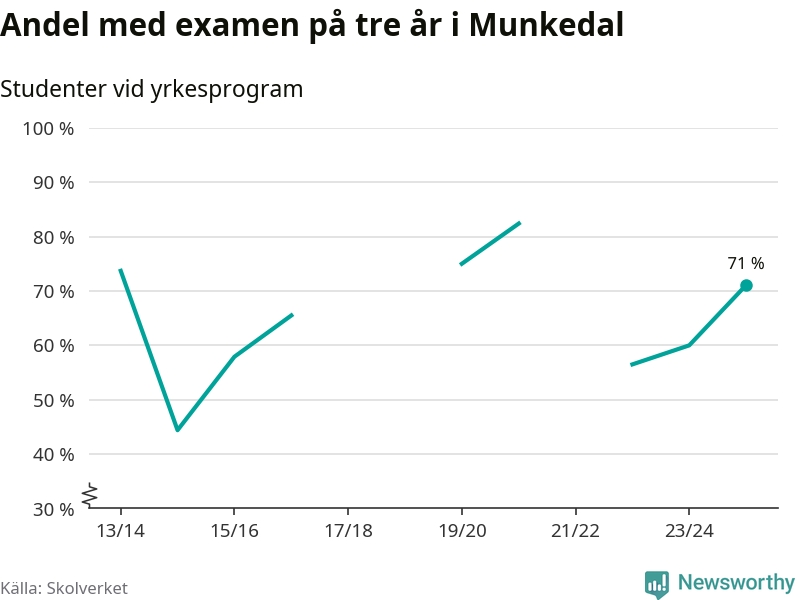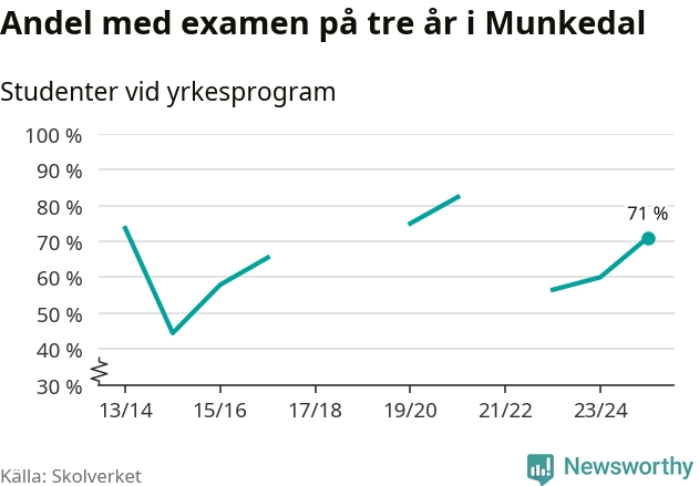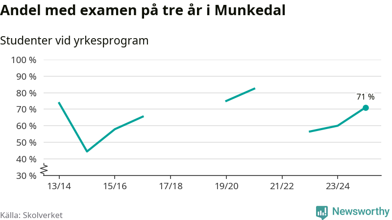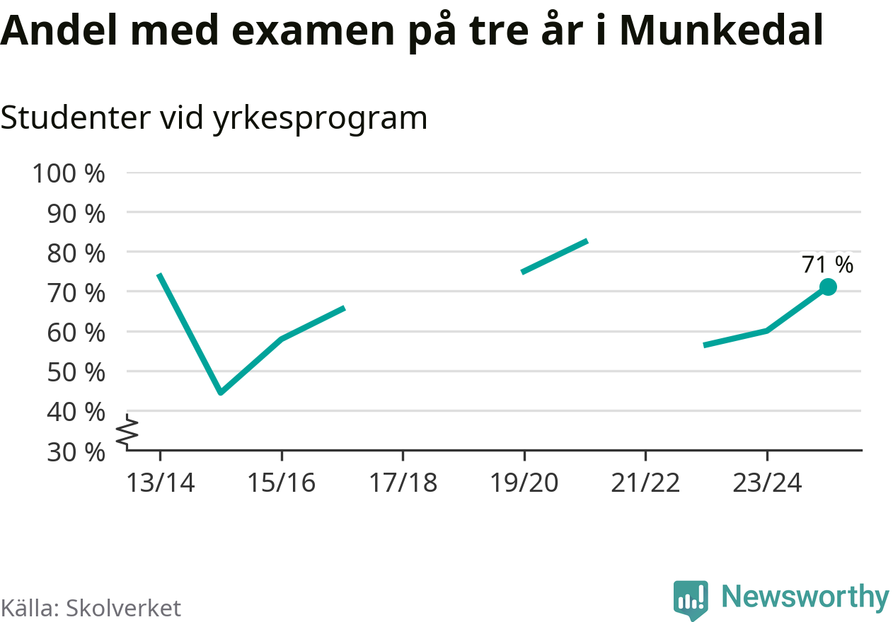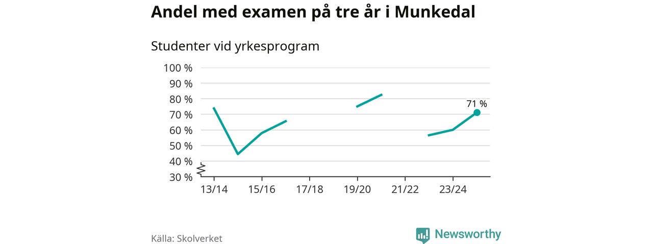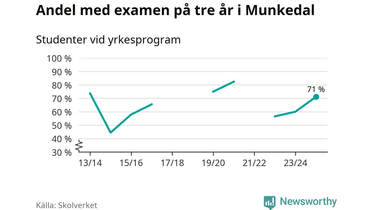 Högst andel som klarade examen i Munkedals kommun, de nationella programmen sammantaget, fanns på Lärlingsgymnasiet i Munkedal. Där klarade 63 procent av de 16 elever som började gymnasiet 2022/23 examen i våras. Det är i närheten av rikssnittet.