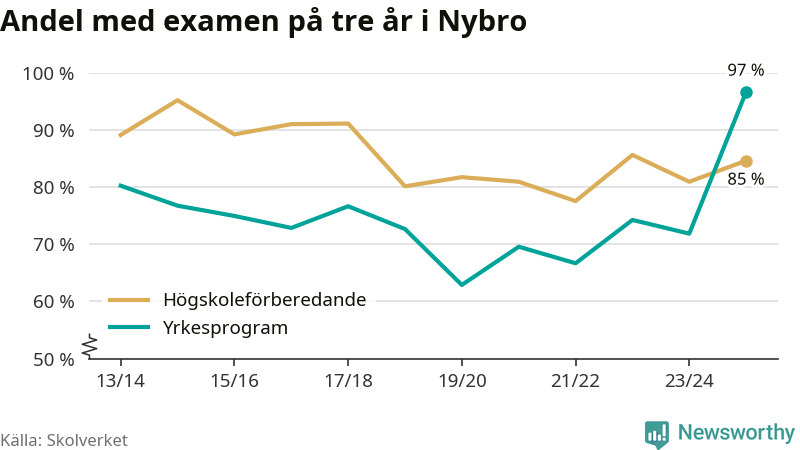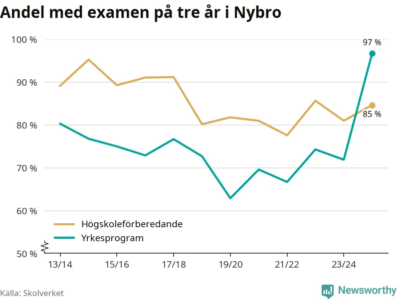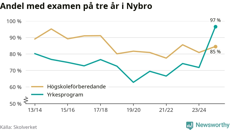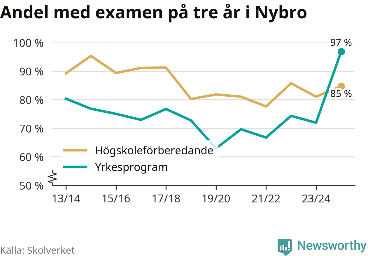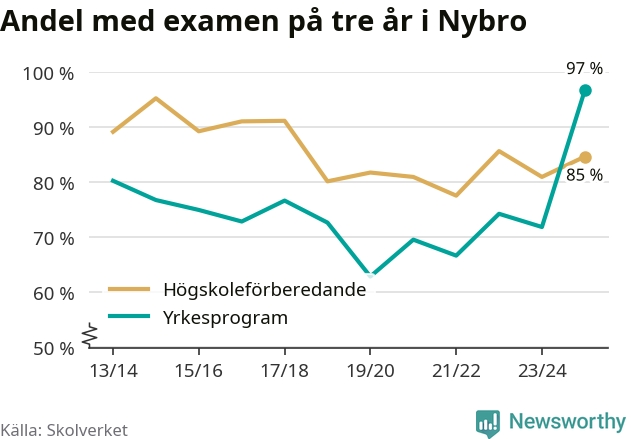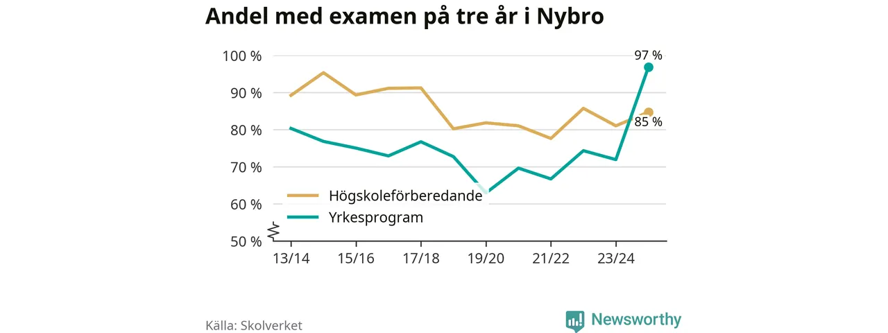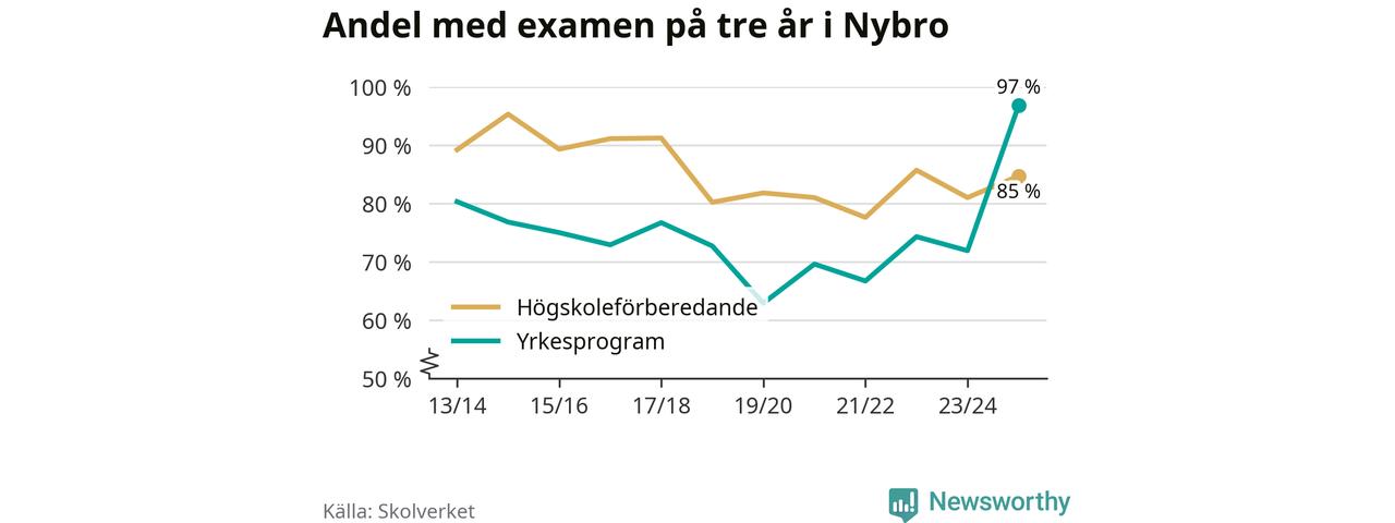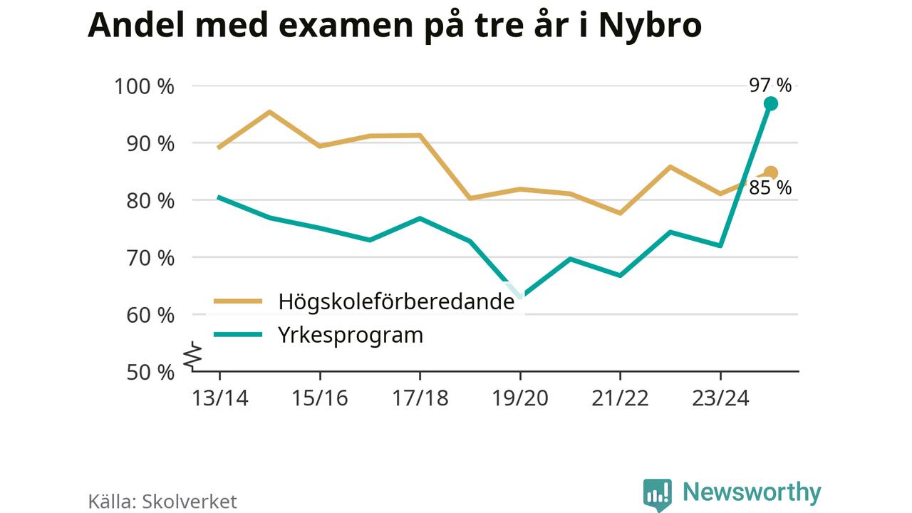 Inte sedan åtminstone läsåret 2013/14 har andelen elever som klarat gymnasieexamen på yrkesprogram varit högre i Nybro. Det visar Skolverkets senaste statistik.