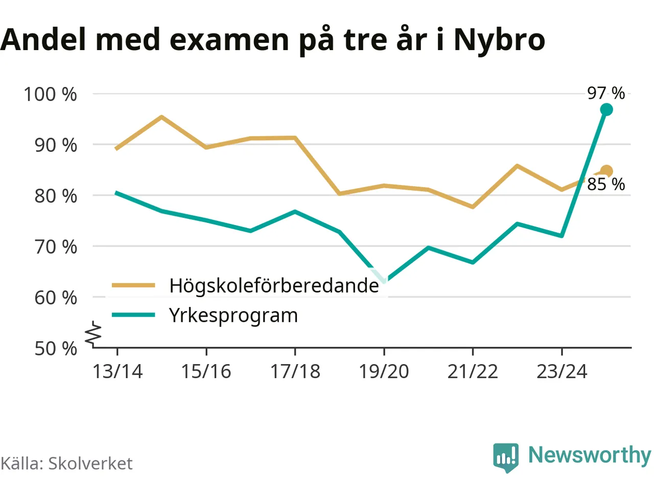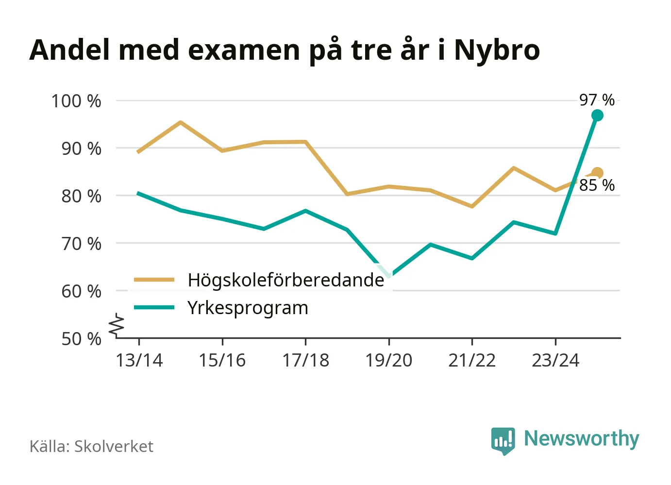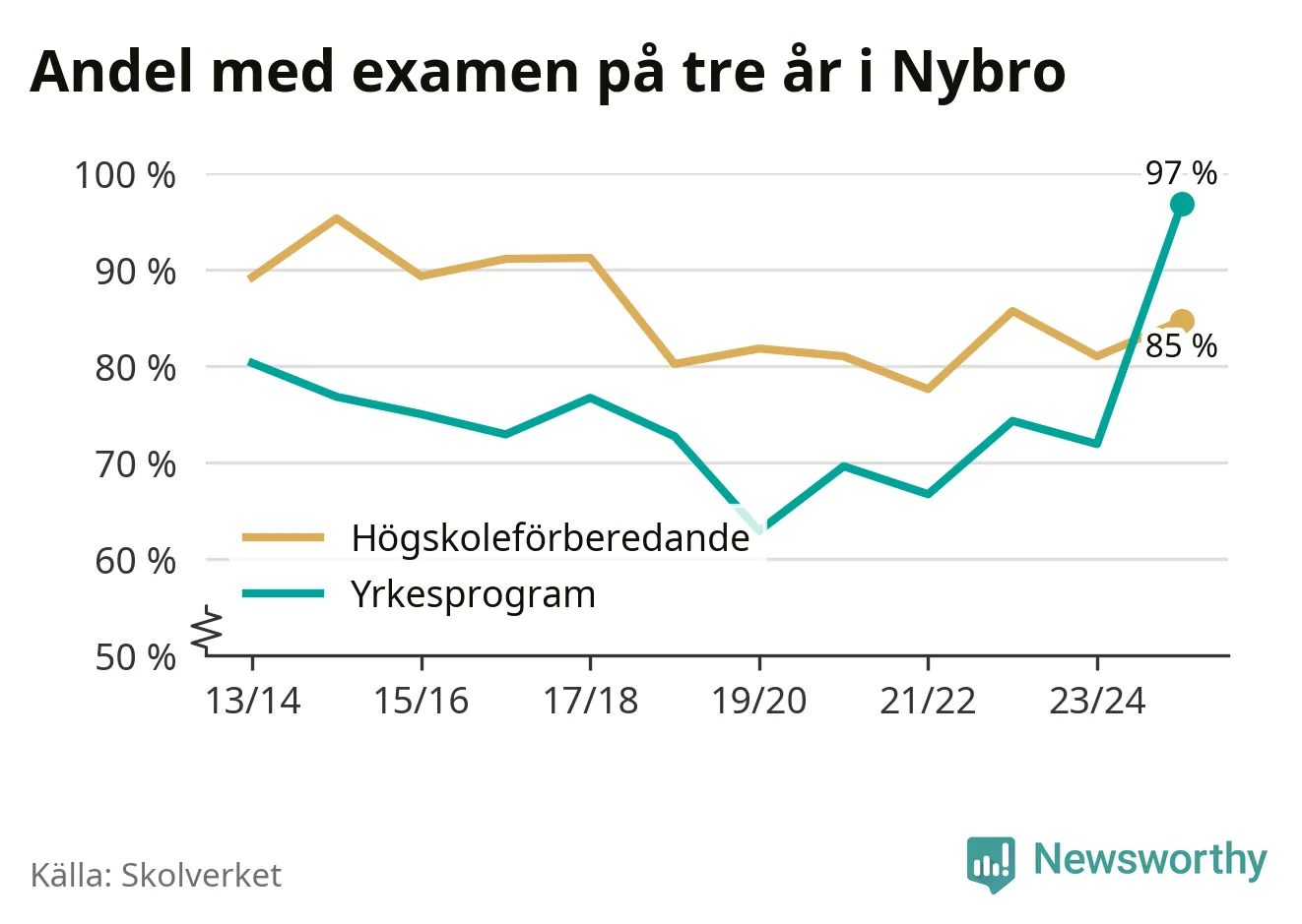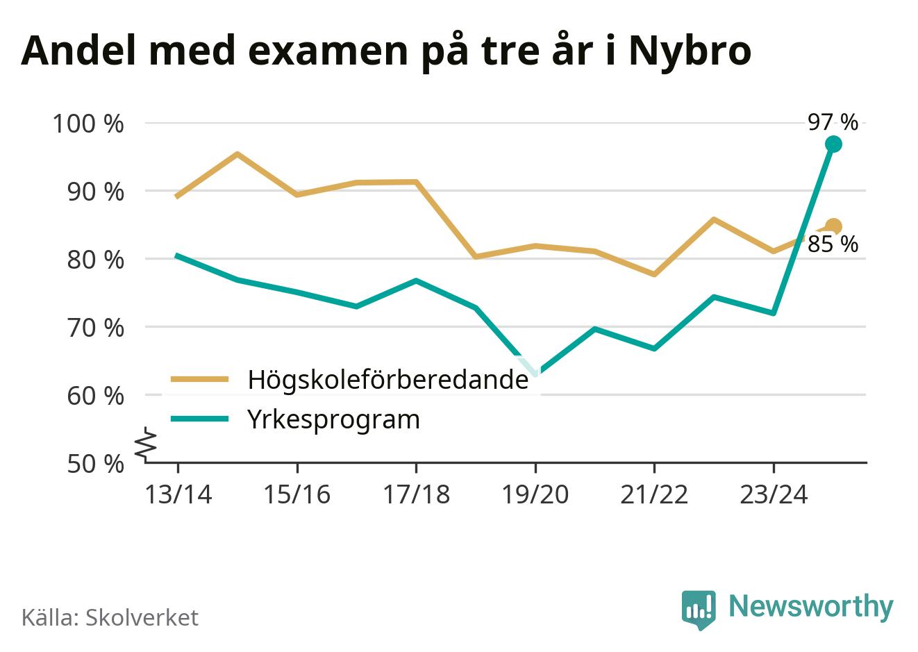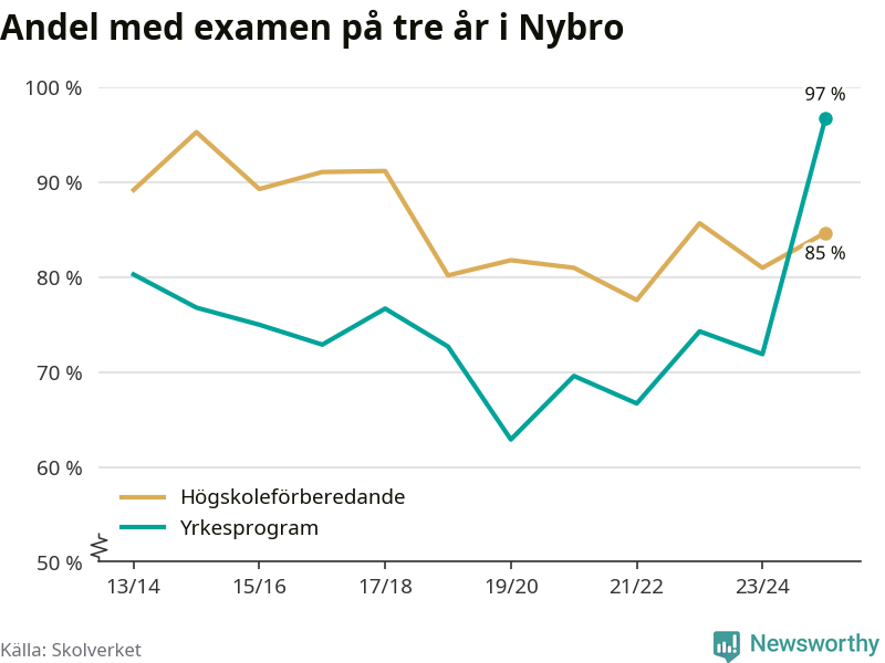 Inte sedan åtminstone läsåret 2013/14 har andelen elever som klarat gymnasieexamen på yrkesprogram varit högre i Nybro. Det visar Skolverkets senaste statistik.