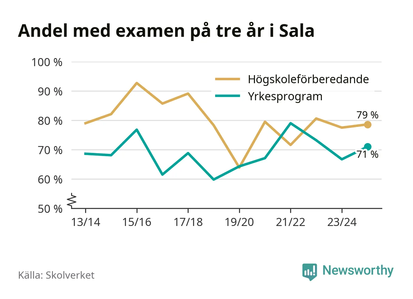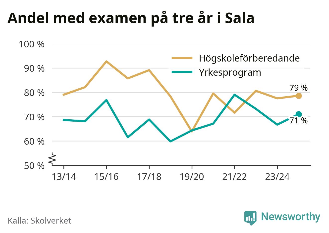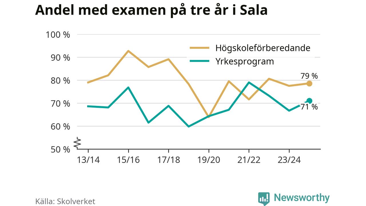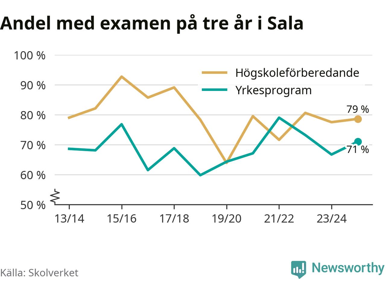 Precis som i riket som helhet ökade andelen som klarade gymnasieexamen från yrkesprogram på tre år i Sala.