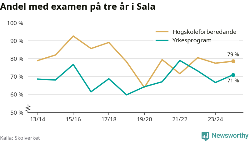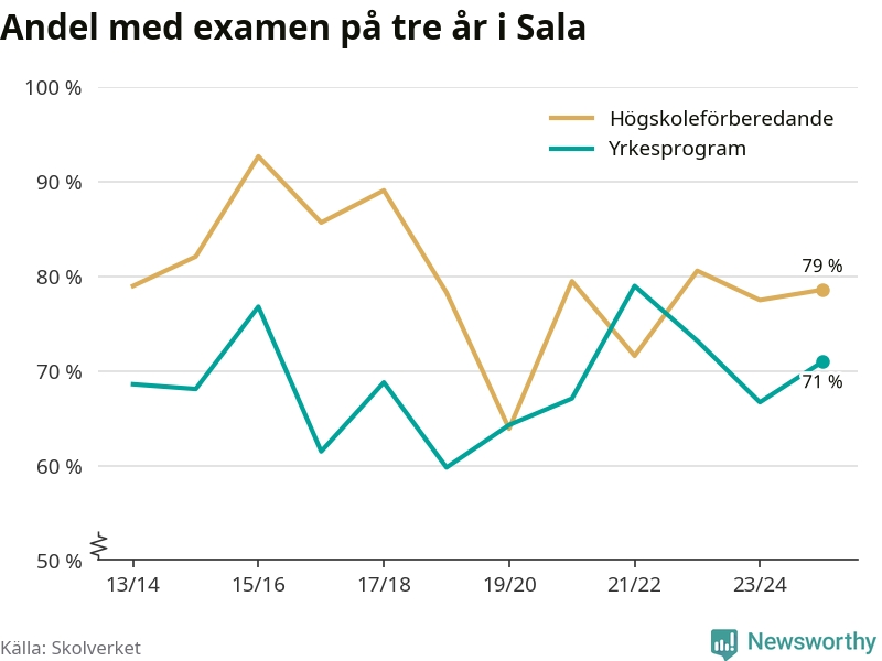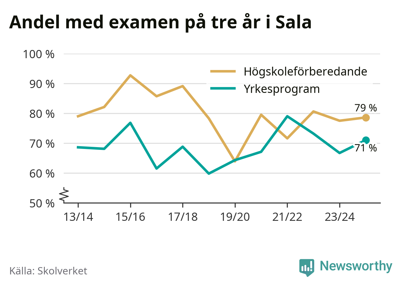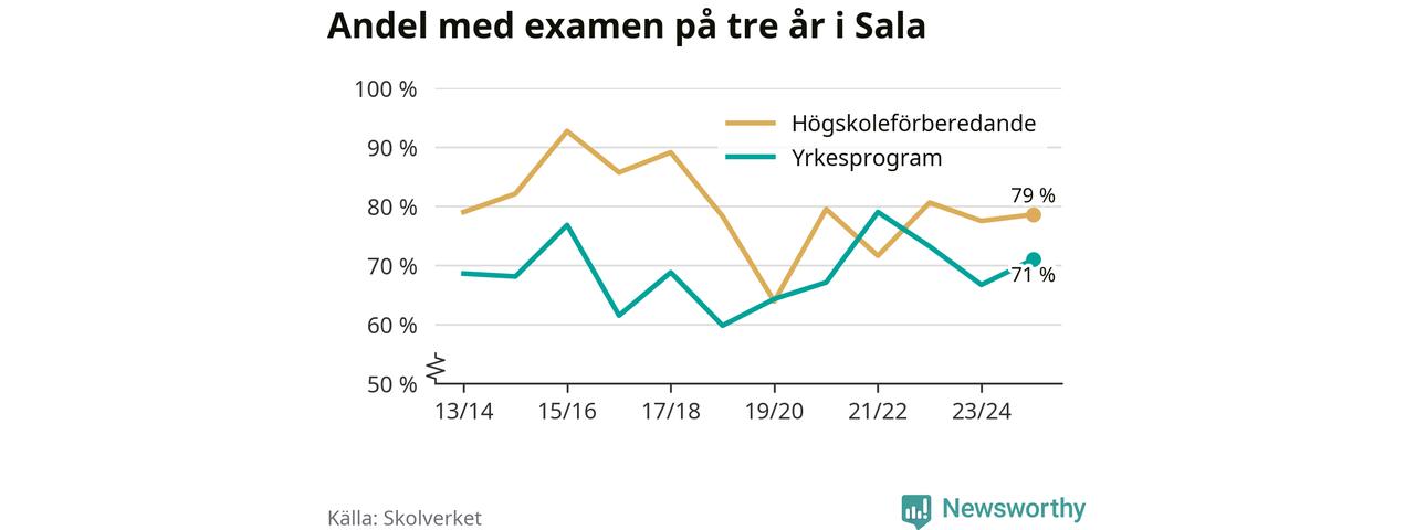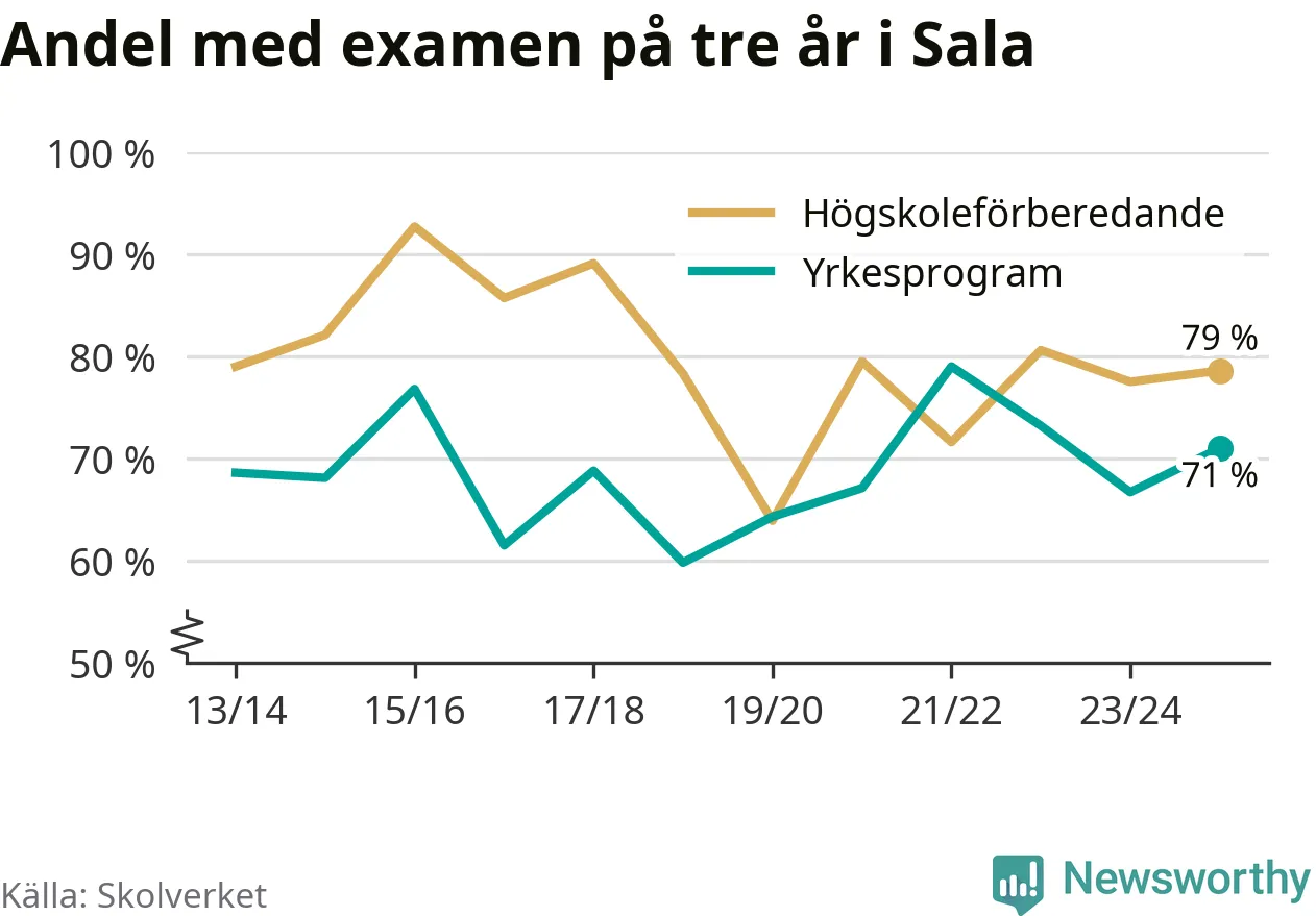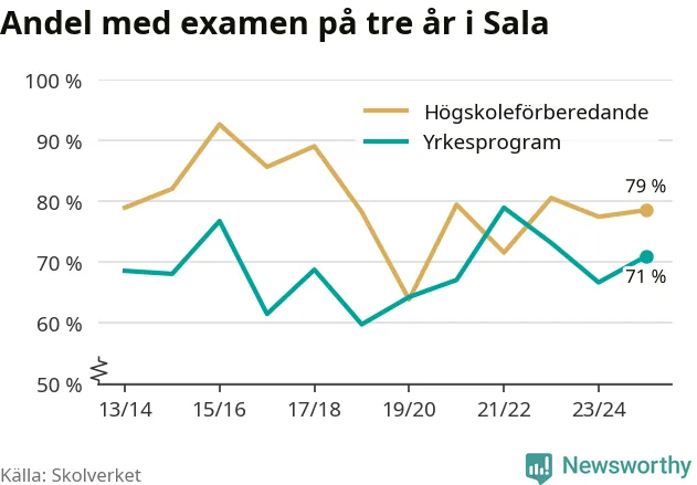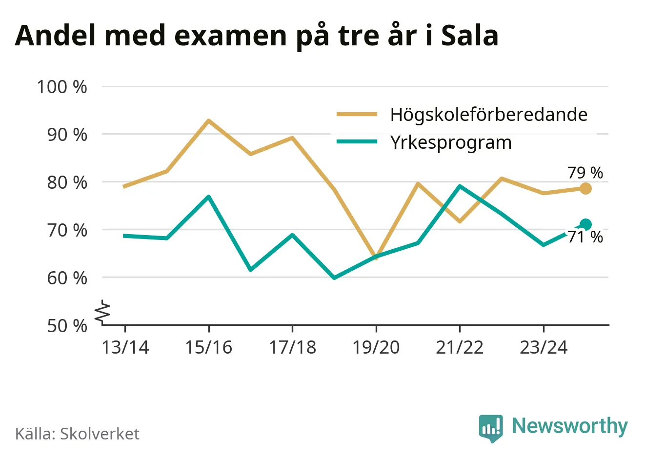 Precis som i riket som helhet ökade andelen som klarade gymnasieexamen från yrkesprogram på tre år i Sala.