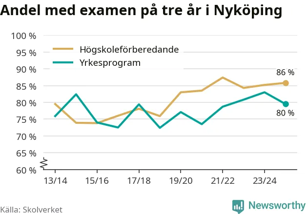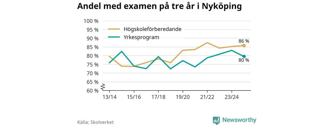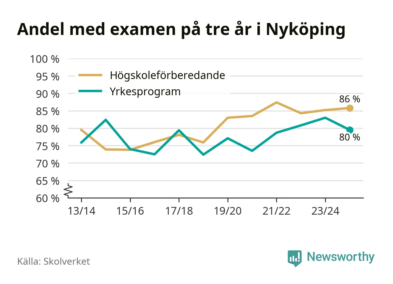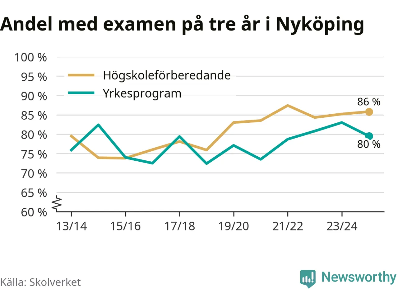 Medan andelen elever som klarade gymnasieexamen på yrkesprogram på tre år ökade i riket som helhet, minskade andelen i Nyköping något. Här är resultaten – skola för skola.