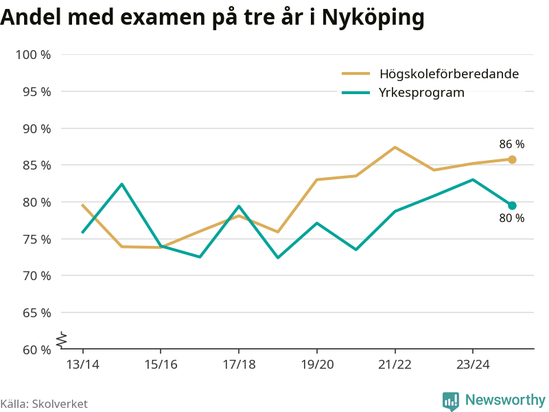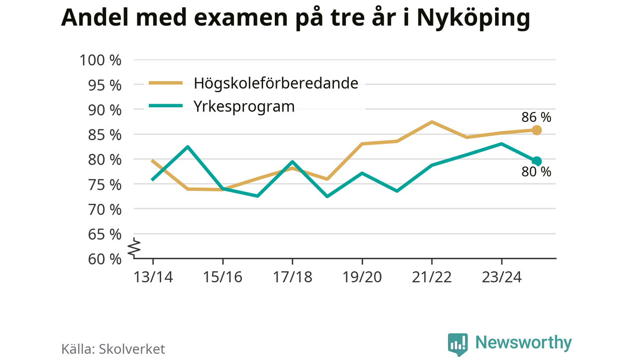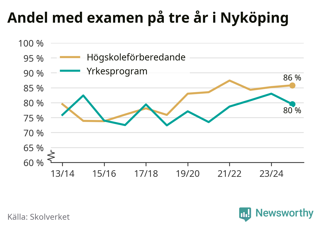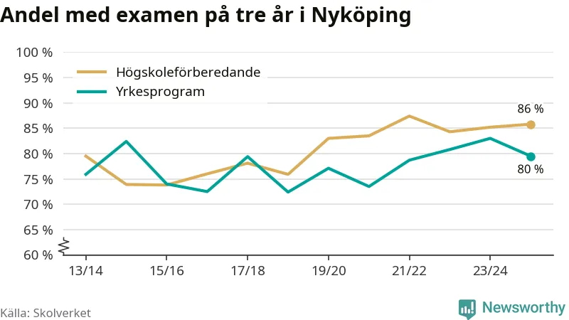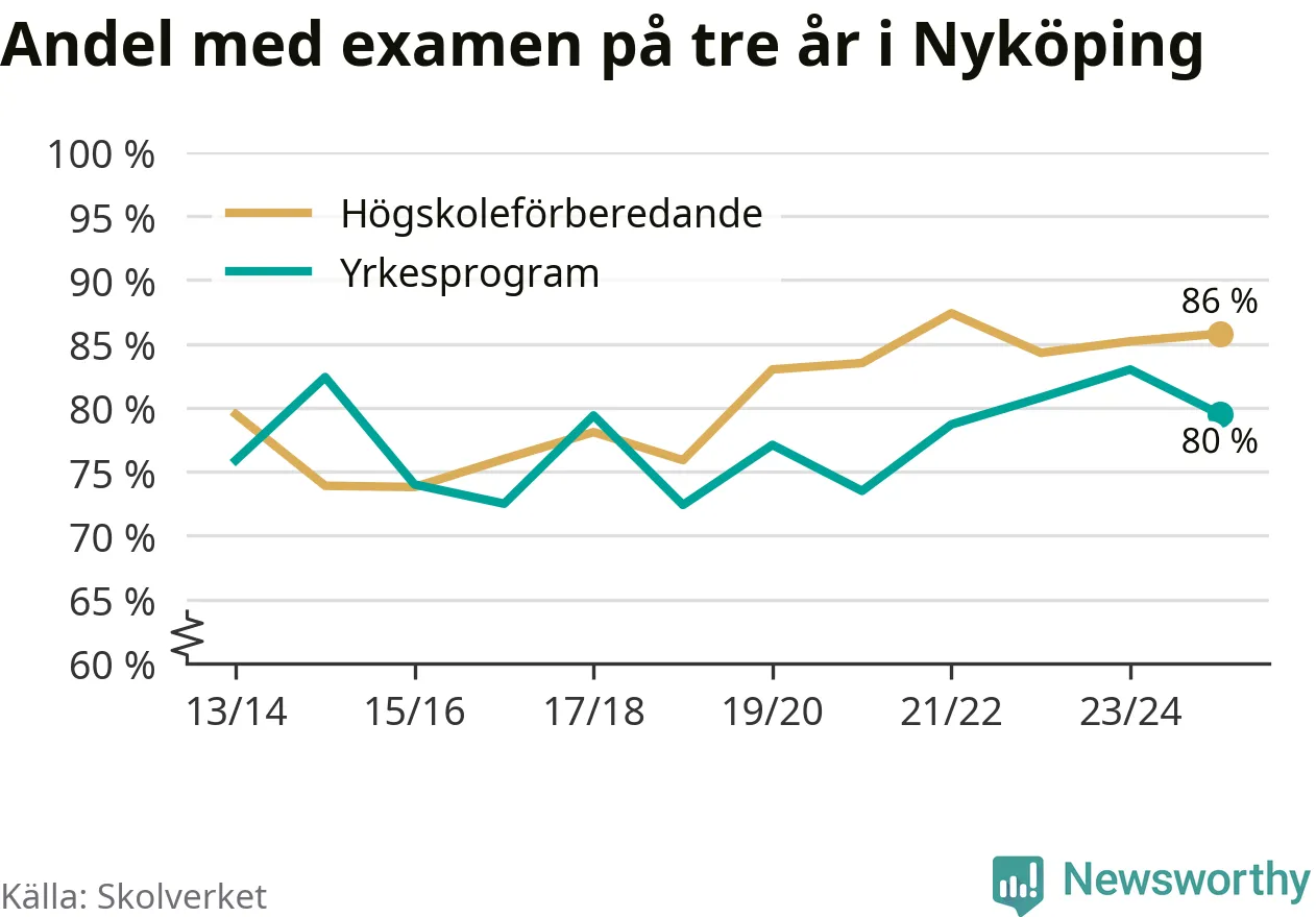 Medan andelen elever som klarade gymnasieexamen på yrkesprogram på tre år ökade i riket som helhet, minskade andelen i Nyköping något. Här är resultaten – skola för skola.