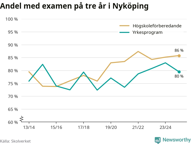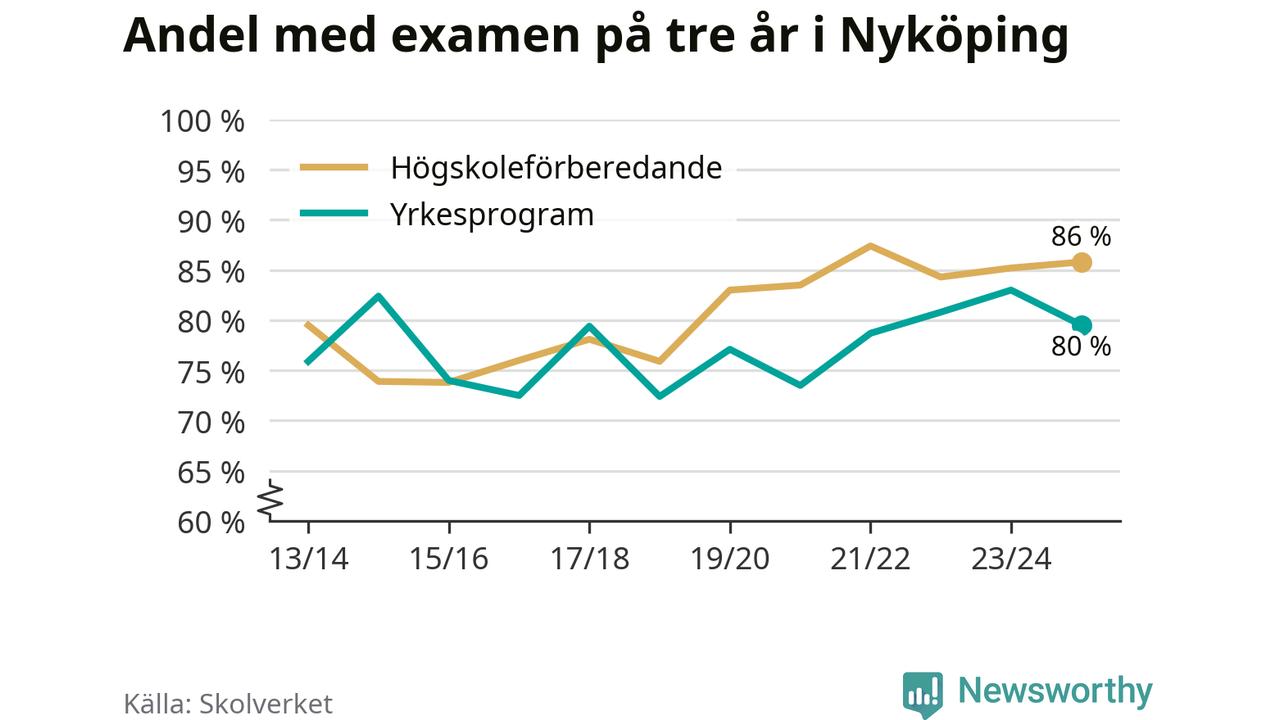 I riket som helhet ökade andelen som tog gymnasieexamen på tre år, både för högskoleförberedande och yrkesprogram. I våras var det 82,6 respektive 75,9 procent som klarade examen på tre år.