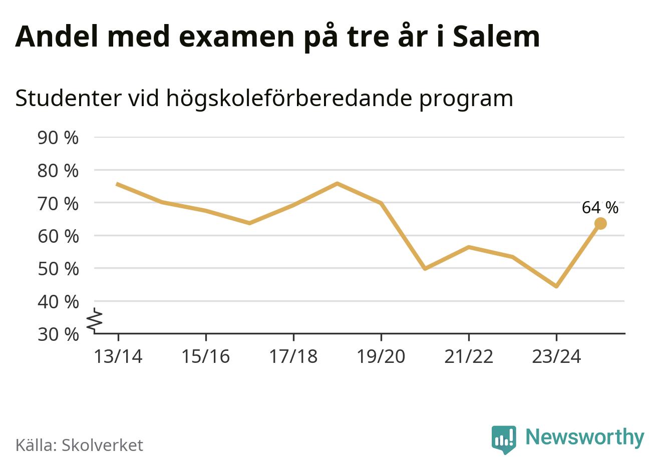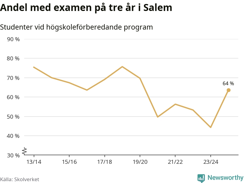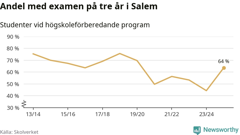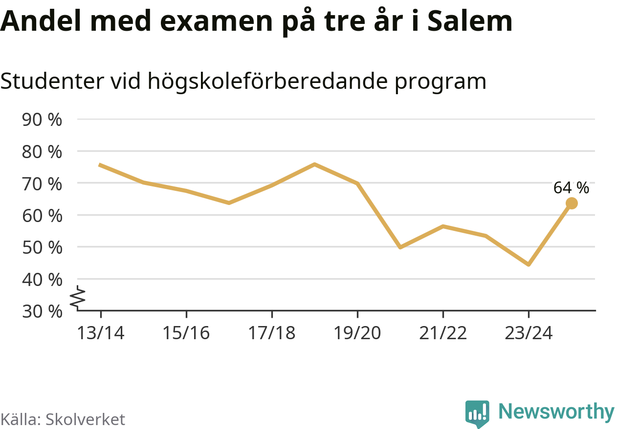 När eleverna på de högskoleförberedande programmen på Rönninge gymnasium i Salem sprang ut i våras hade 64 procent av dem klarat gymnasieexamen på tre år. Det är en ökning med 20 procentenheter jämfört med året innan och inte sedan kullen som tog studenten läsåret 2023/24 har andelen varit högre. För yrkesprogrammen på skolan saknas uppgift eftersom det rör sig om för få elever.