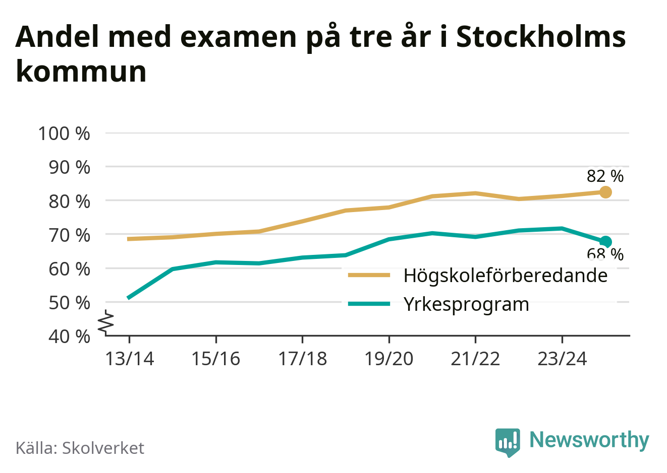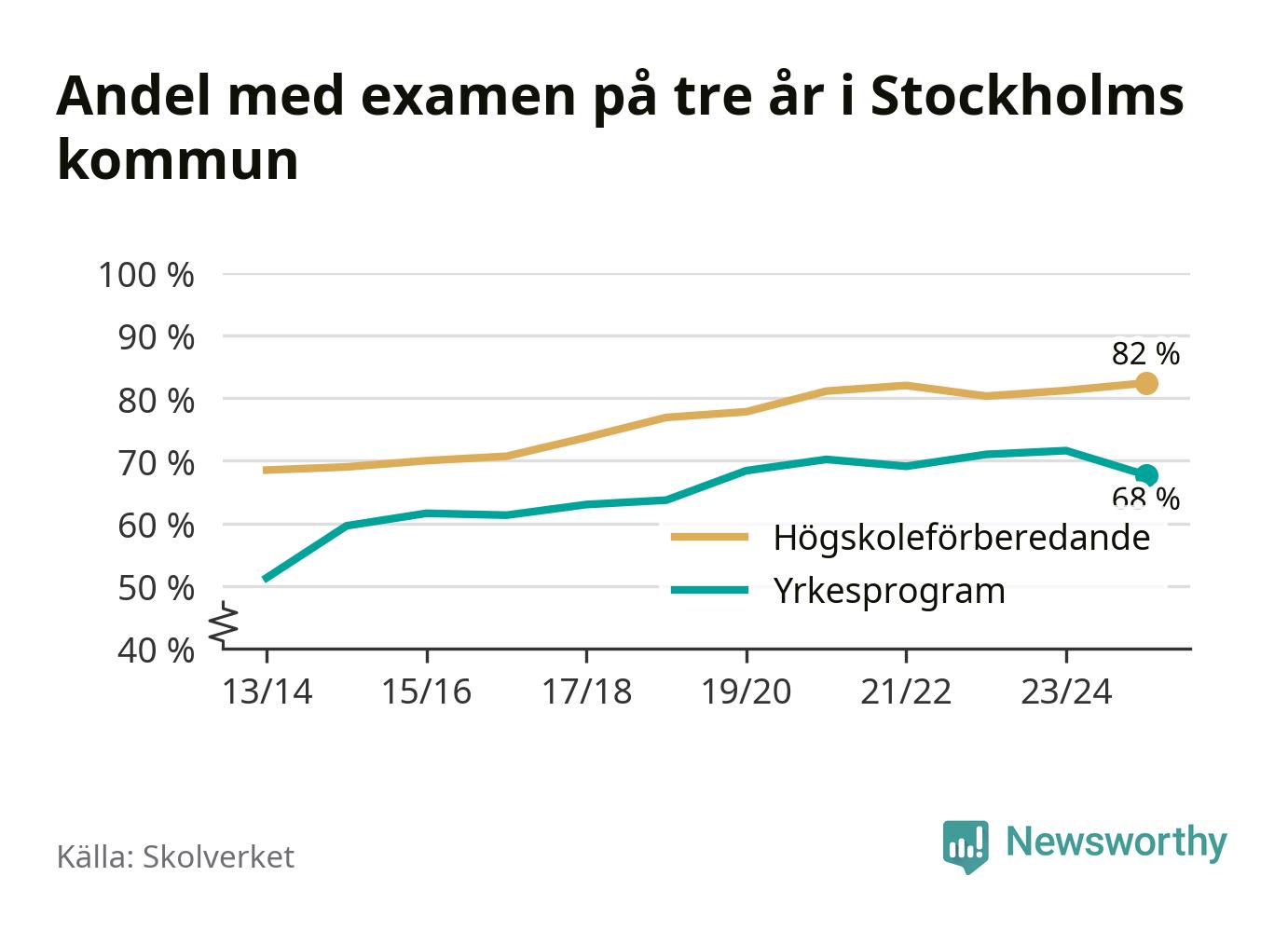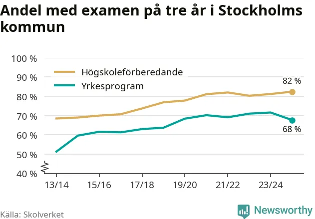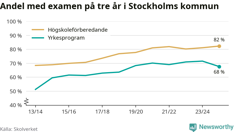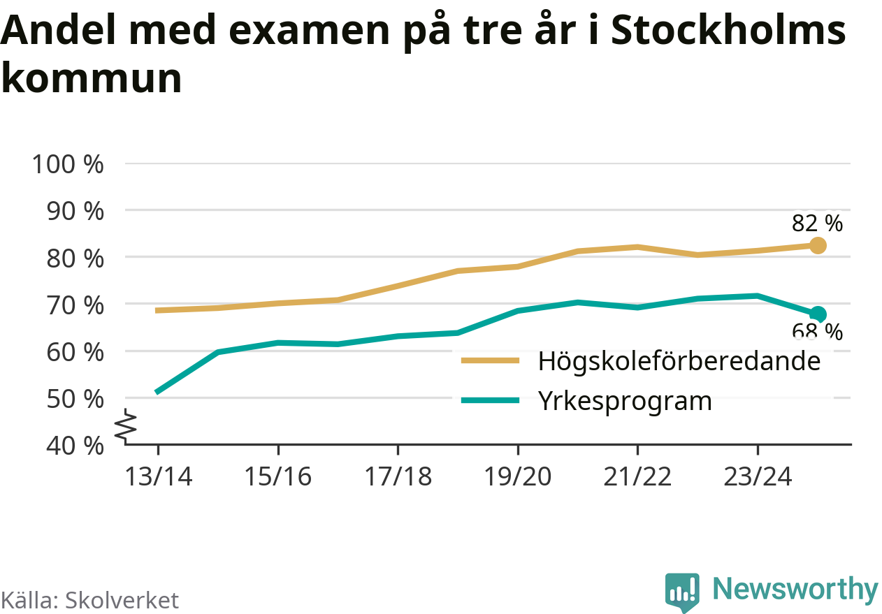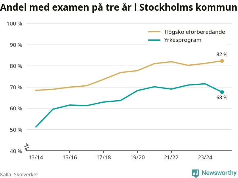 Bland deras kamrater på högskoleförberedande program hade 82 procent klarat examen på tre år – vilket är en procentenhet mer än året innan. Det är den högsta andelen sedan åtminstone läsåret 2013/14.