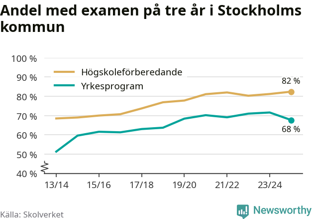 När eleverna på de yrkesförberedande programmen i Stockholms kommun sprang ut i våras hade 68 procent klarat gymnasieexamen på tre år. Det är fyra procentenheter färre än året innan och inte sedan kullen som tog studenten läsåret 2018/19 har andelen varit lägre.
