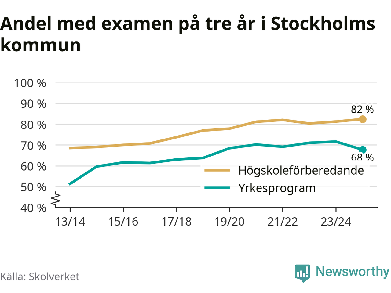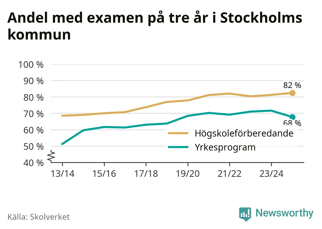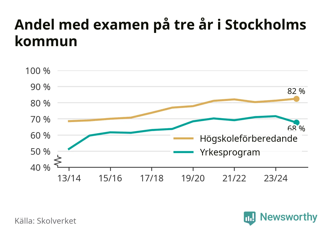 Enligt Skolverket är den främsta anledningen att andelen elever som har avbrutit eller förlängt sina gymnasiestudier minskat. Samtidigt har fler elever på högskoleförberedande program blivit godkända på gymnasiearbetet.