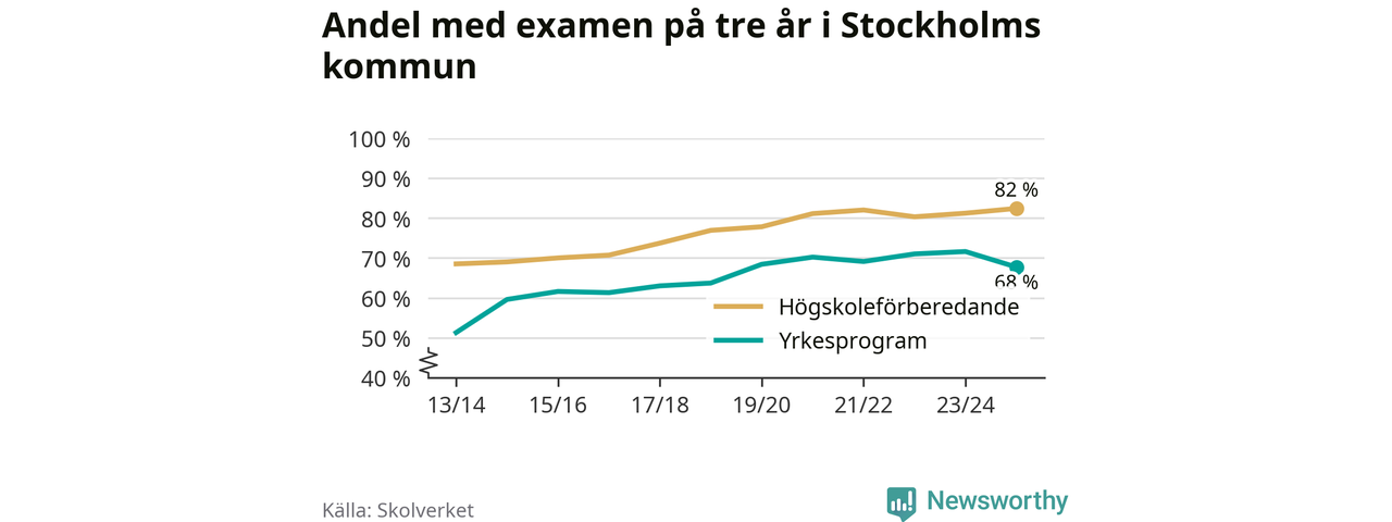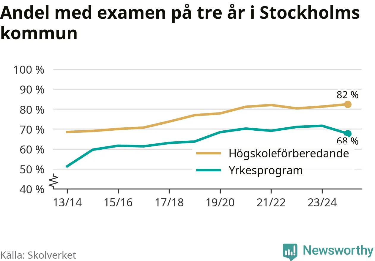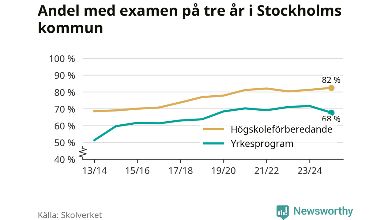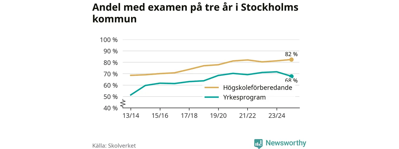 Inte sedan åtminstone läsåret 2013/14 har andelen elever som klarat gymnasieexamen på högskoleförberedande program varit högre i Stockholms kommun. Det visar Skolverkets senaste statistik.